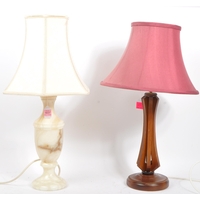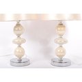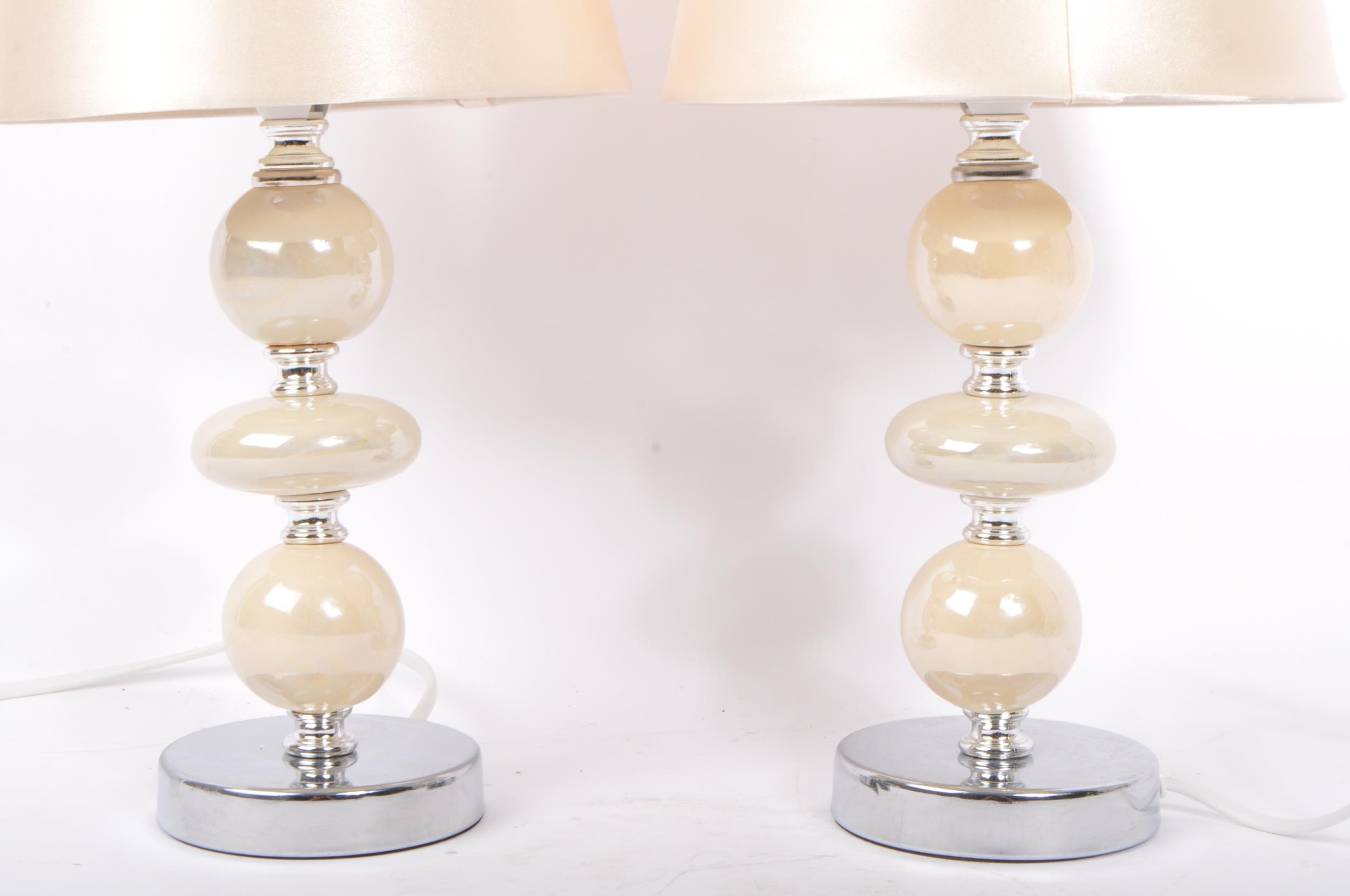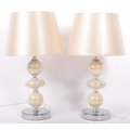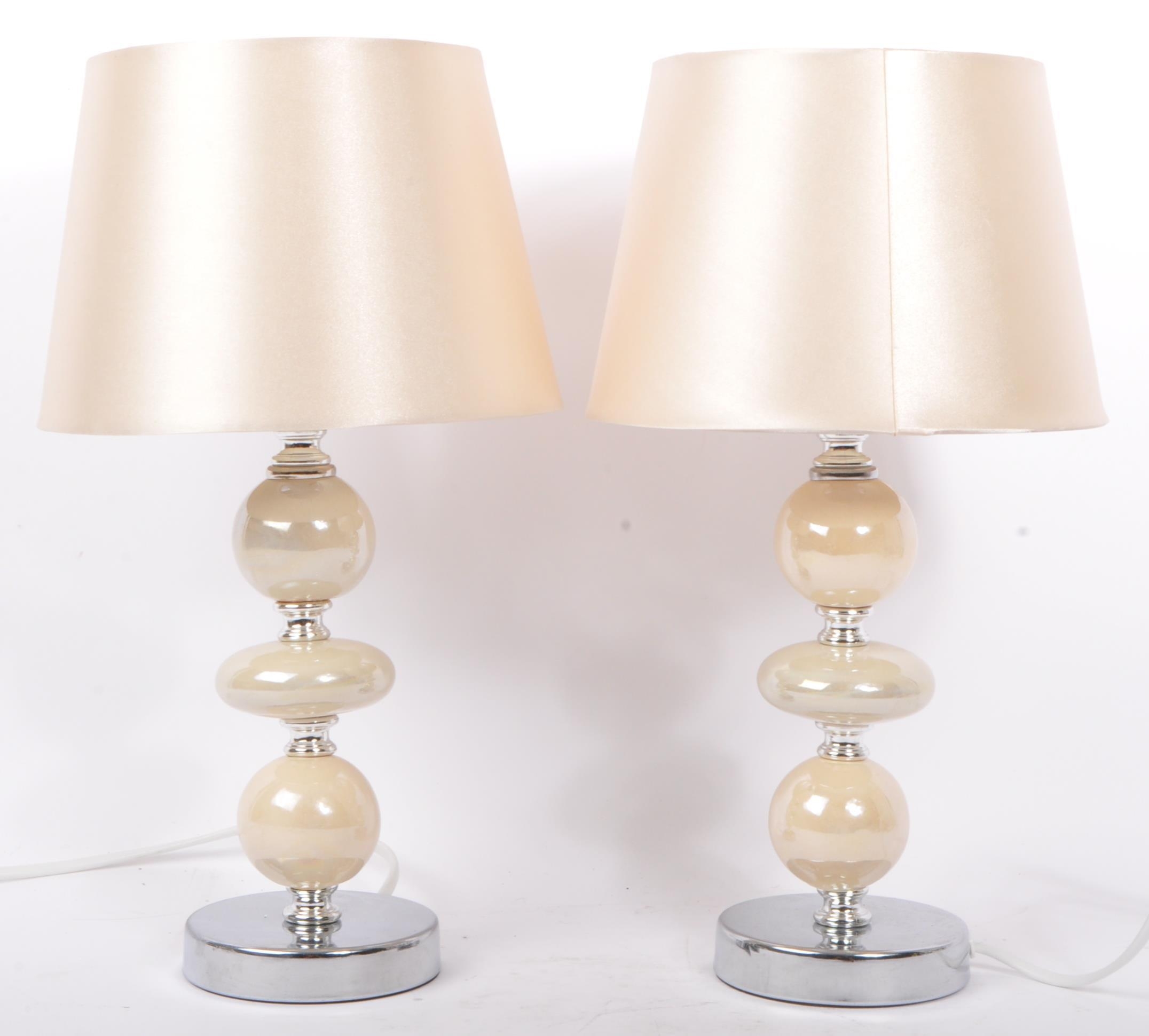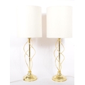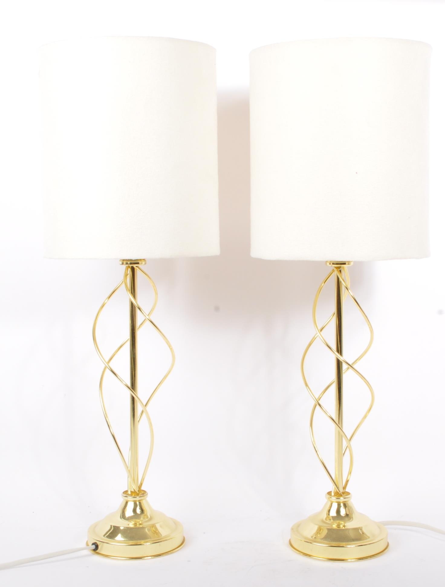 Two pairs of contemporary bedside / table lamps. One pair having brass effect helix decorations surrounding a central stem, alongside another pair of contemporary lamps. Largest measures approx. 54 cm tall.