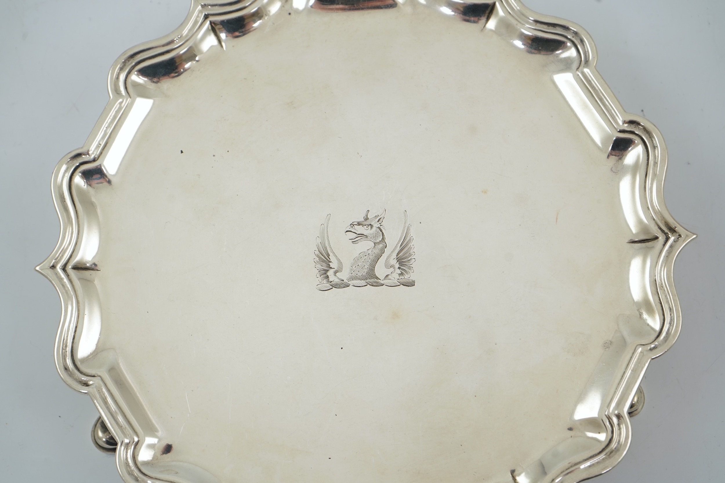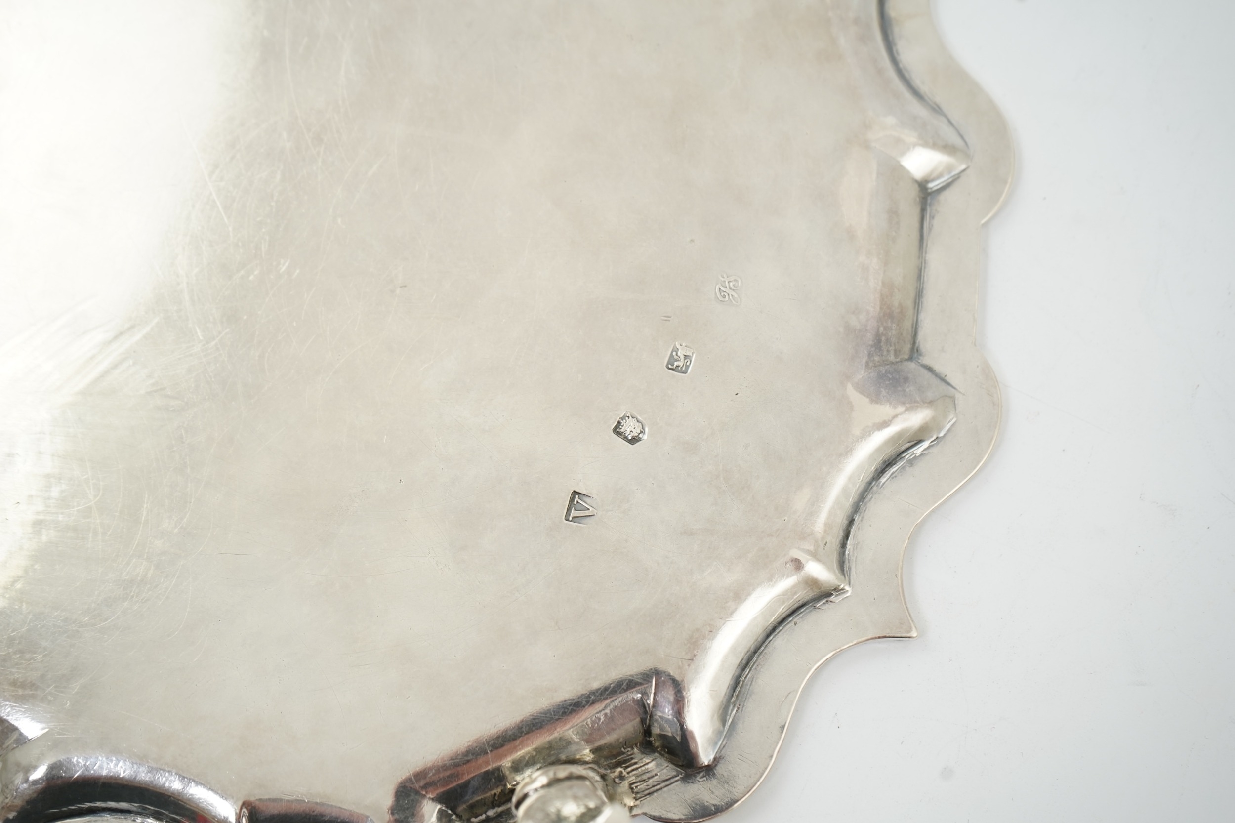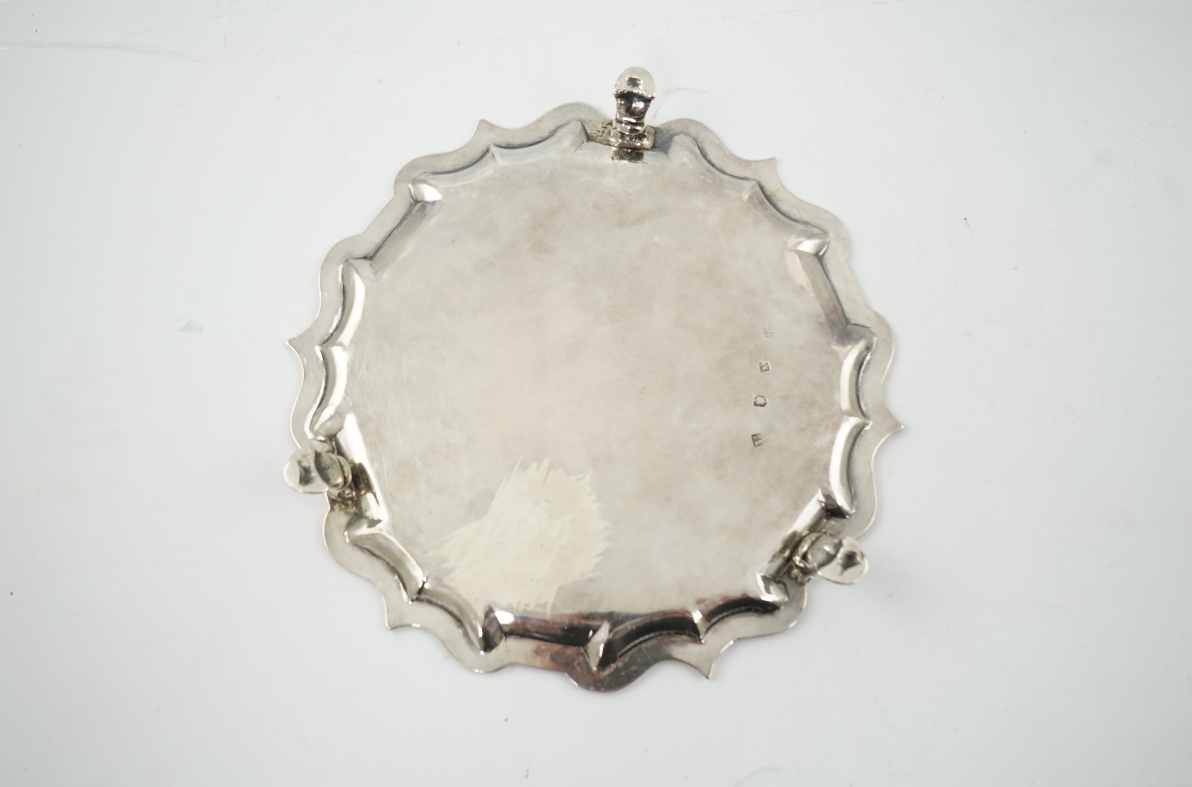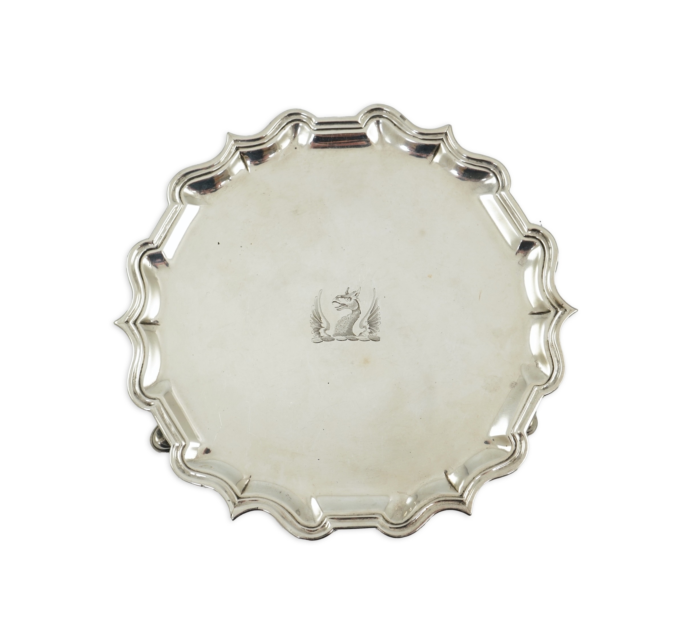 A George II silver salver, by Joseph Sanders, of shaped circular form, with engraved crest, on three hoof feet, London, 1735, 22cm, 14.9oz.
