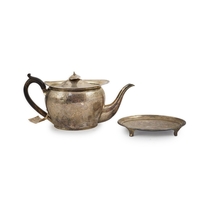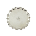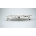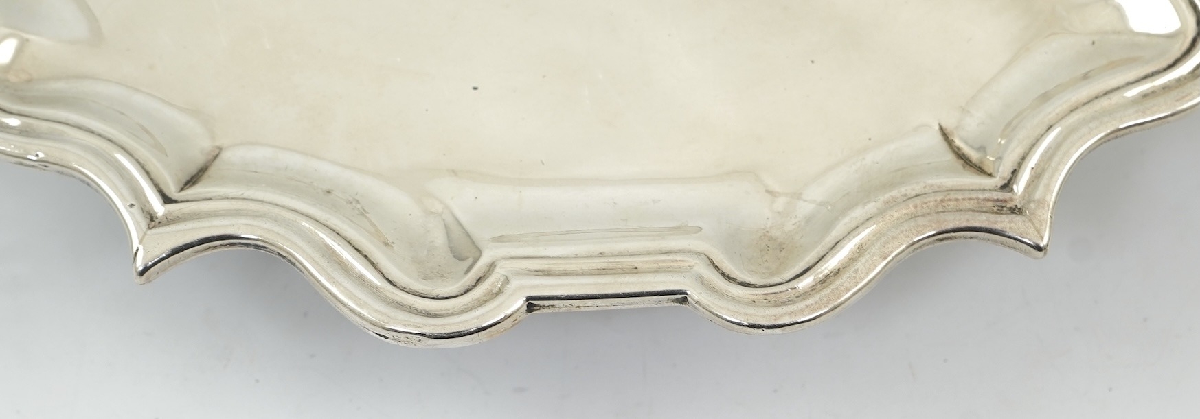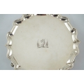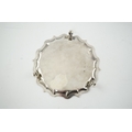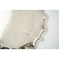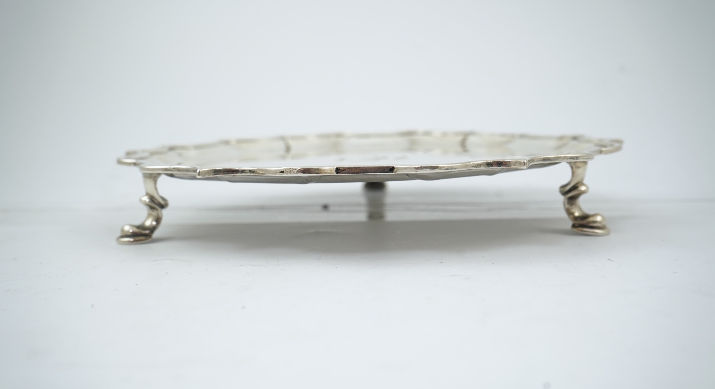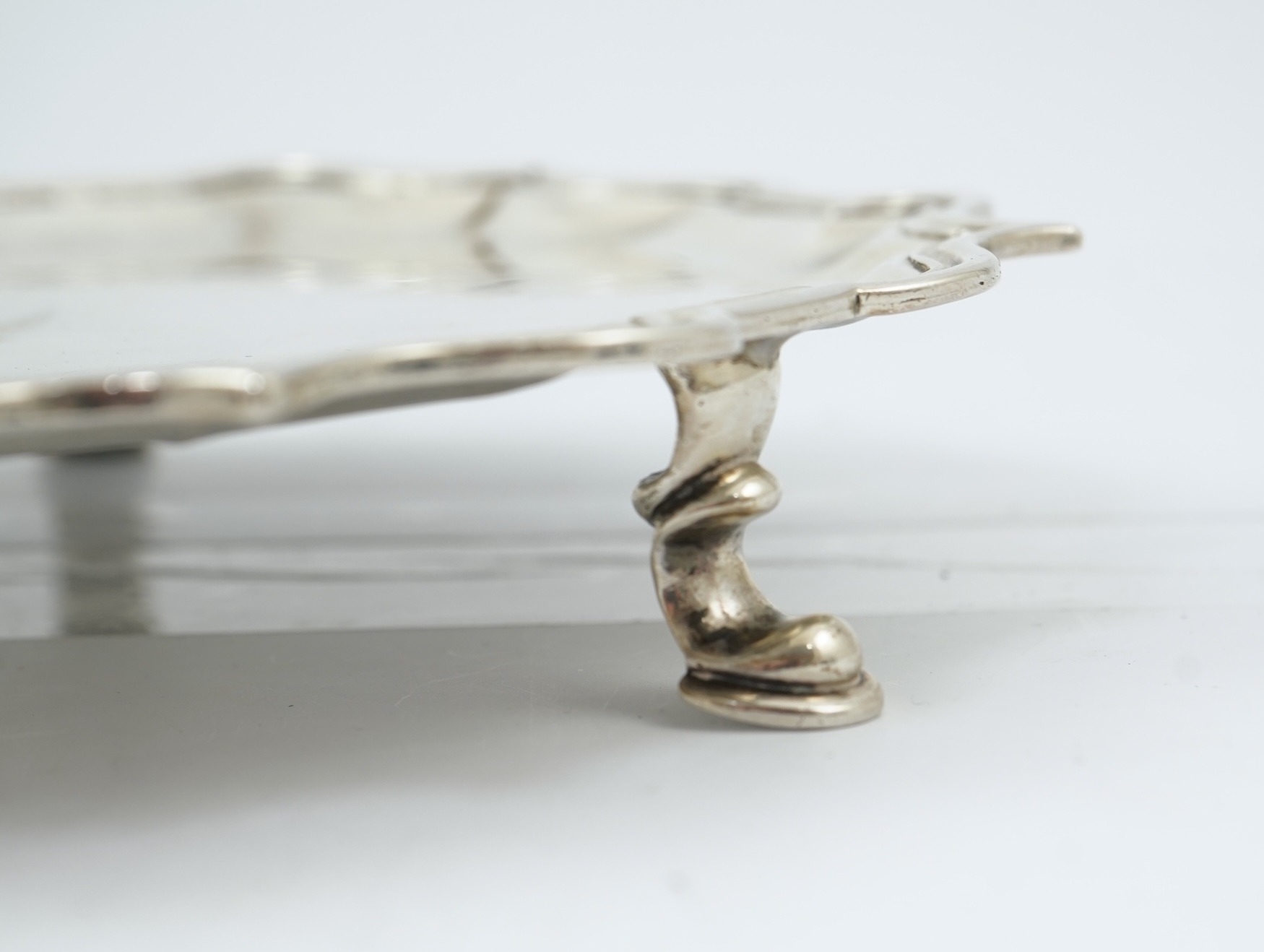 A George II silver salver, by Joseph Sanders, of shaped circular form, with engraved crest, on three hoof feet, London, 1735, 22cm, 14.9oz.