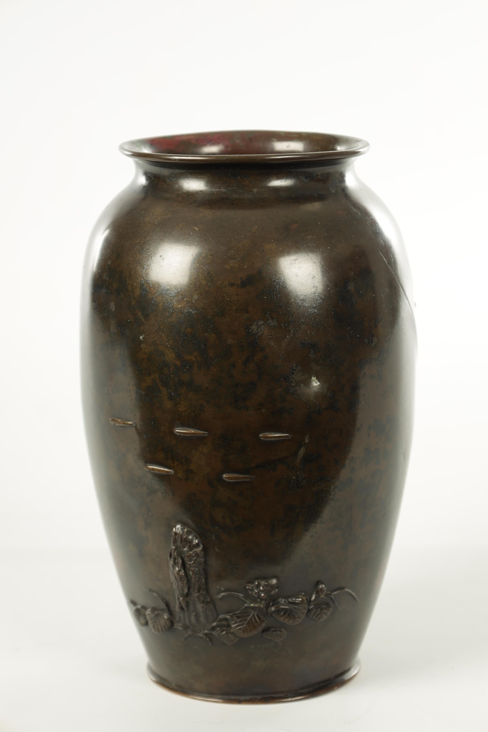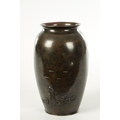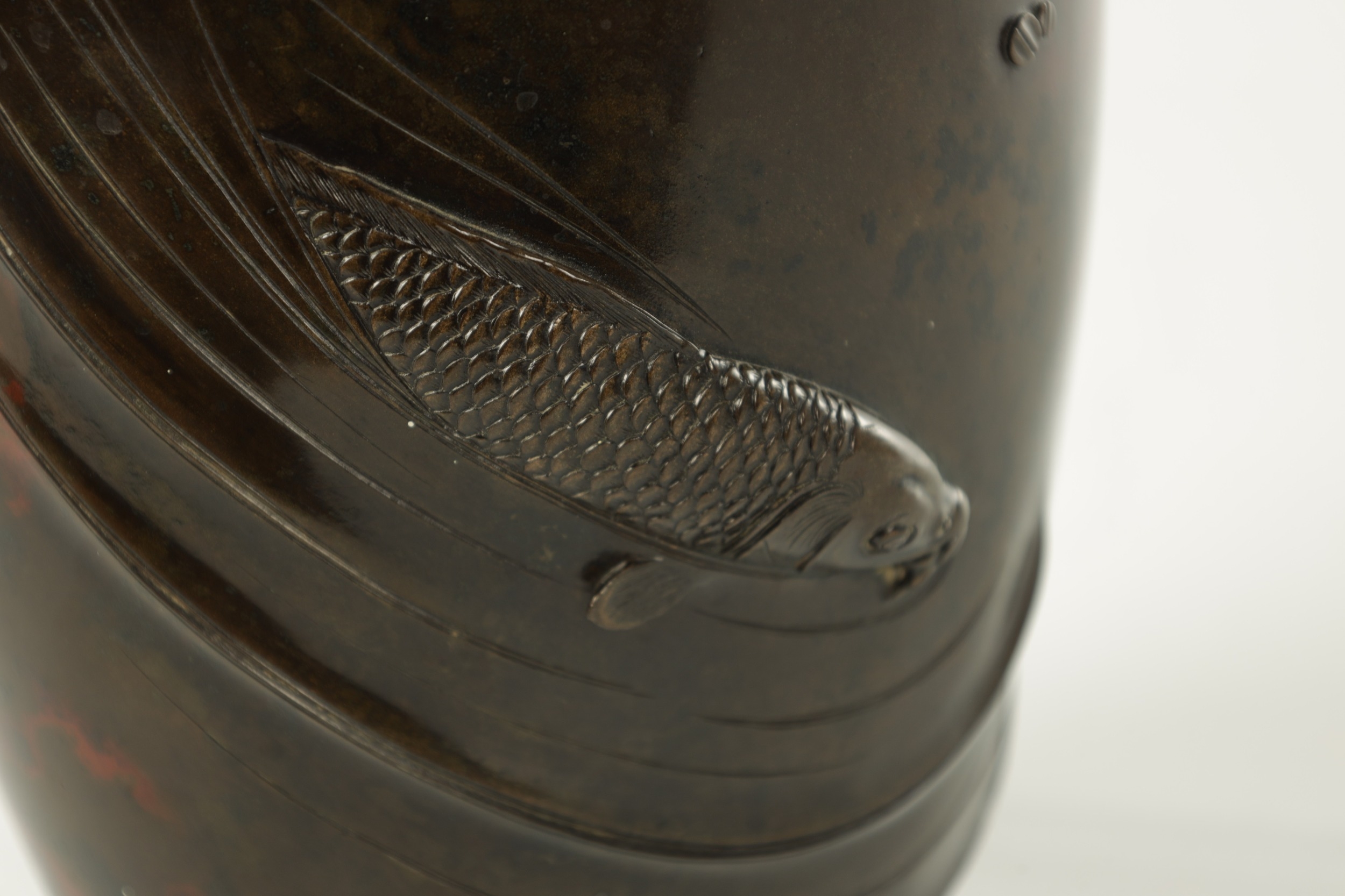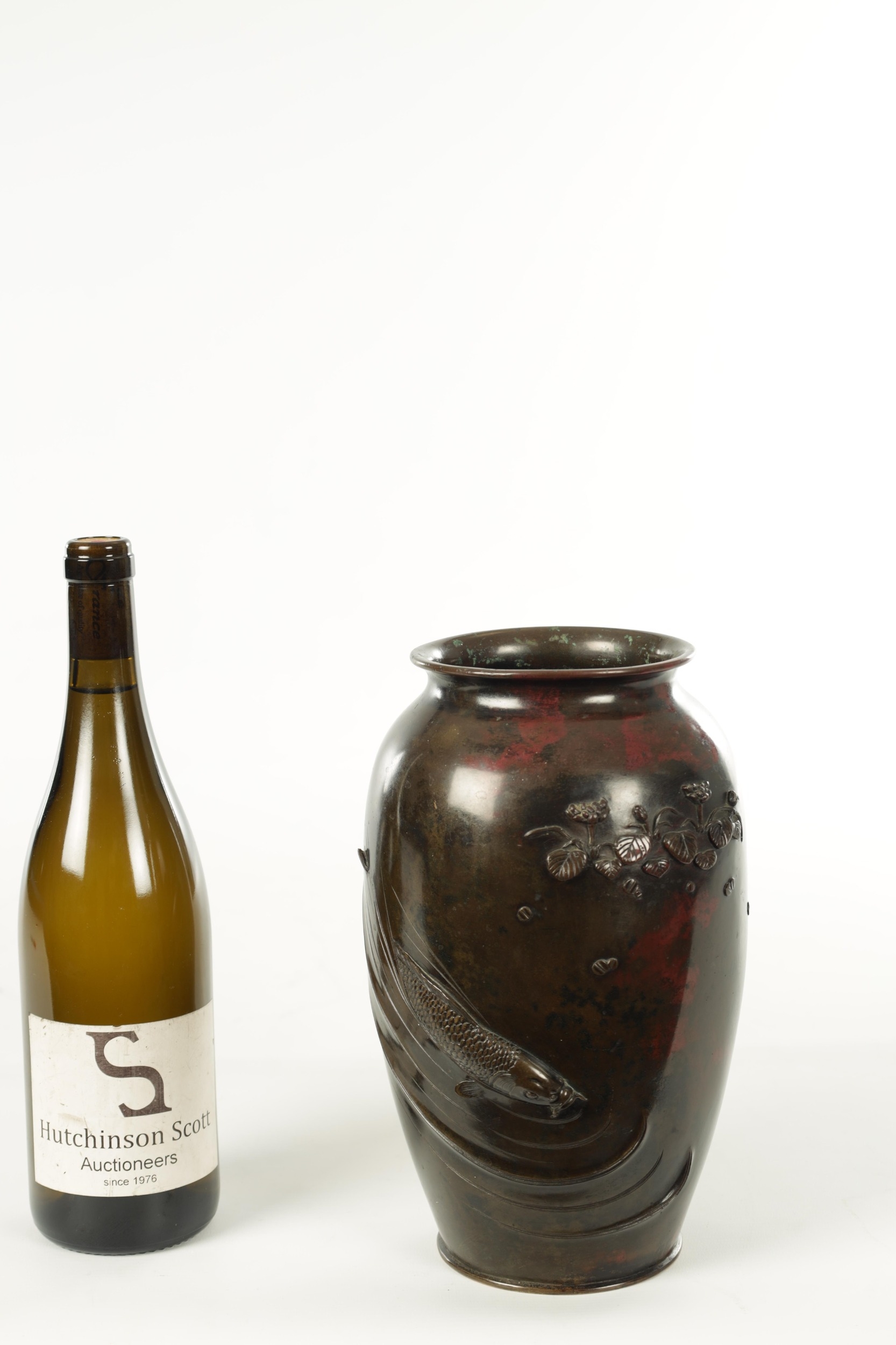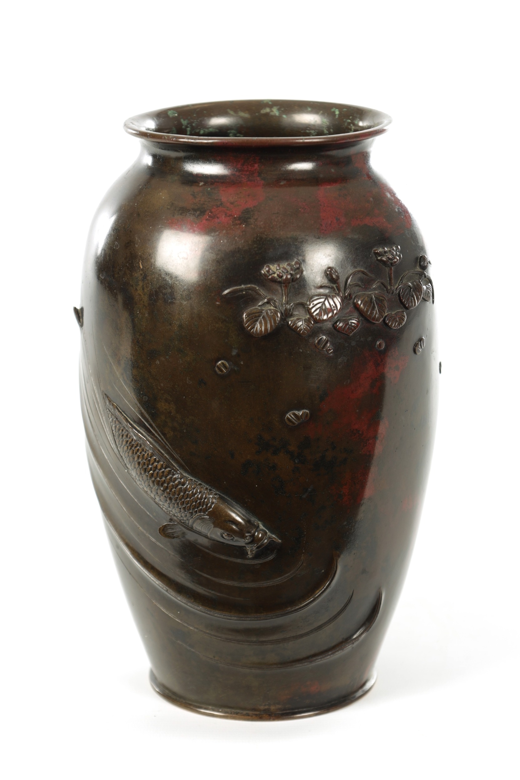 A JAPANESE MEIJI PERIOD BRONZE VASE of ovoid form with a short waisted neck and everted rim, cast in high relief with a carp swimming amongst swirling water beneath flowering water plants, the dark brown patination with reddish undertones, raised on a narrow circular foot. (25cm high)