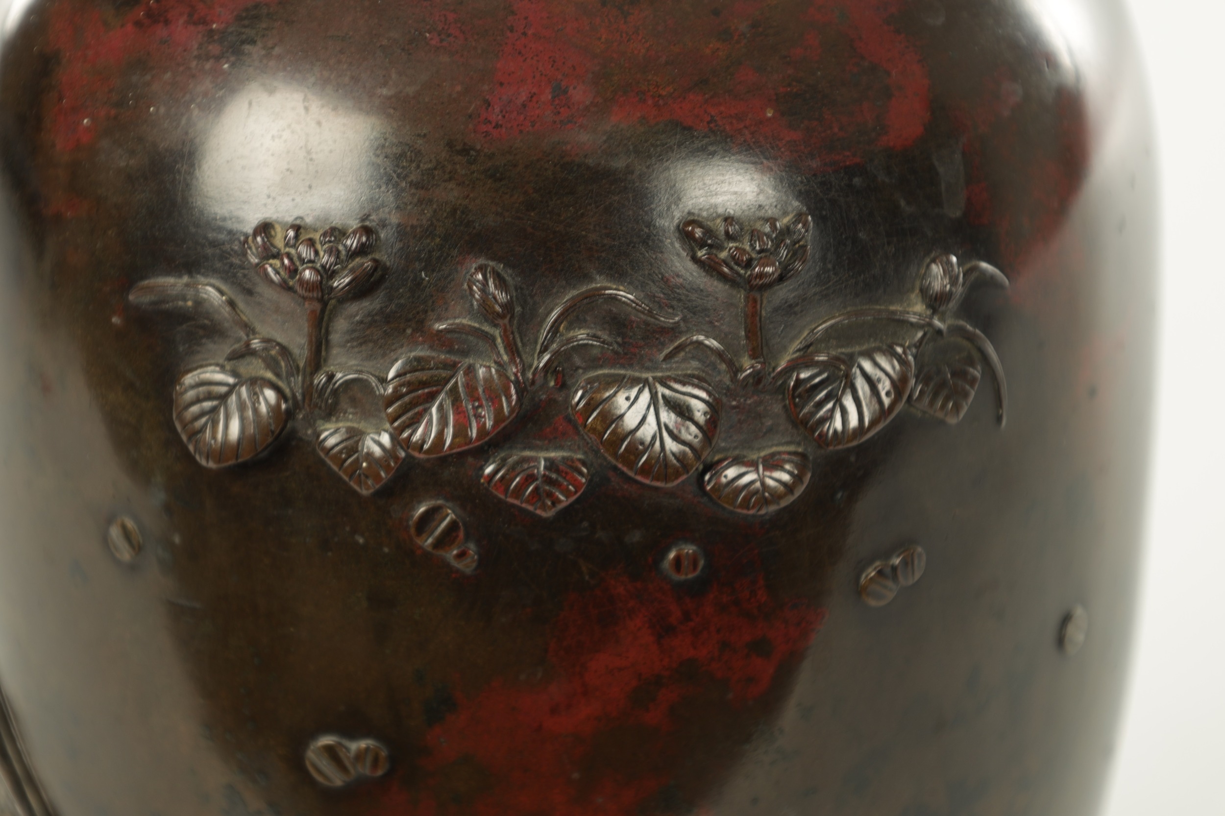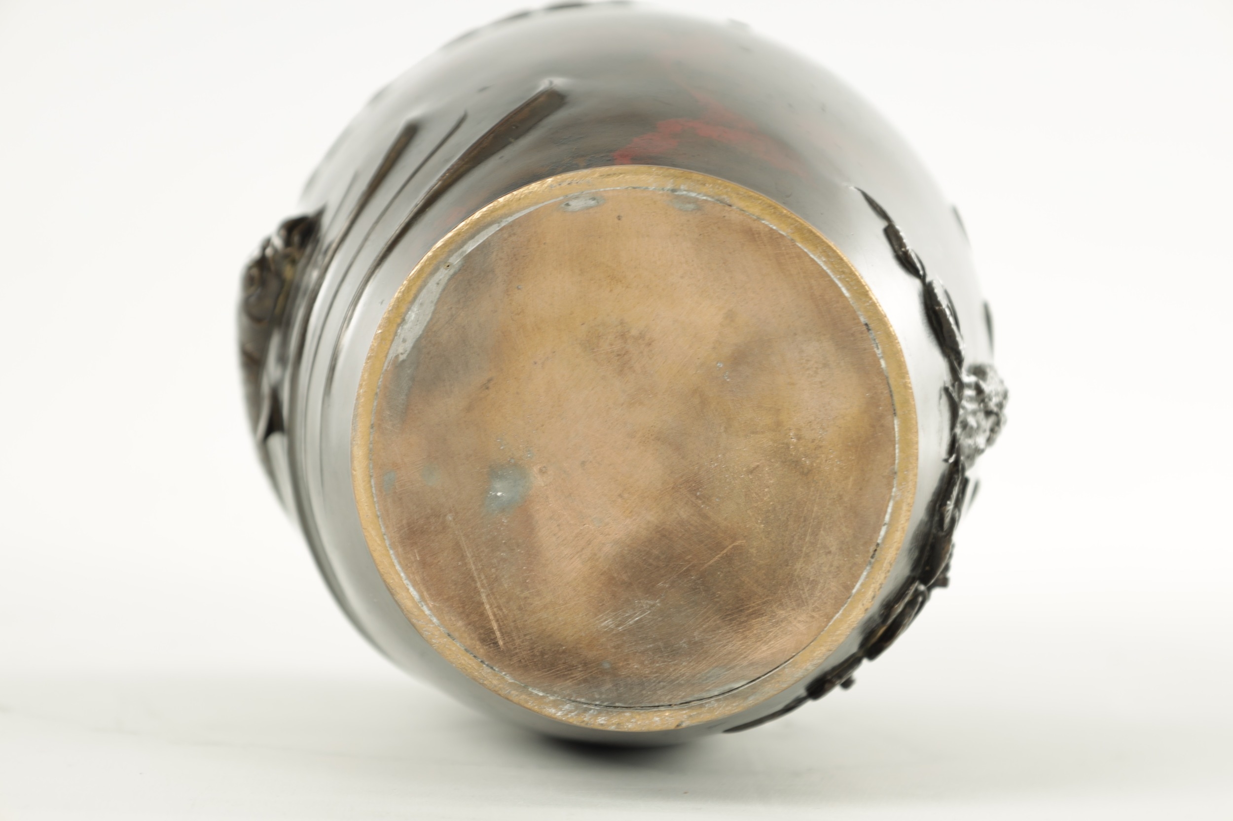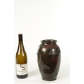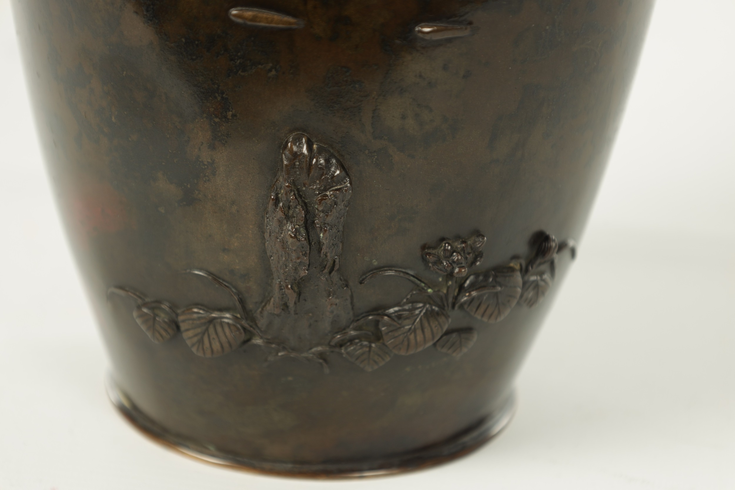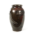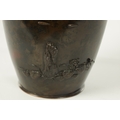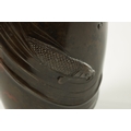 A JAPANESE MEIJI PERIOD BRONZE VASE of ovoid form with a short waisted neck and everted rim, cast in high relief with a carp swimming amongst swirling water beneath flowering water plants, the dark brown patination with reddish undertones, raised on a narrow circular foot. (25cm high)