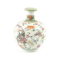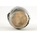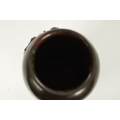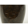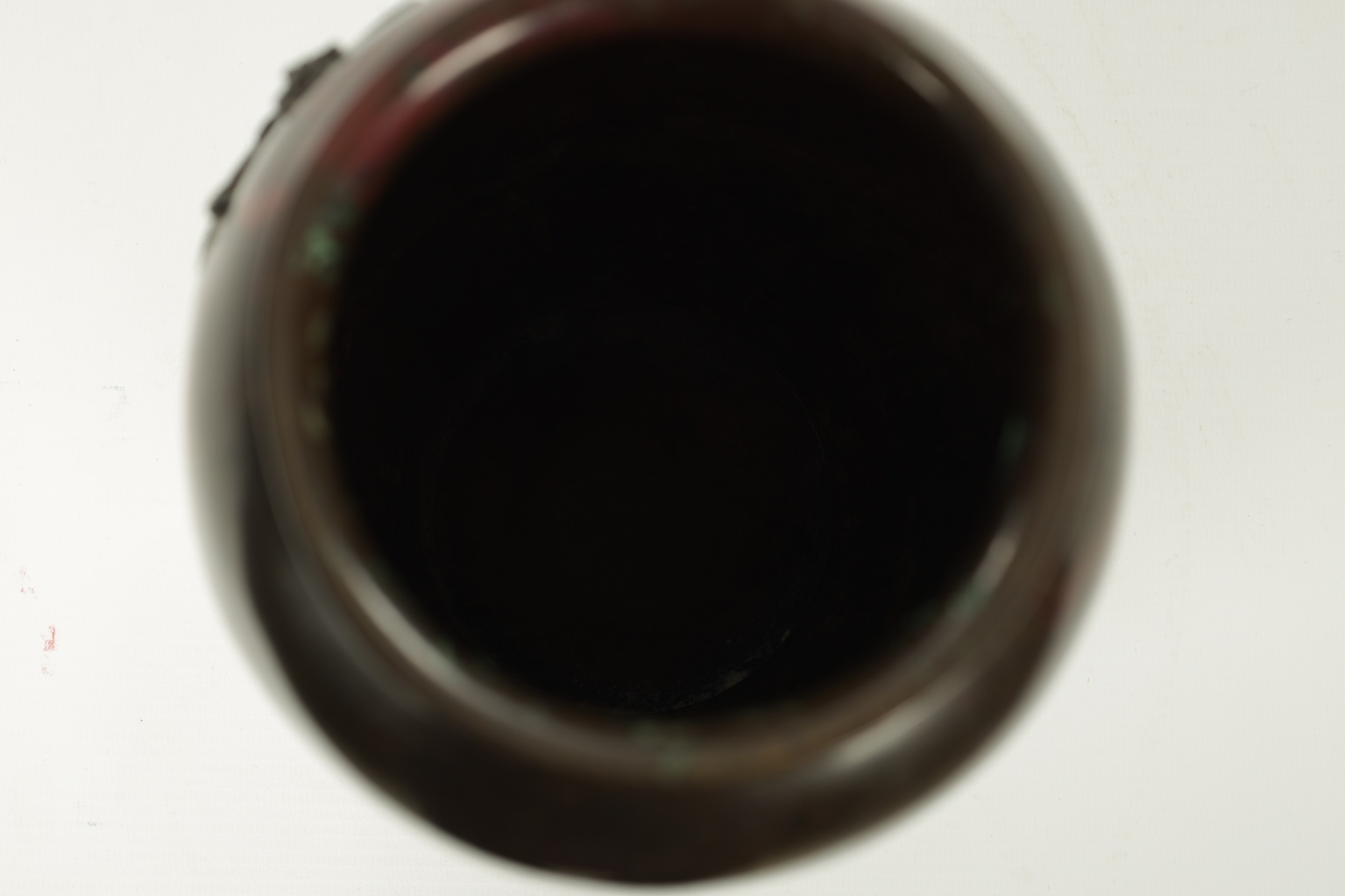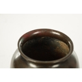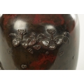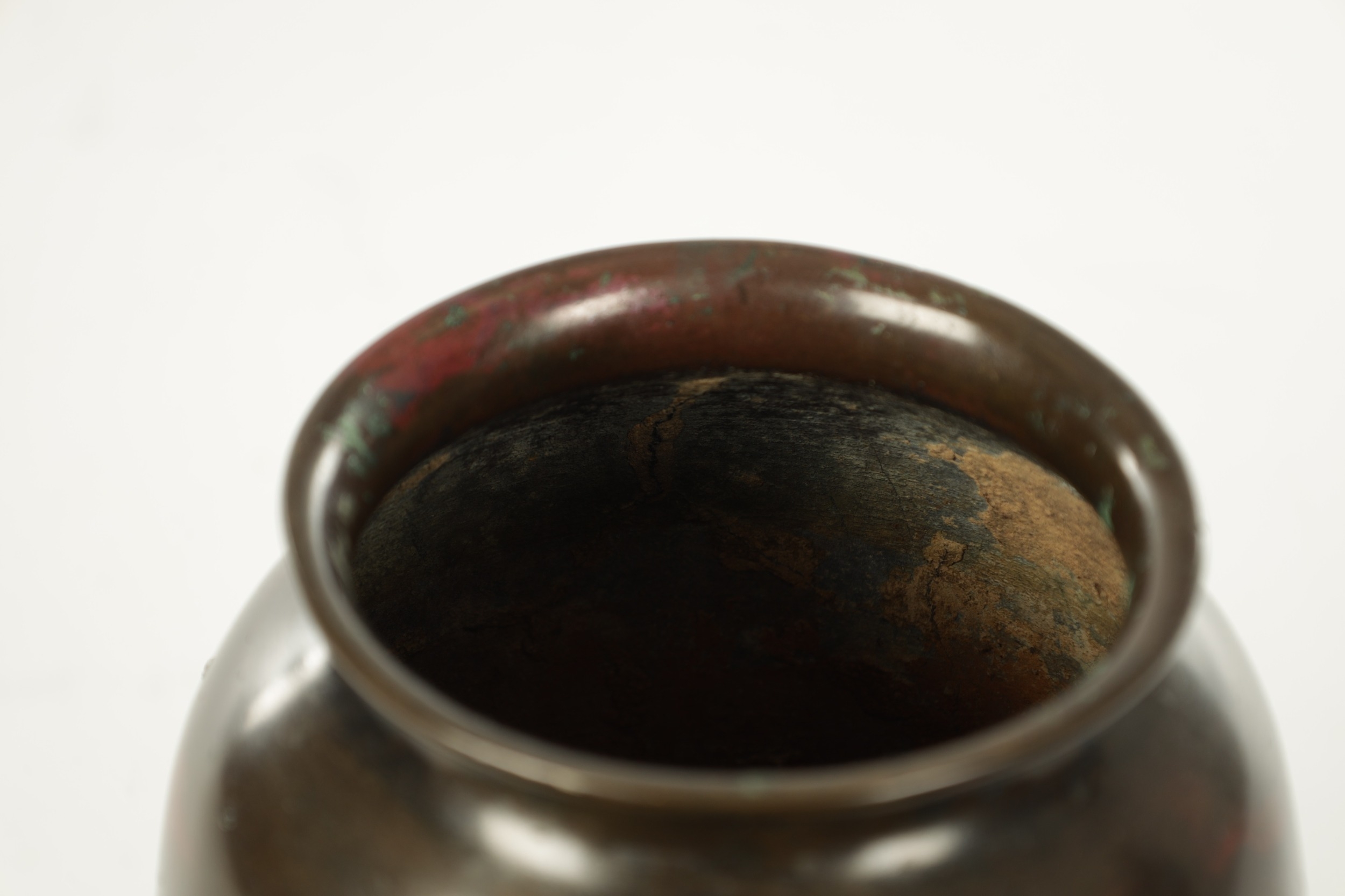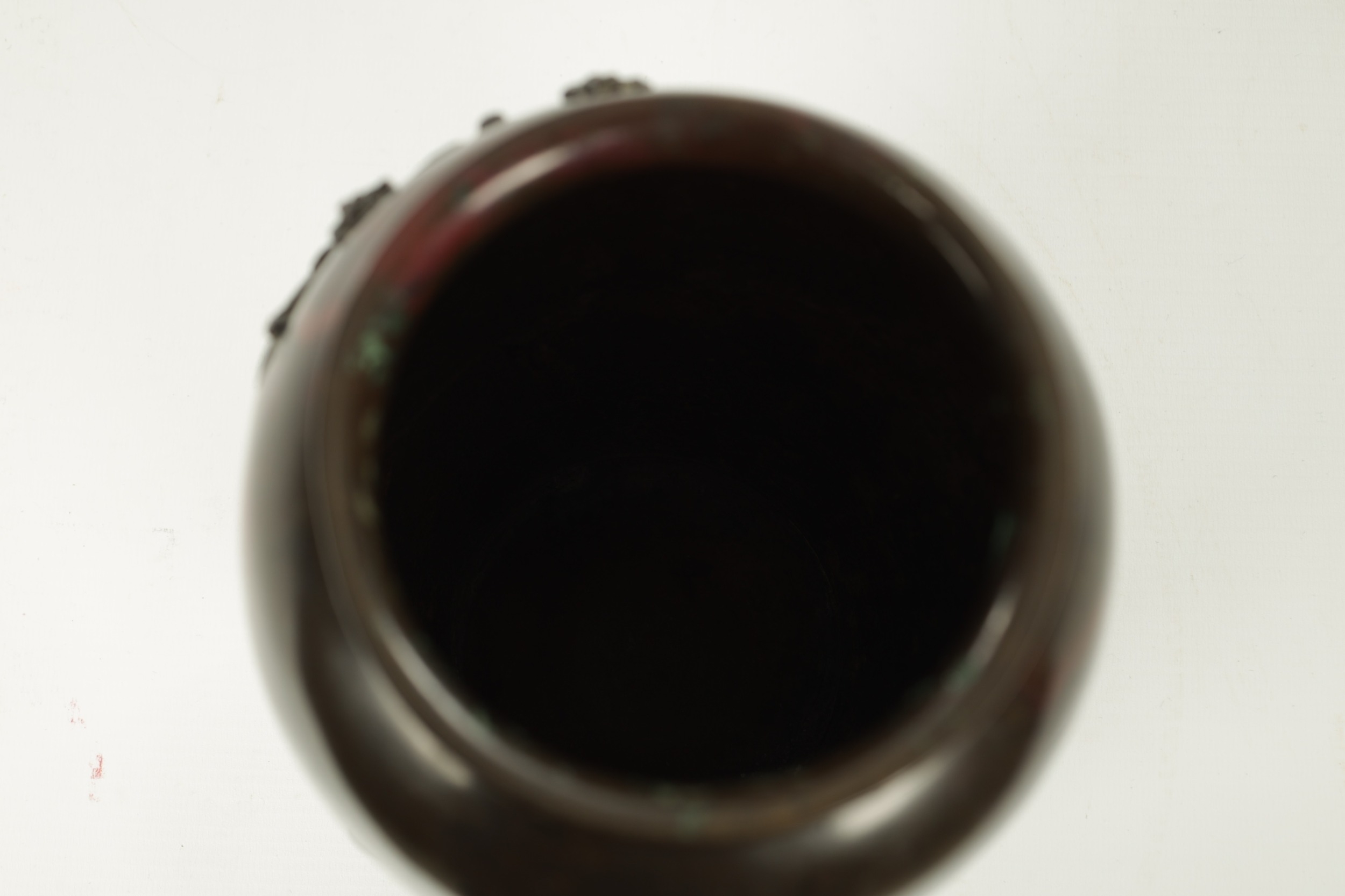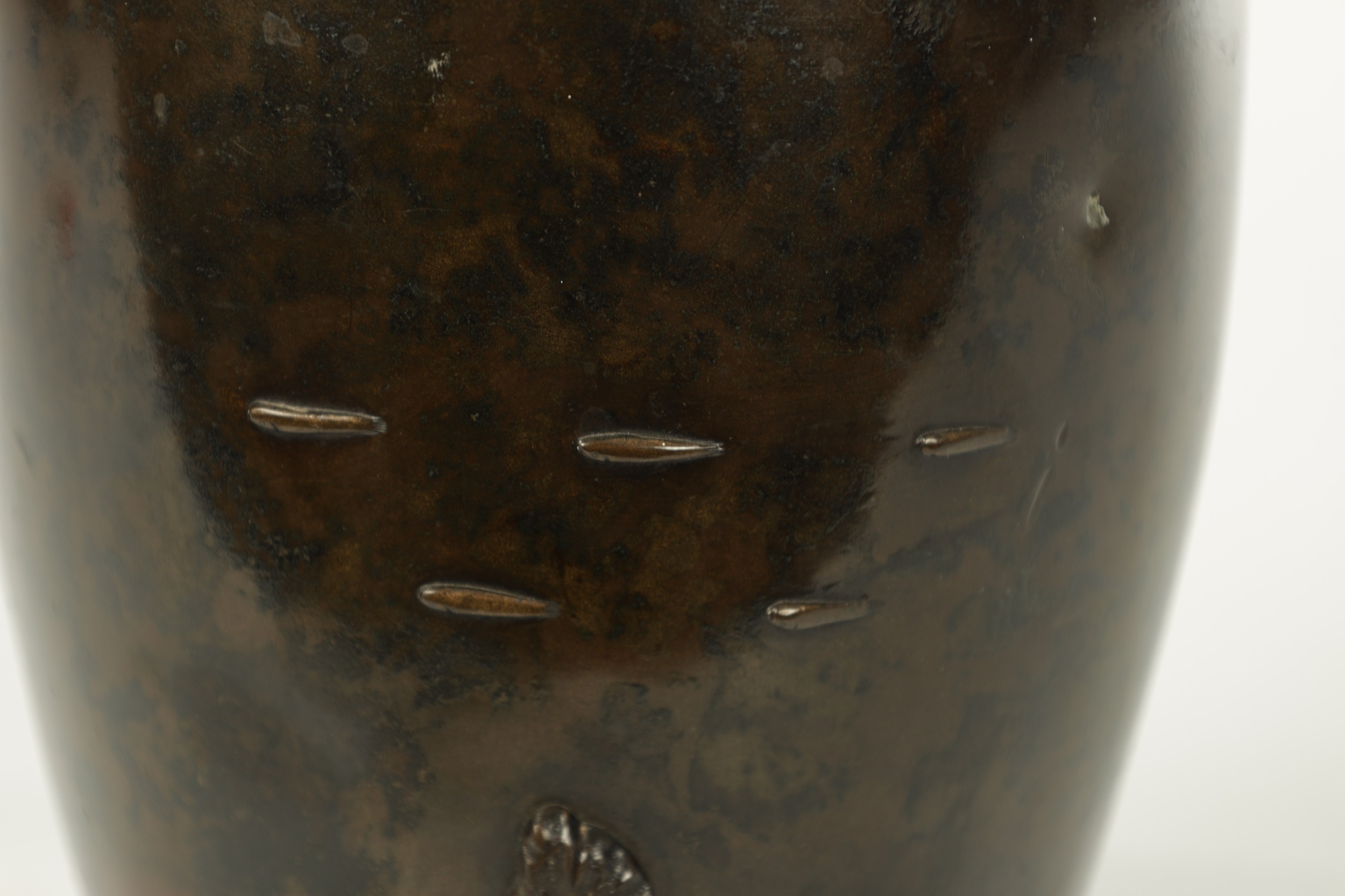 A JAPANESE MEIJI PERIOD BRONZE VASE of ovoid form with a short waisted neck and everted rim, cast in high relief with a carp swimming amongst swirling water beneath flowering water plants, the dark brown patination with reddish undertones, raised on a narrow circular foot. (25cm high)