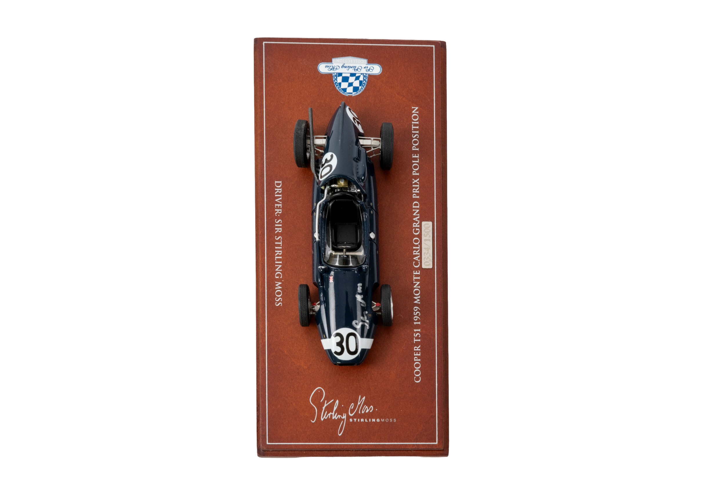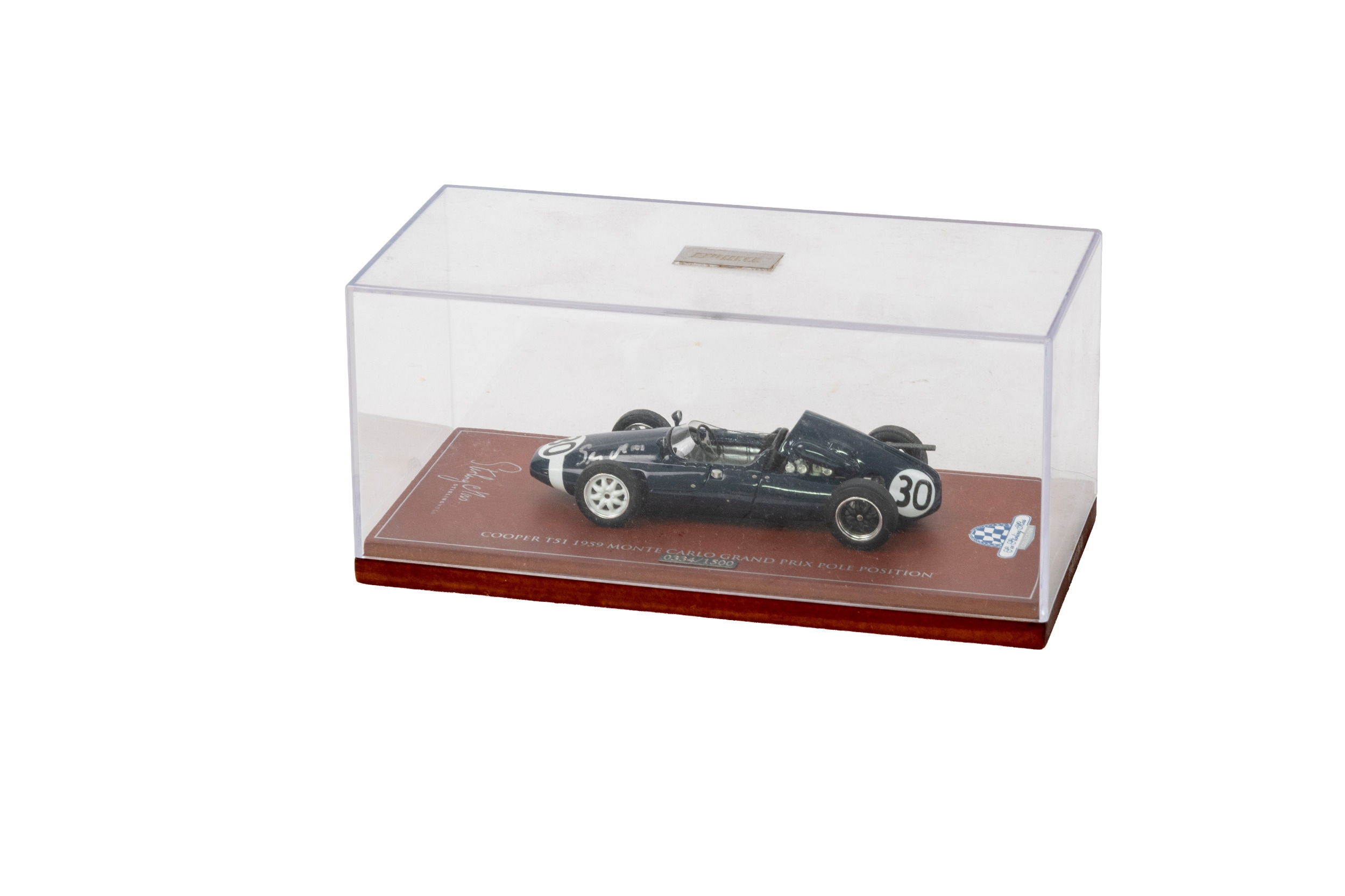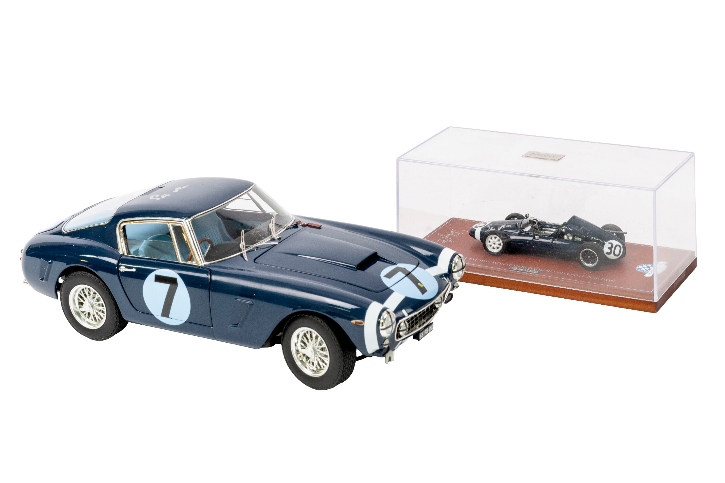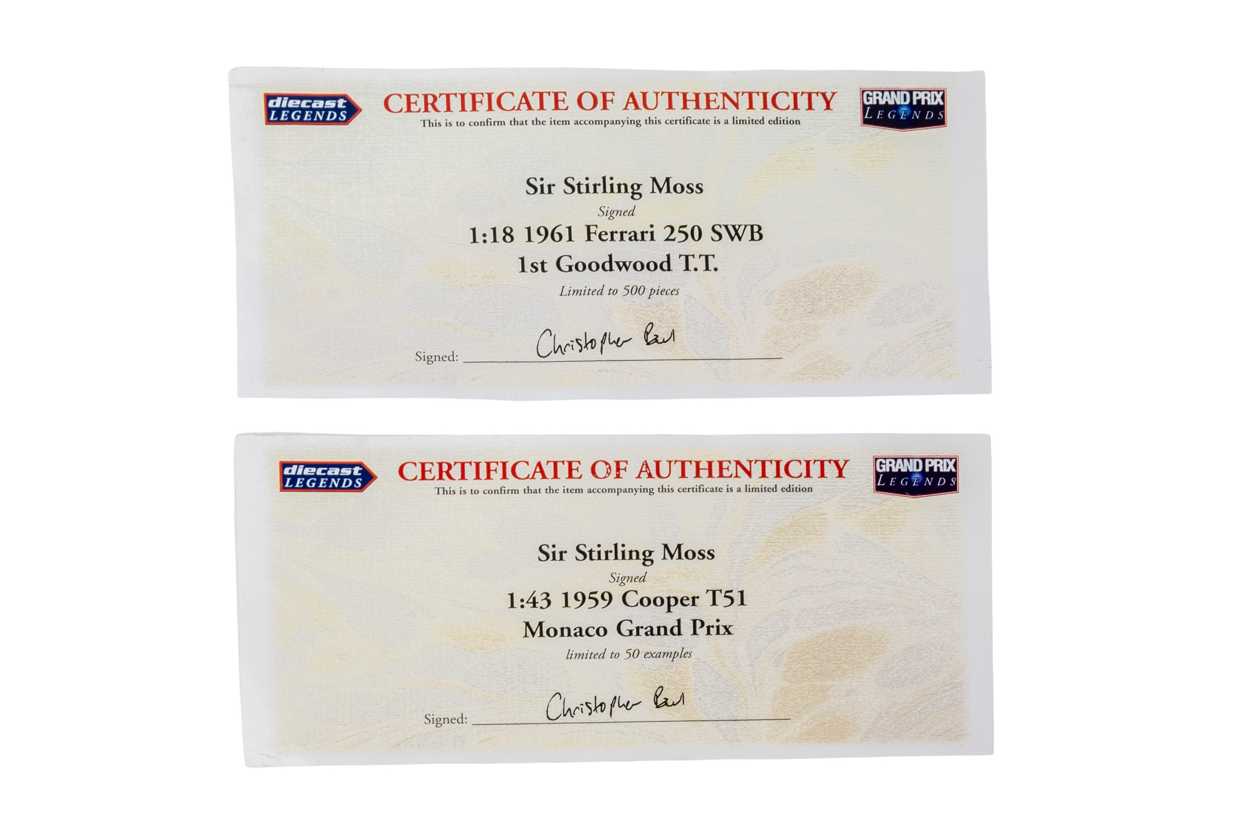 Hotwheels 1/18th scale Ferrari 250 GT SWB 1st Goodwood Tourist Trophy signed by Stirling Moss, together with a Biante Sir Stirling Moss Collection 1/24th scale Cooper T51 1959 Monte Carlo Grand Prix Pole Position model No. 0334/1500 signed by Stirling Moss , both with certificates of authenticity (2)