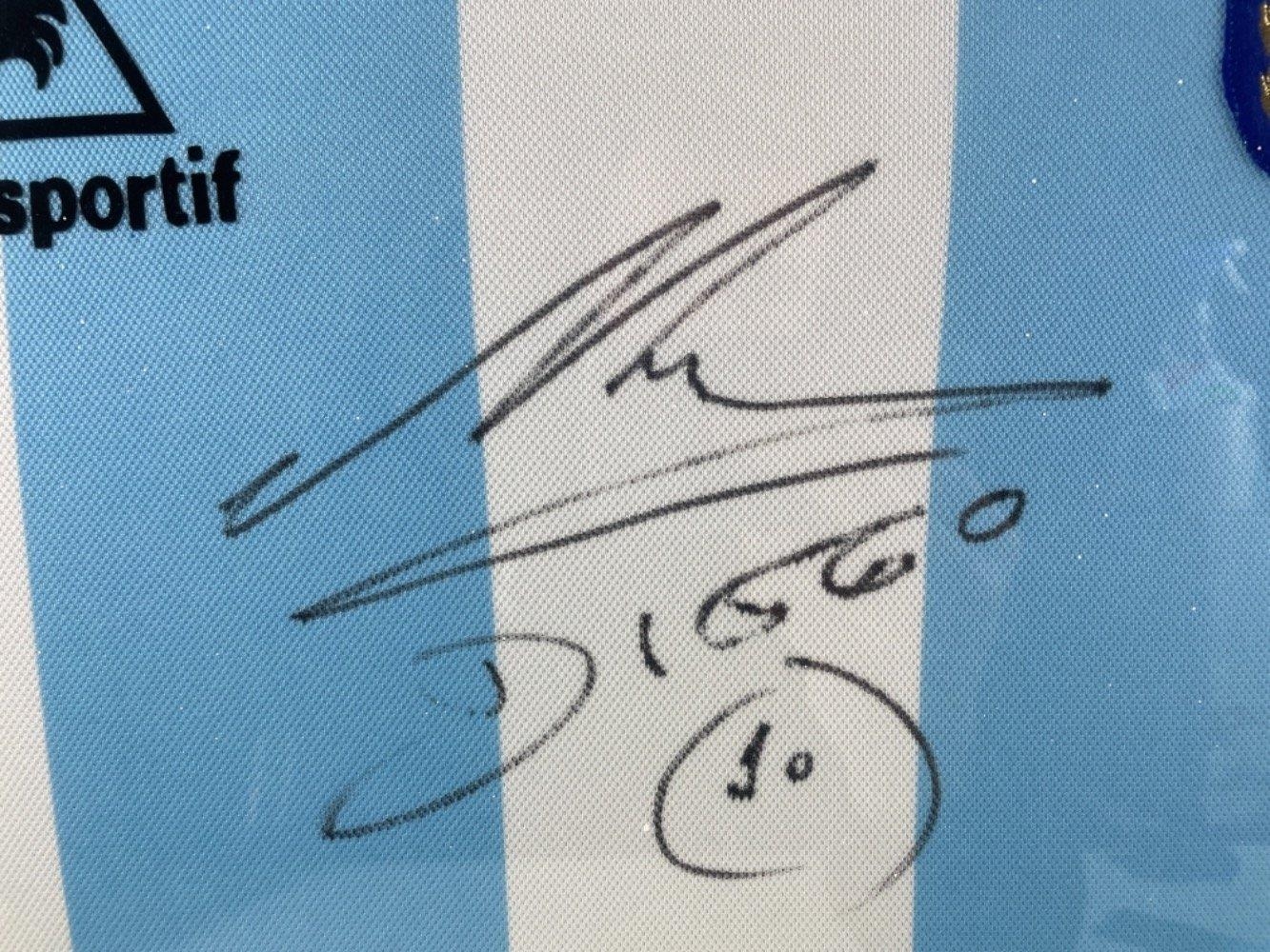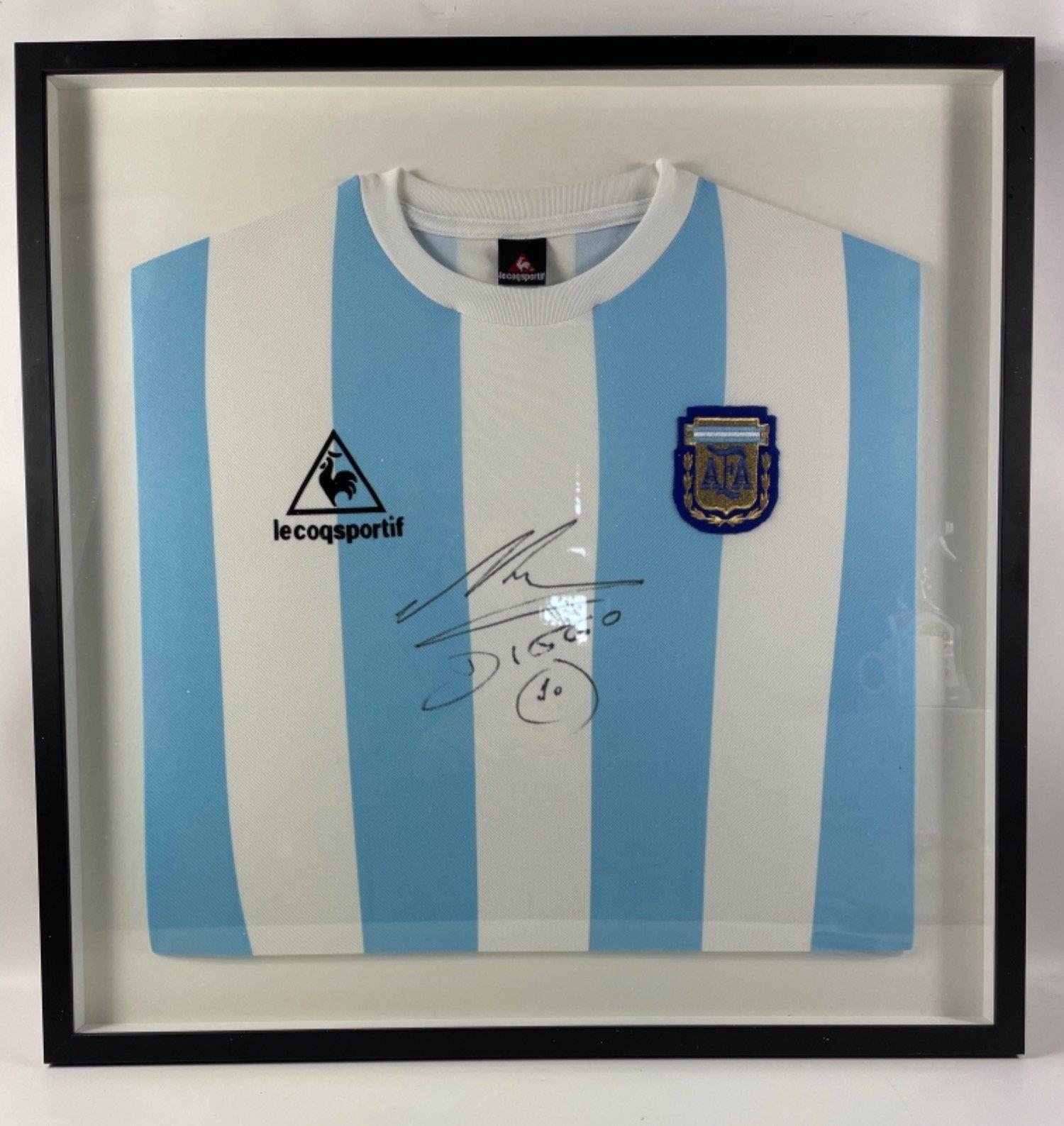 SUPER COLLECTABLE!! An ARGENTINA football shirt signed by Diego Maradona, frame size 69 x 68cm
