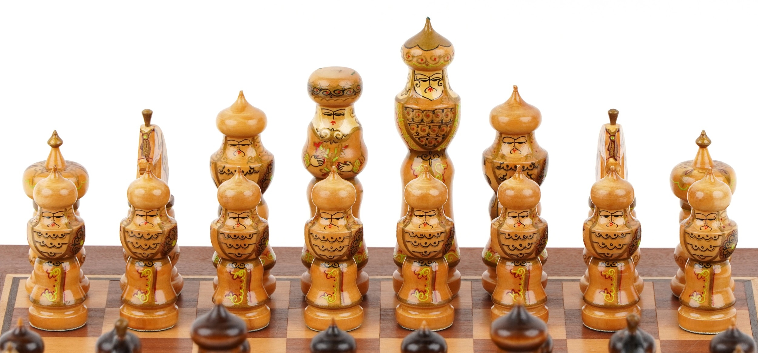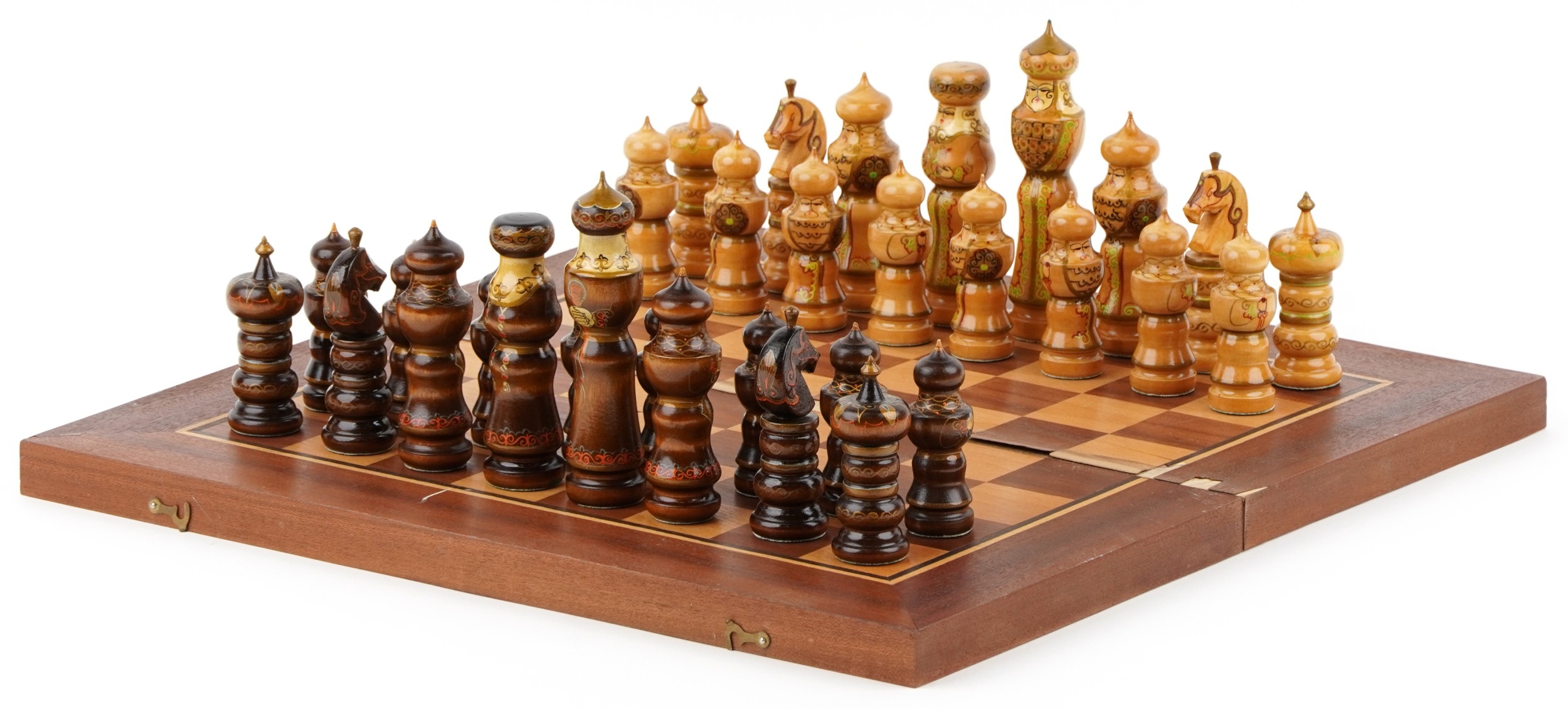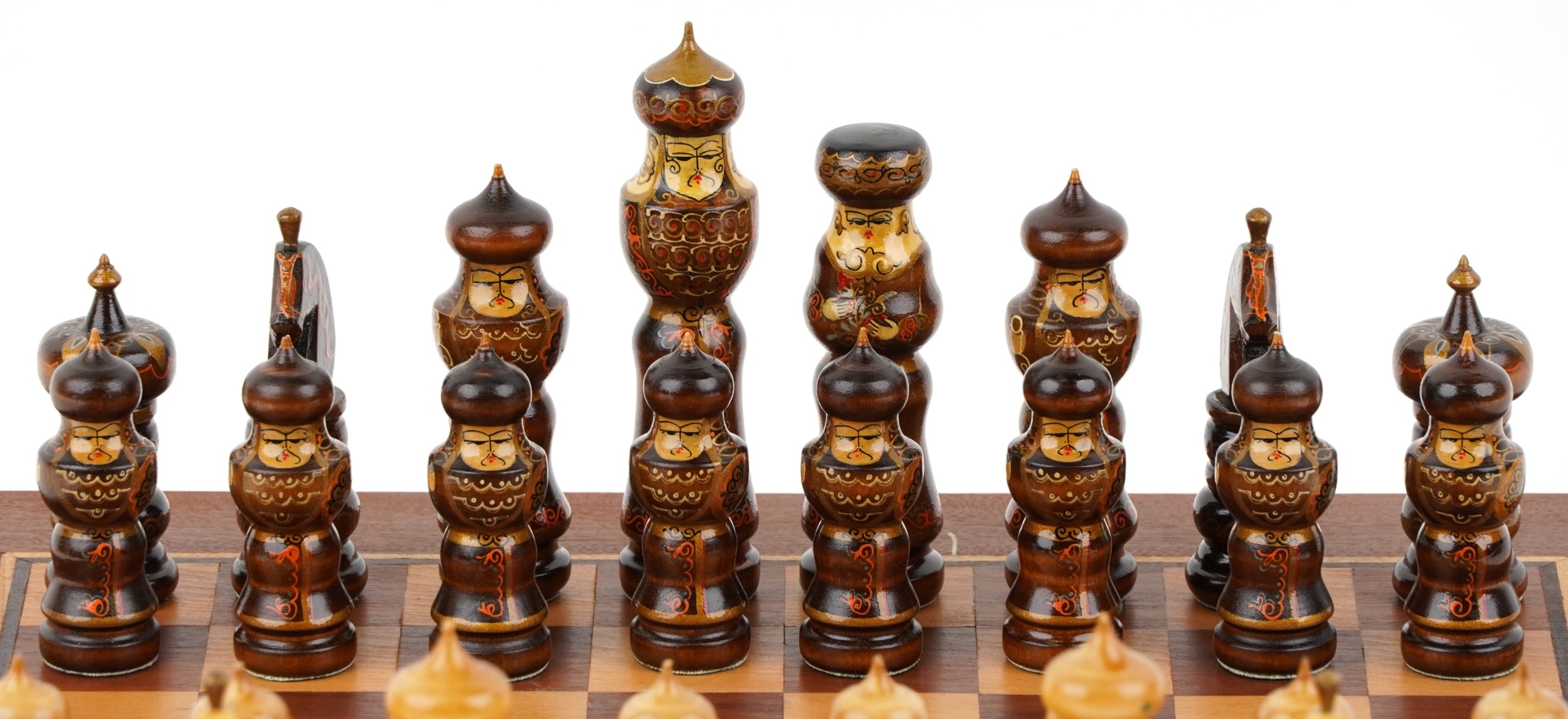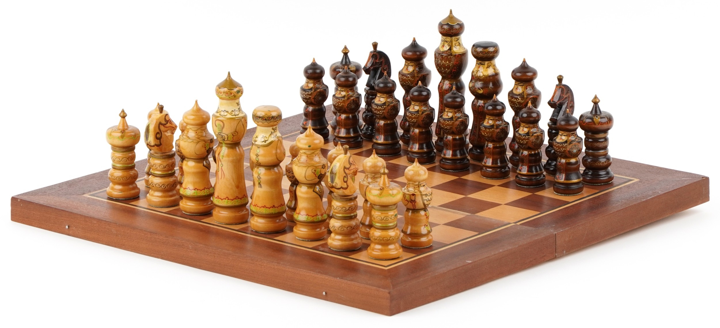 A folk art hand painted wooden chess set with folding board, the largest piece 15cm high.