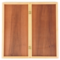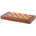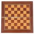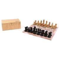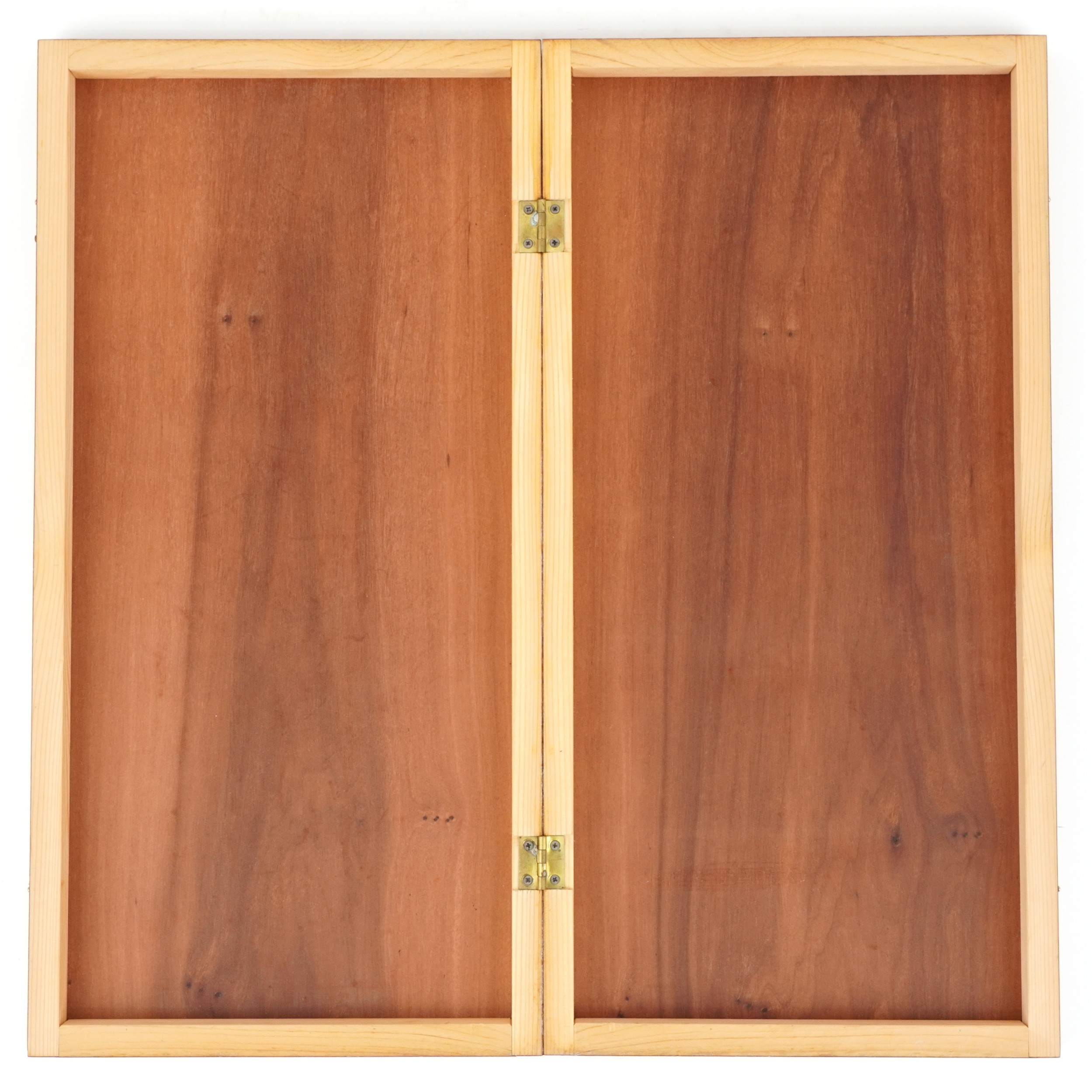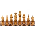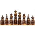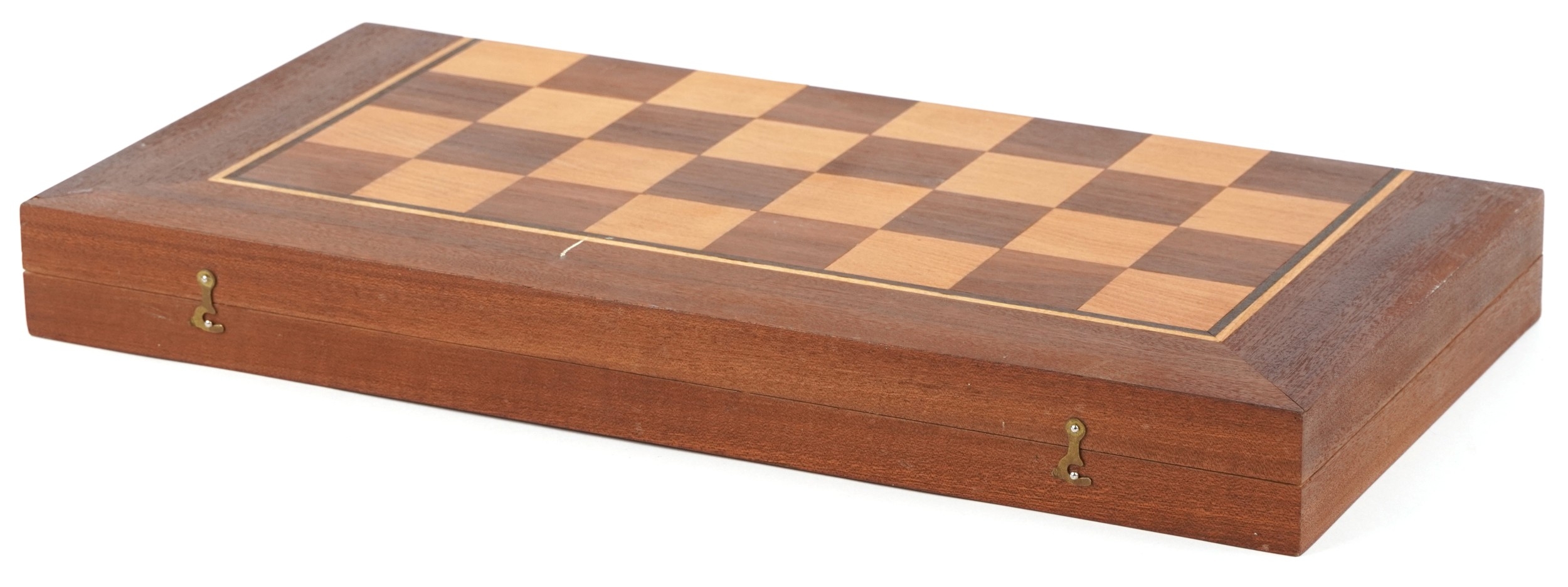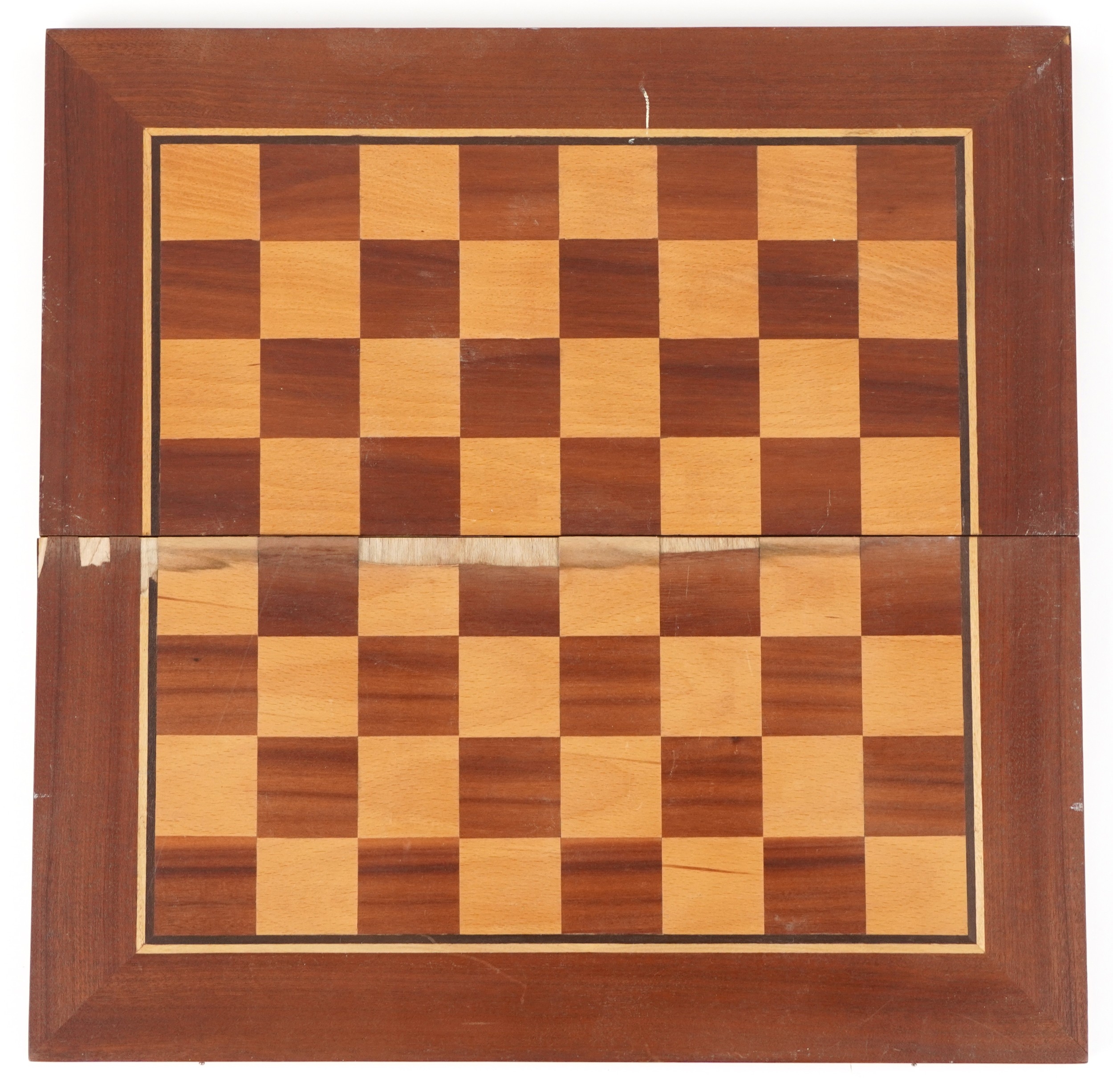 A folk art hand painted wooden chess set with folding board, the largest piece 15cm high.