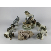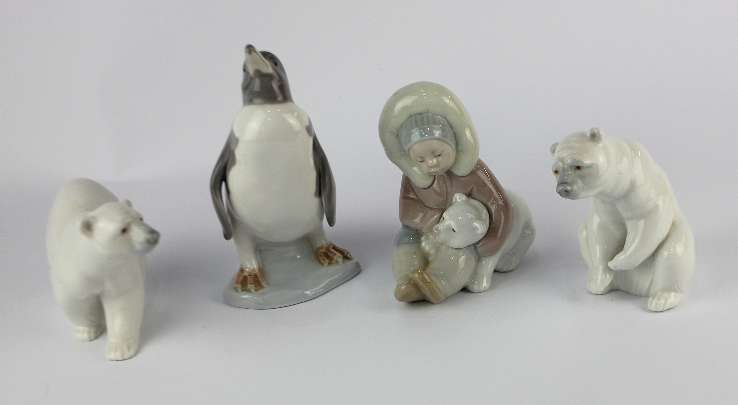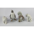Two Lladro figures of Polar bears, together with Lladro figure of a Girl with a Polar bear cub and a Lladro figure of a penguin, height 17cm (4)