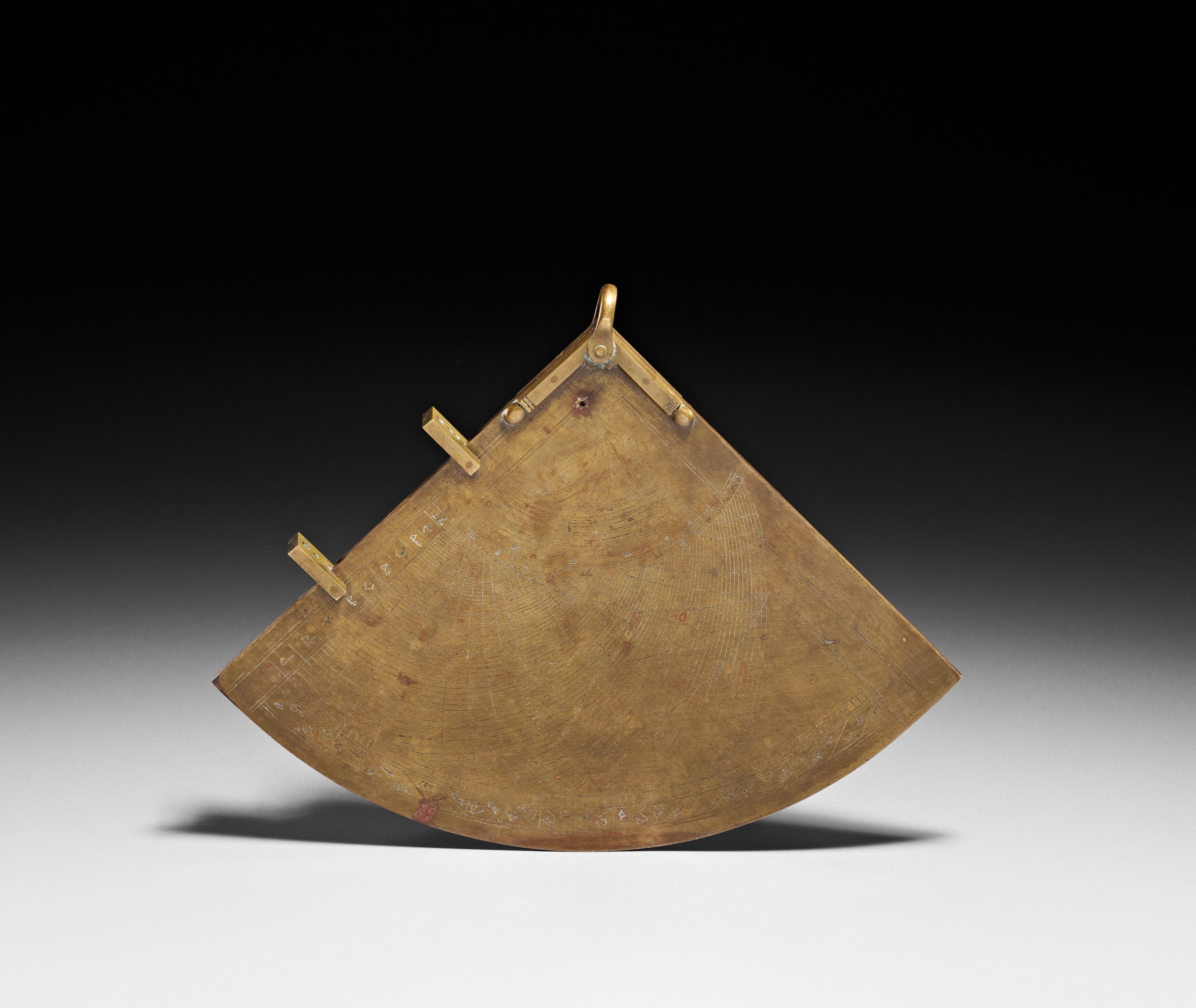 A North African brass astrolabic quadrant, likely 19th century. The instrument features a fan-shaped body engraved on both faces with mathematical scales and Arabic script. One side displays a detailed sine-cosine grid, while the reverse shows concentric altitude arcs and radial lines. The instrument is equipped with a suspension loop at its apex and two integral sighting vanes positioned along one of its straight edges. The surface is incised with abjad numerals and astronomical data.