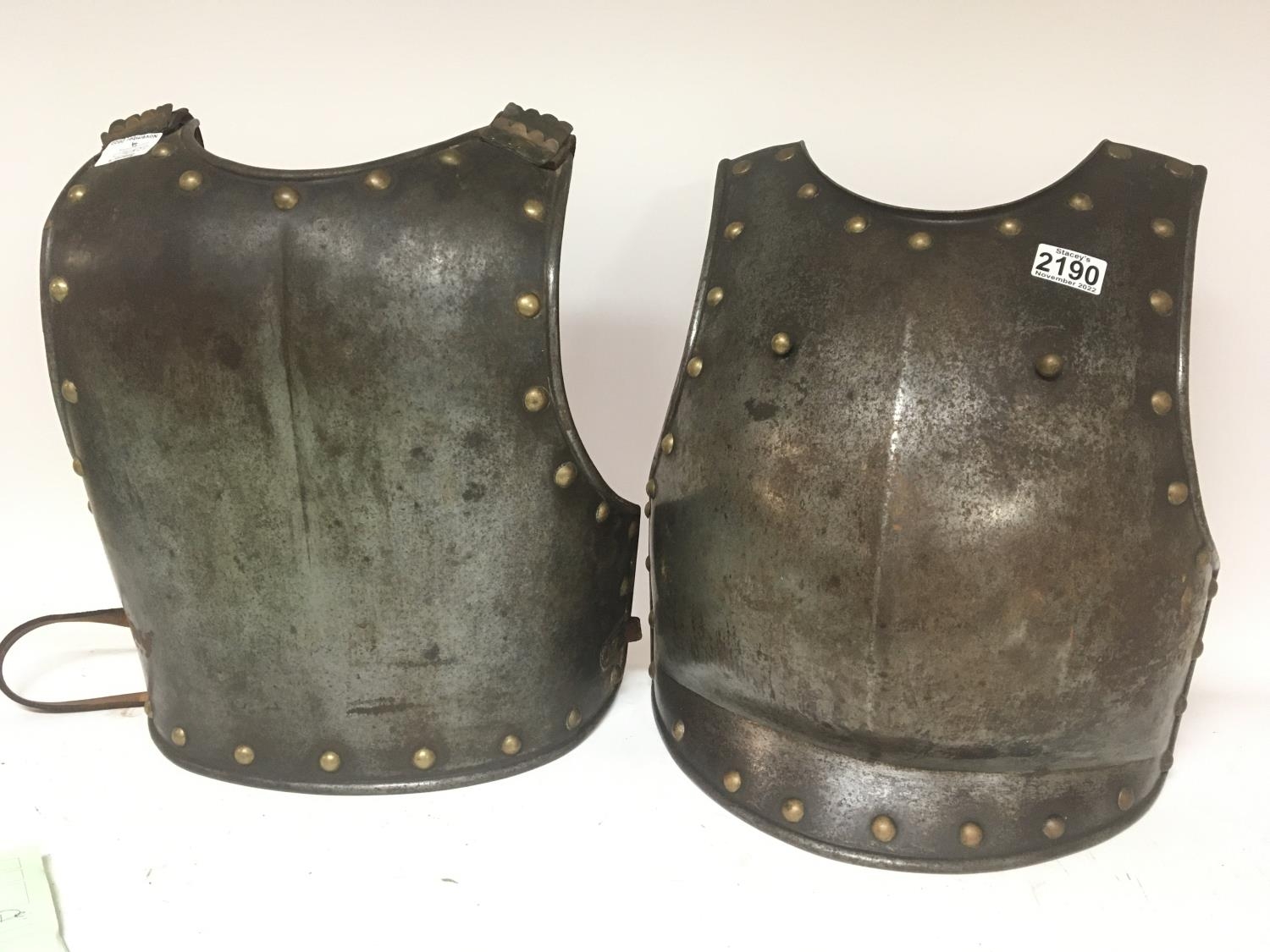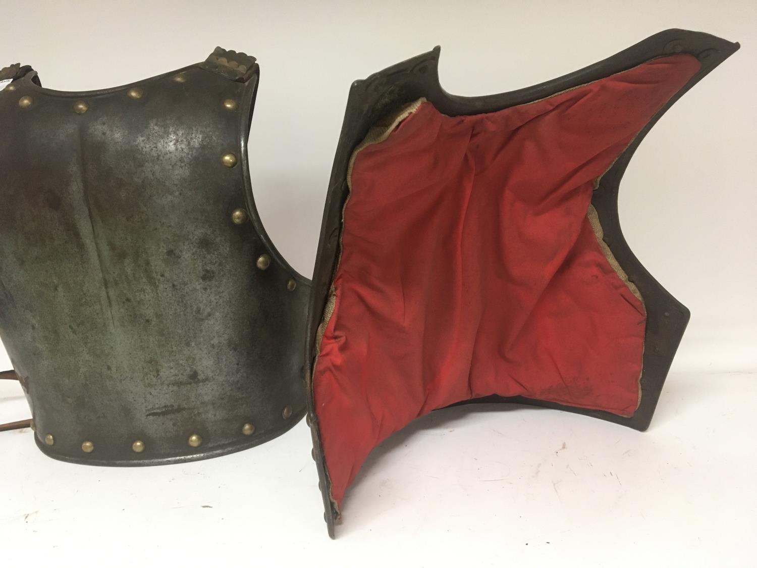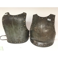 An Antique Armour breast and back plate with brass stud and shoulder straps metal and leather.