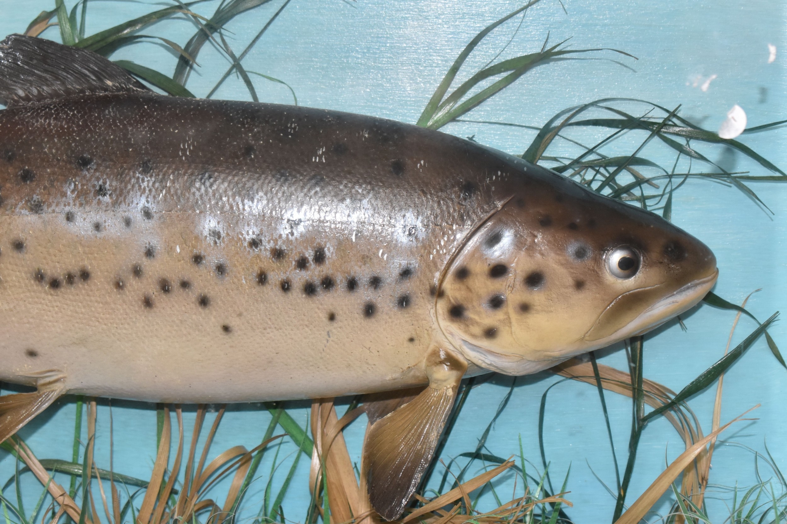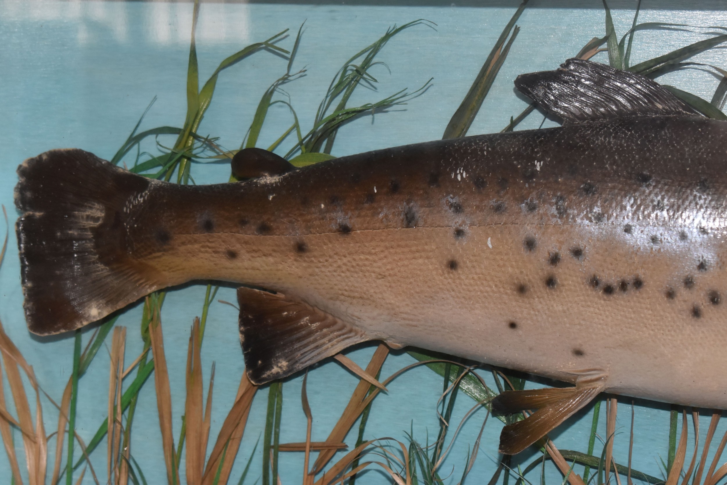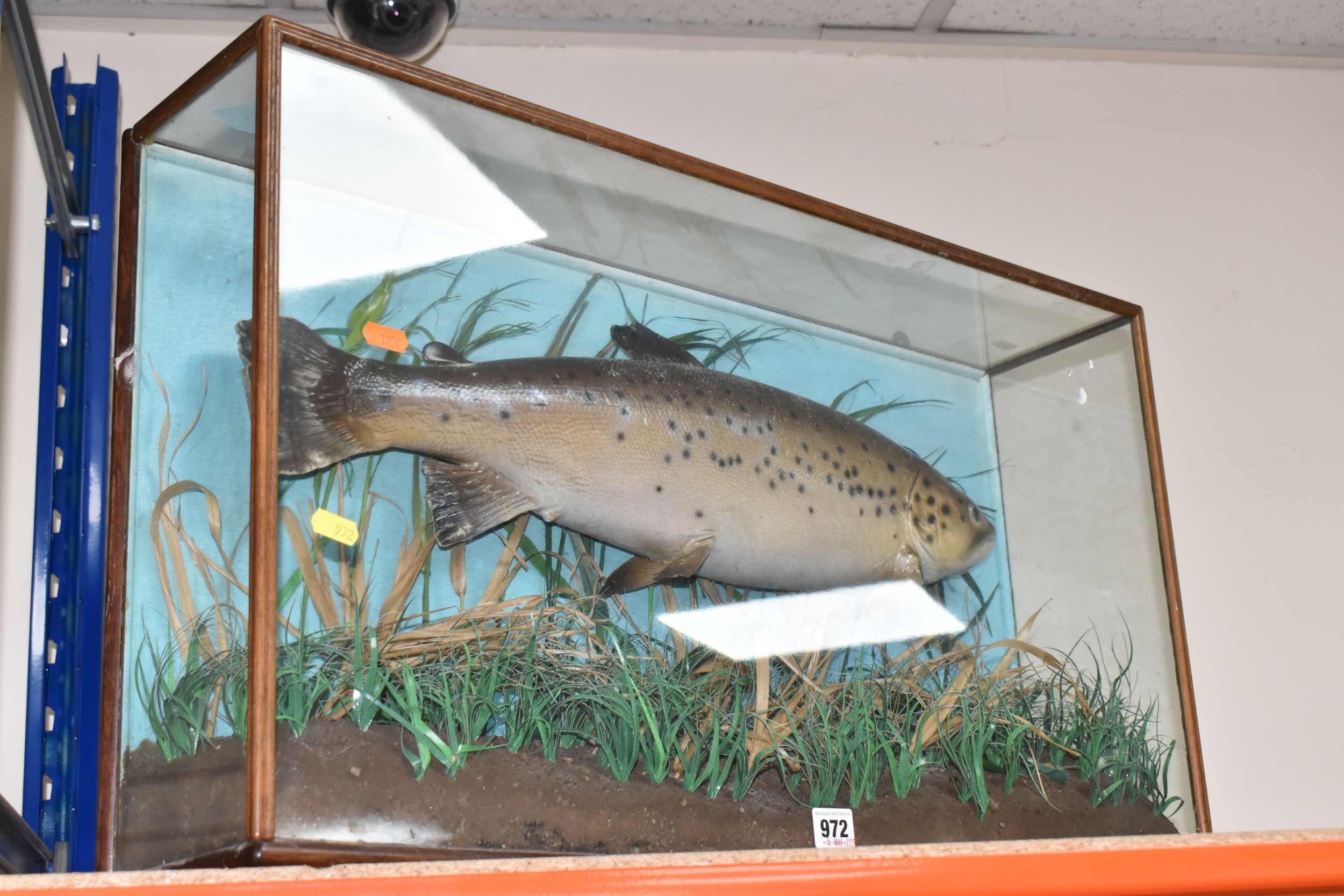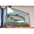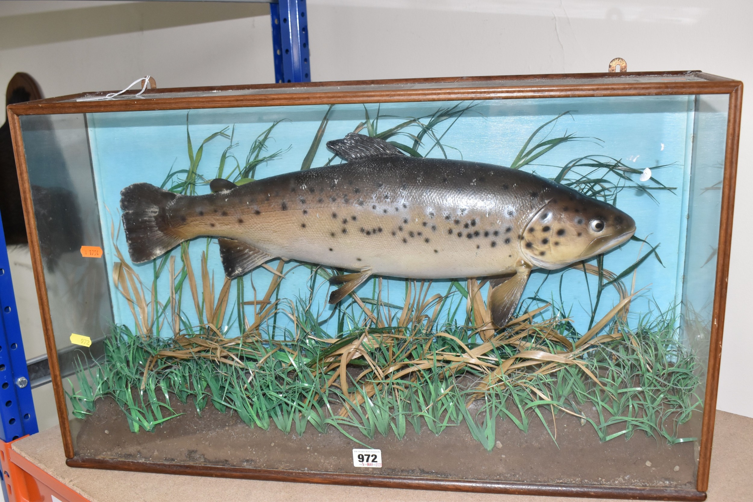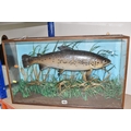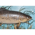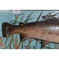 A LATE 20TH CENTURY CASED FIBREGLASS PAINTED MODEL OF A BROWN TROUT SWIMMING AMONGST REEDS, blue painted background, four glazed panel rectangular case, width 72cm x height 42.5cm x depth 16.5cm (1) (Condition Report: in good overall condition)