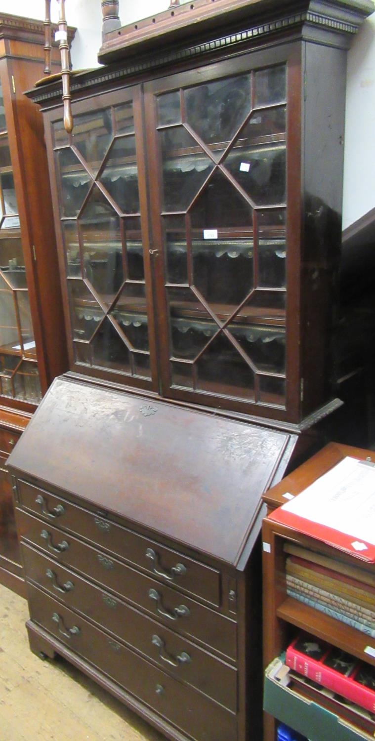 Late 19th or early 20th Century mahogany bureau bookcase in George III style, the moulded cornice above a pair of astragal glazed doors enclosing leather trimmed shelves, the base with a fall front above four graduated drawers with brass swan neck handles and bracket feet, 37ins wide