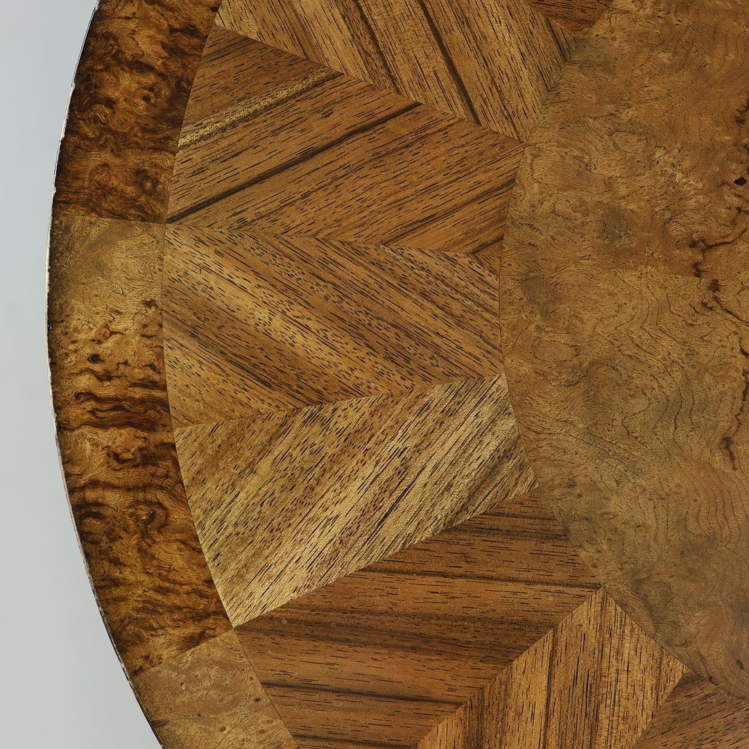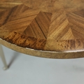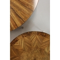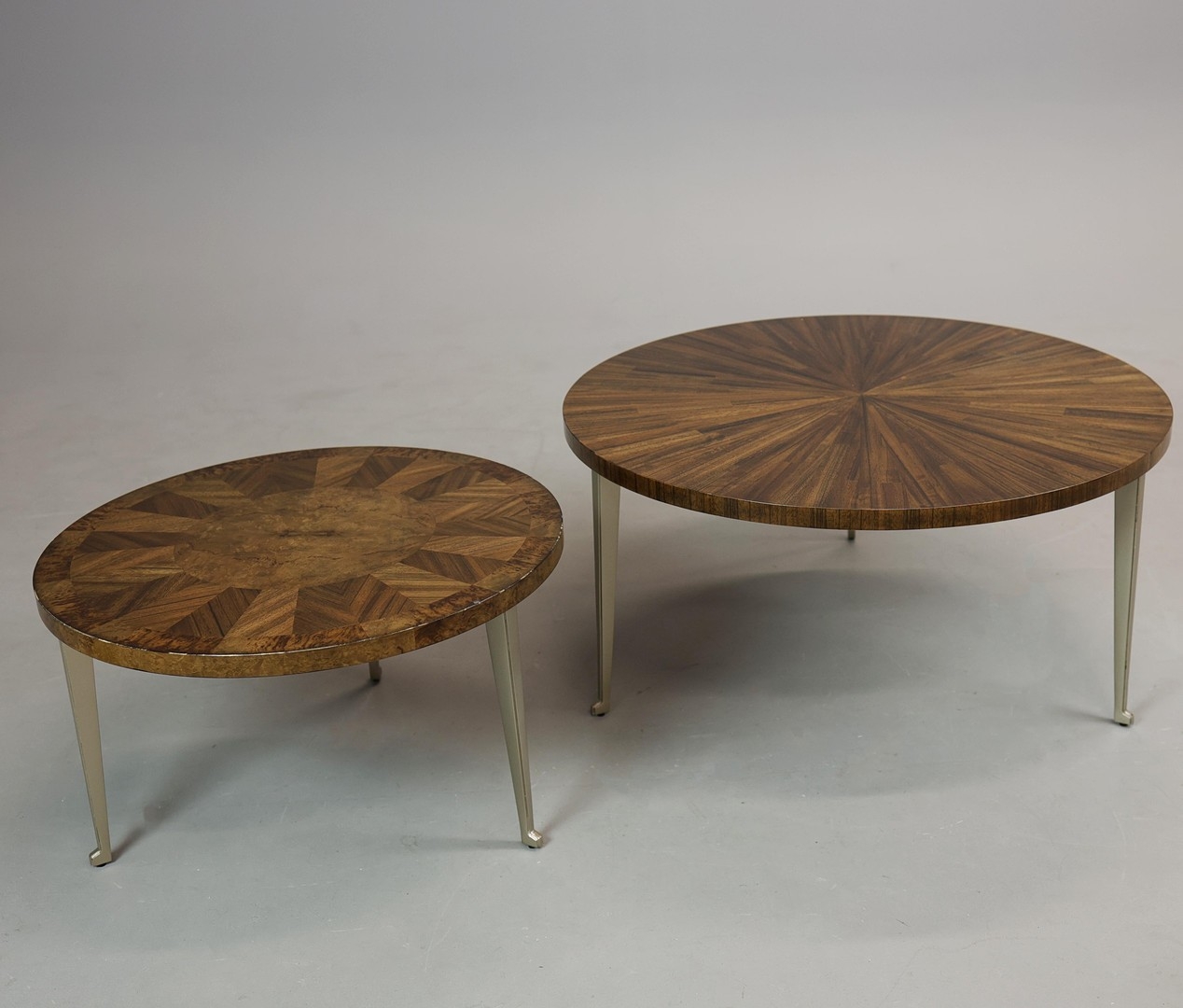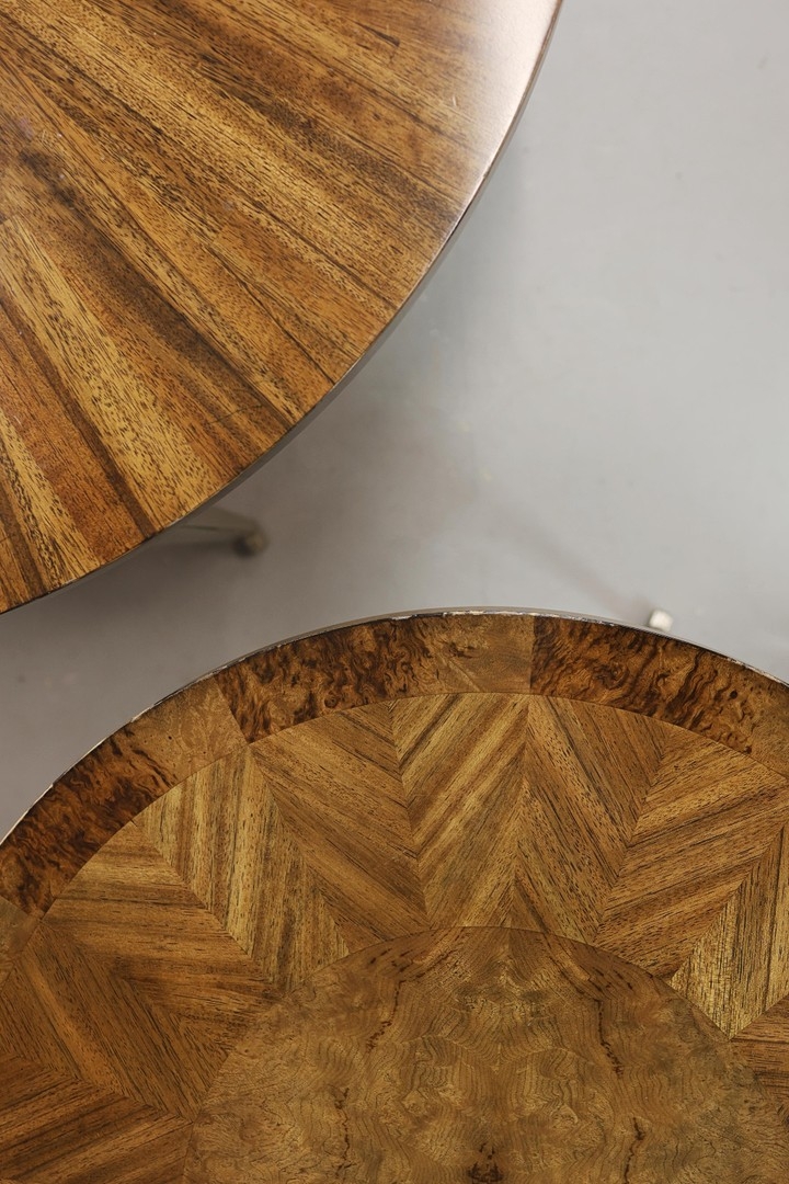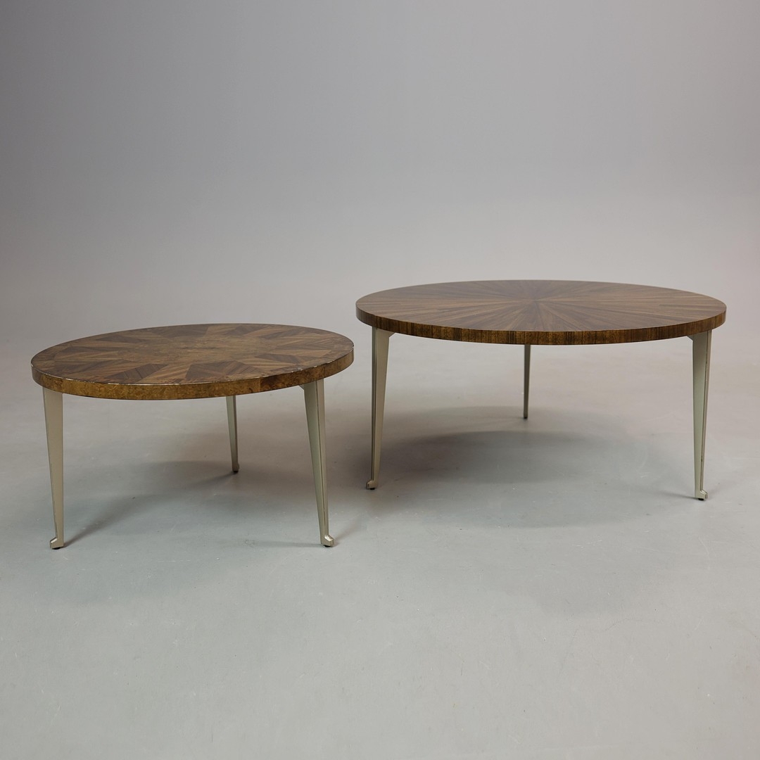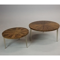 CIRCULAR COFFEE TABLES (2). a nesting pair, with circular wooden parquetry tops on metal supports, the larger 97cm w x 49cm t the other 70cm w x 43cm t (2).