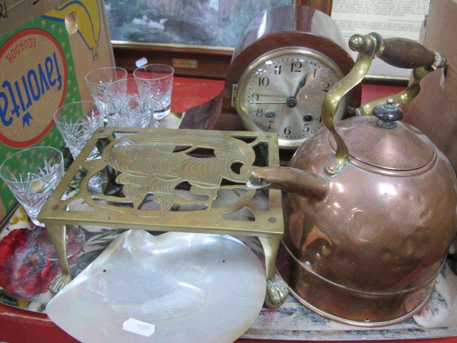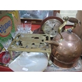Caviar Dish, glasses, copper kettle, brass trivet, mantel clock:- One Tray