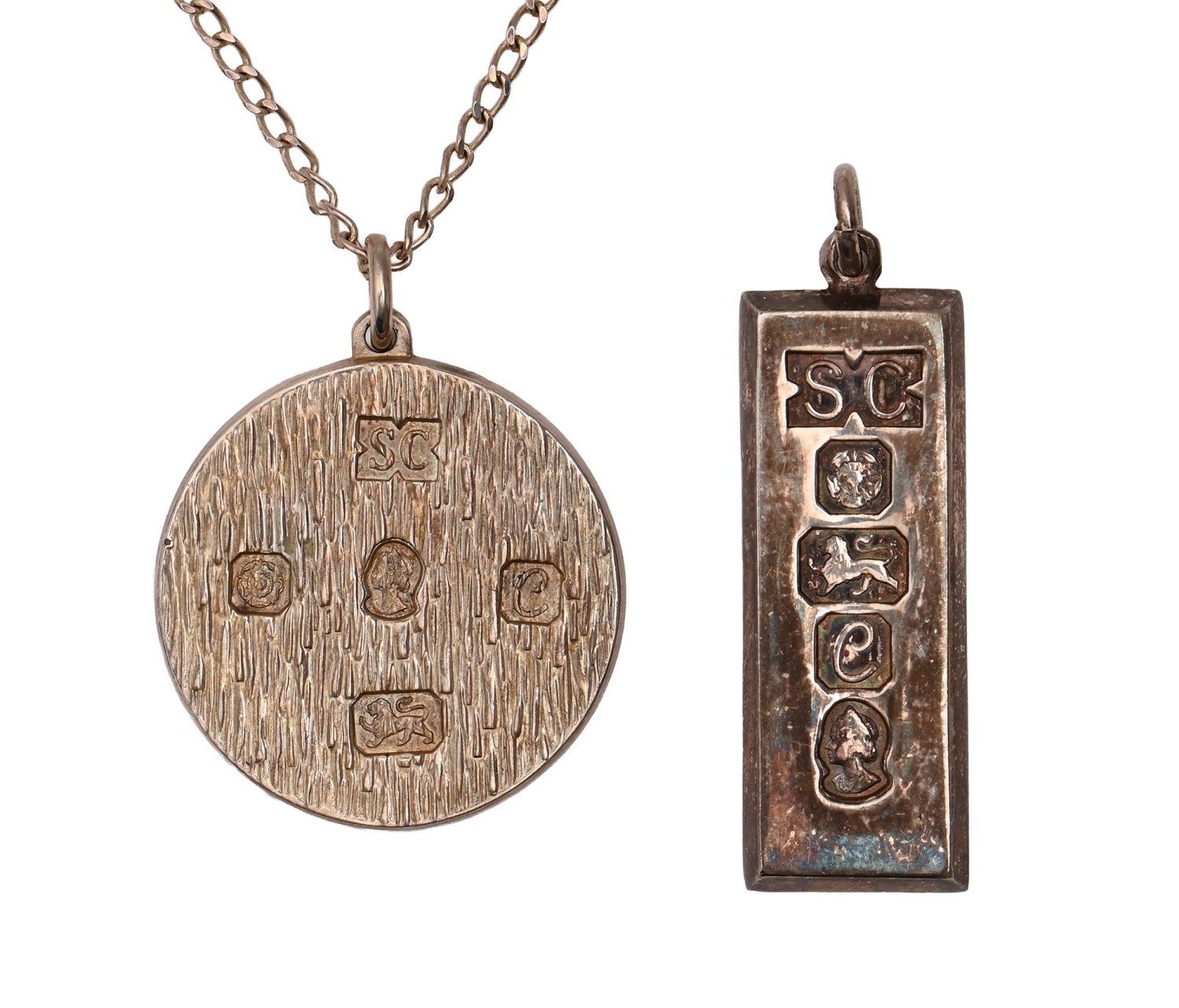 Two silver pendants, one in the form of a bar, 3.2cm diam and 4.1cm h, both Sheffield 1977, 2oz