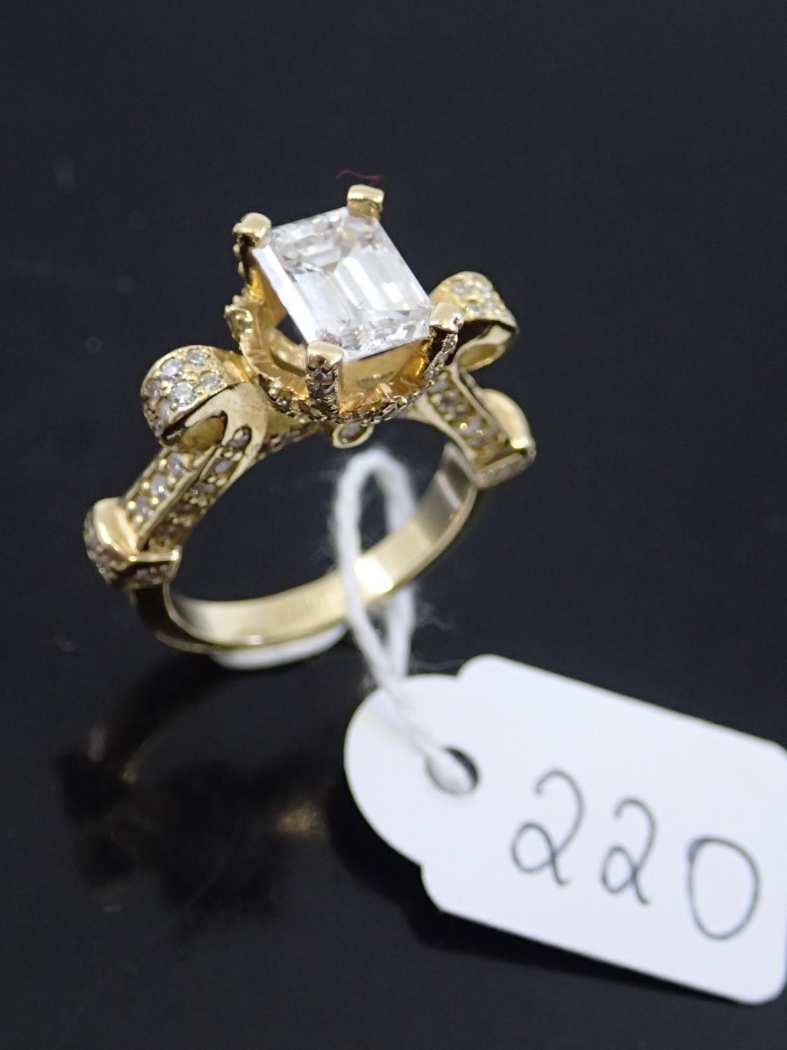 A ladies 18ct gold emerald cut diamond ring with diamond shoulders finger size K