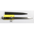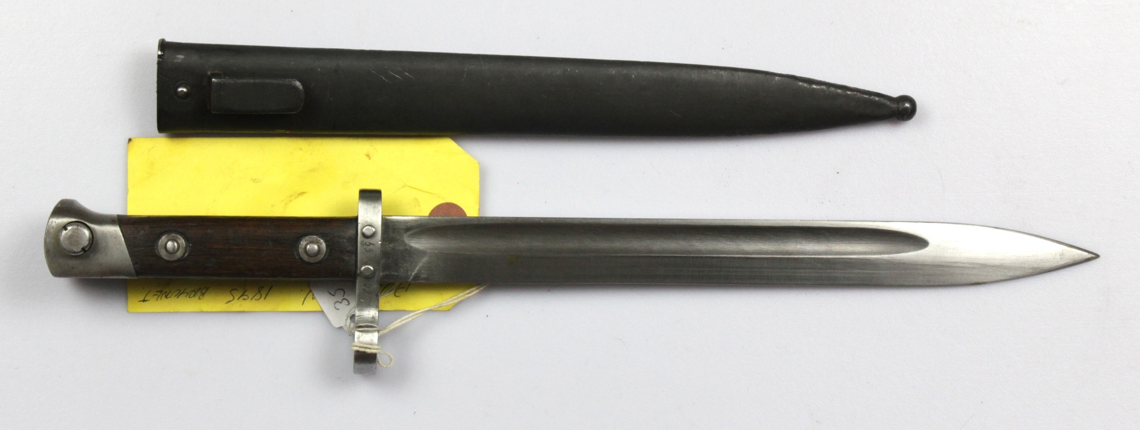 Bayonet: An Austrian Model 1985 bayonet in its steel scabbard. Blade 9.75", cutting edge on top. In very good condition. Marked "OE WG" on ricasso.