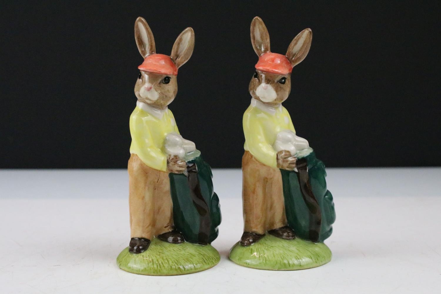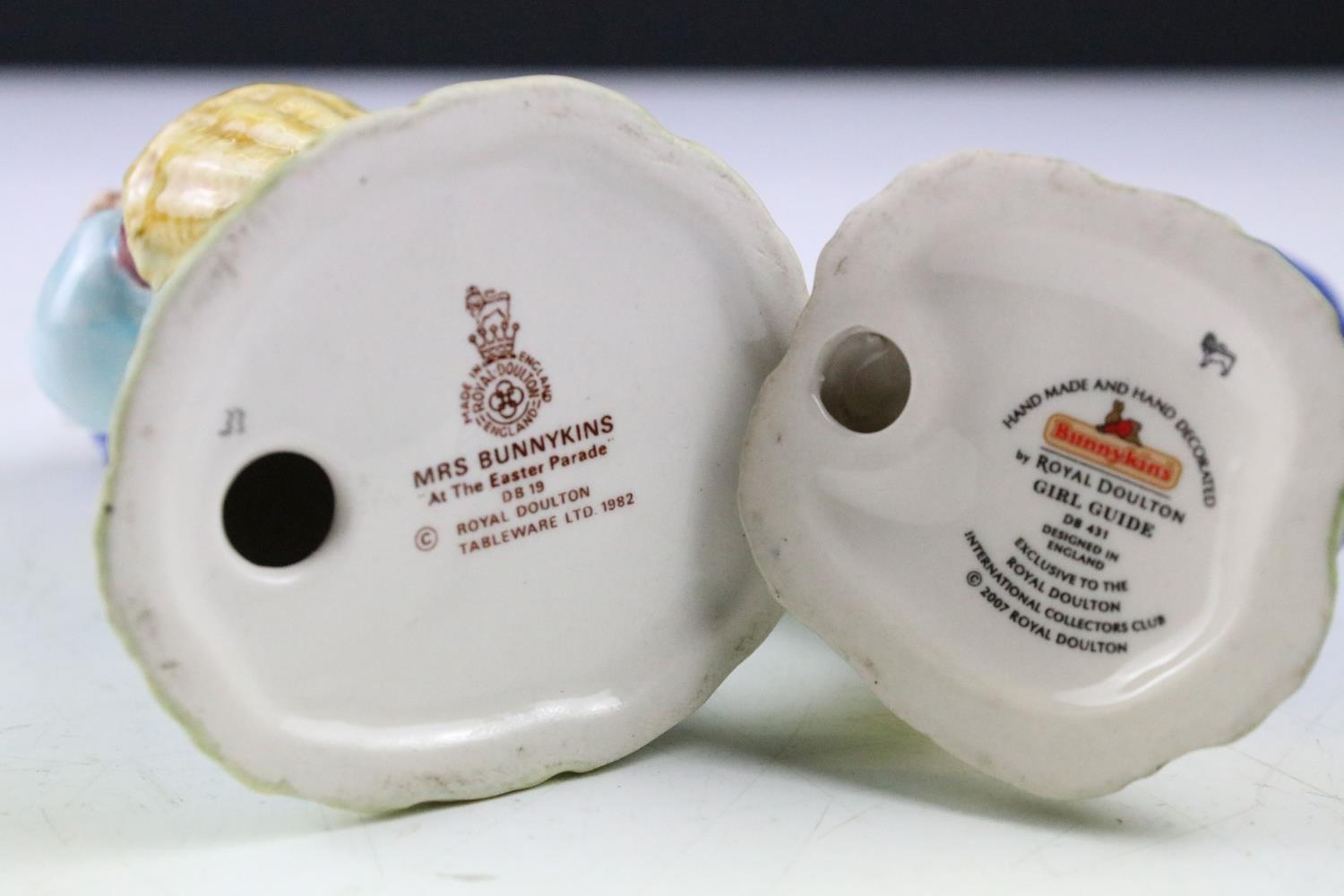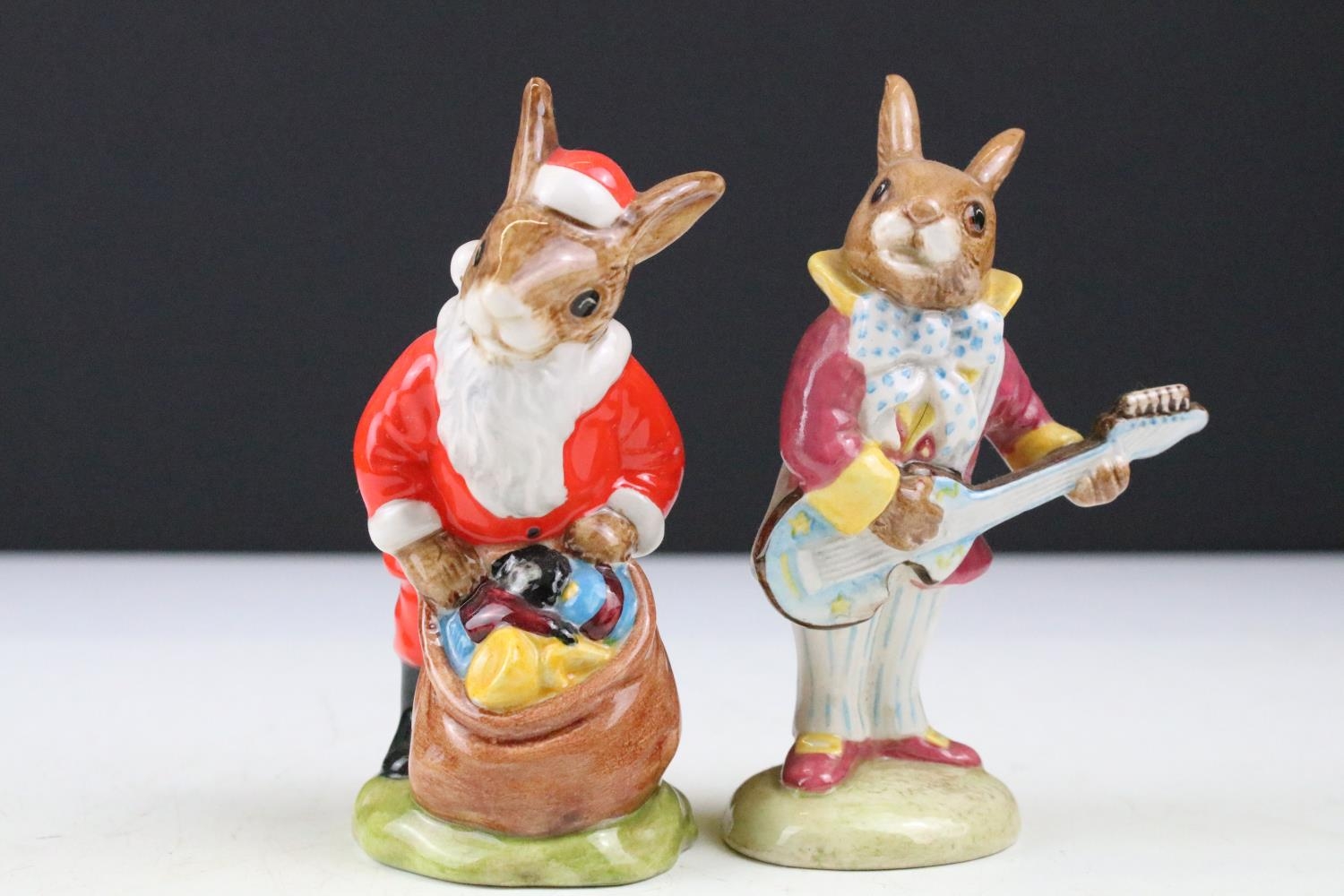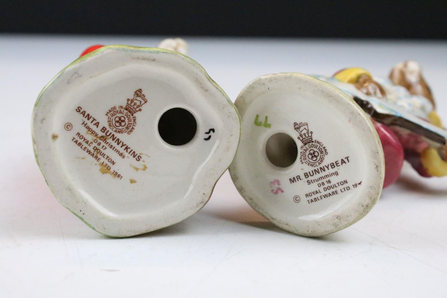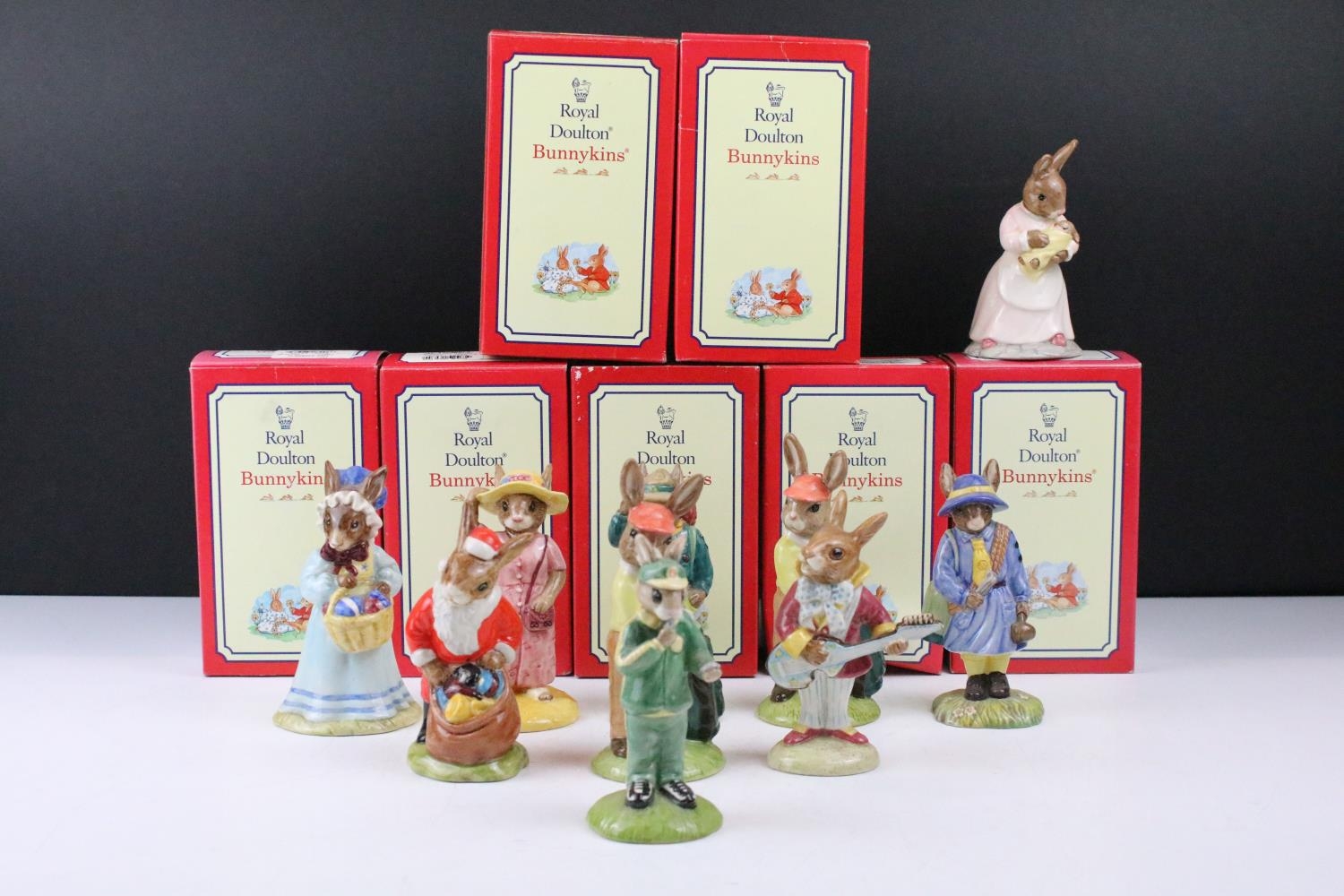 Collection of 16 Royal Doulton Bunnykins figures to include boxed examples, the lot featuring Boy Scout Bunnykins, Caddie Bunnykins, Stop Watch Bunnykins, Mr Bunybeat, Santa Bunnykins, Mrs Bunnykins, etc