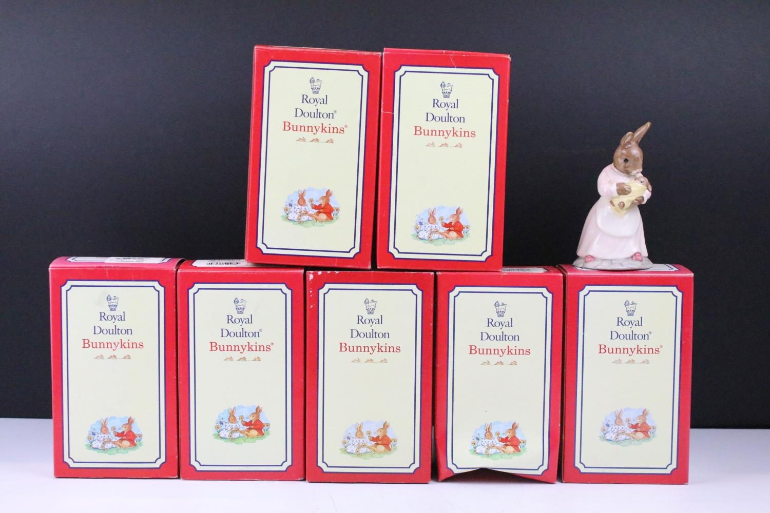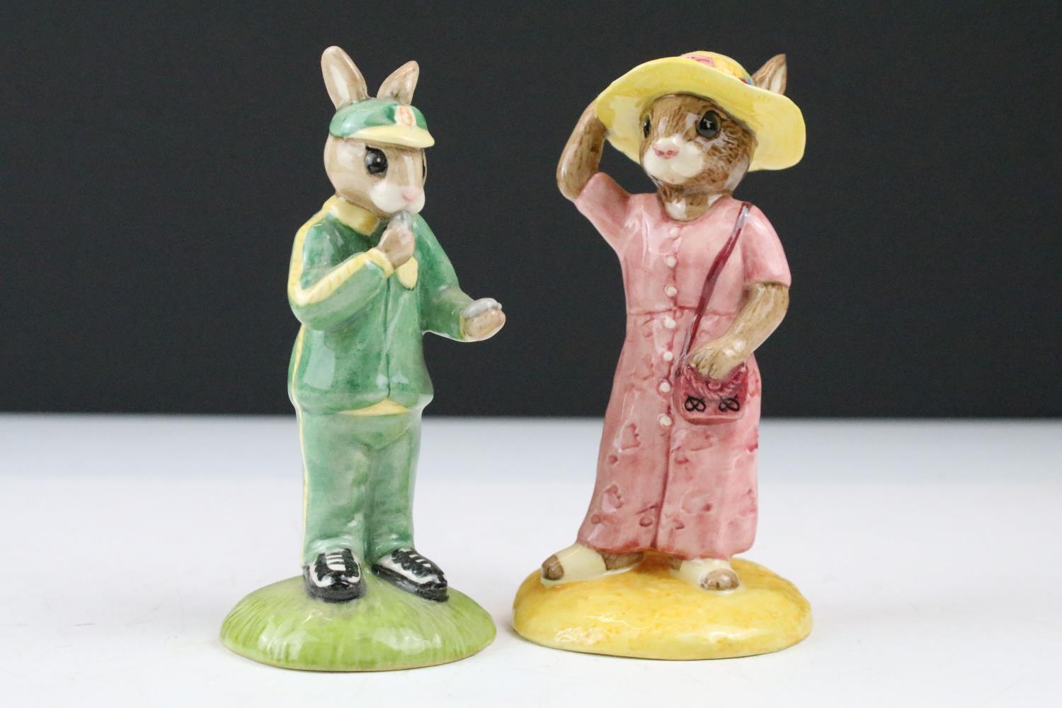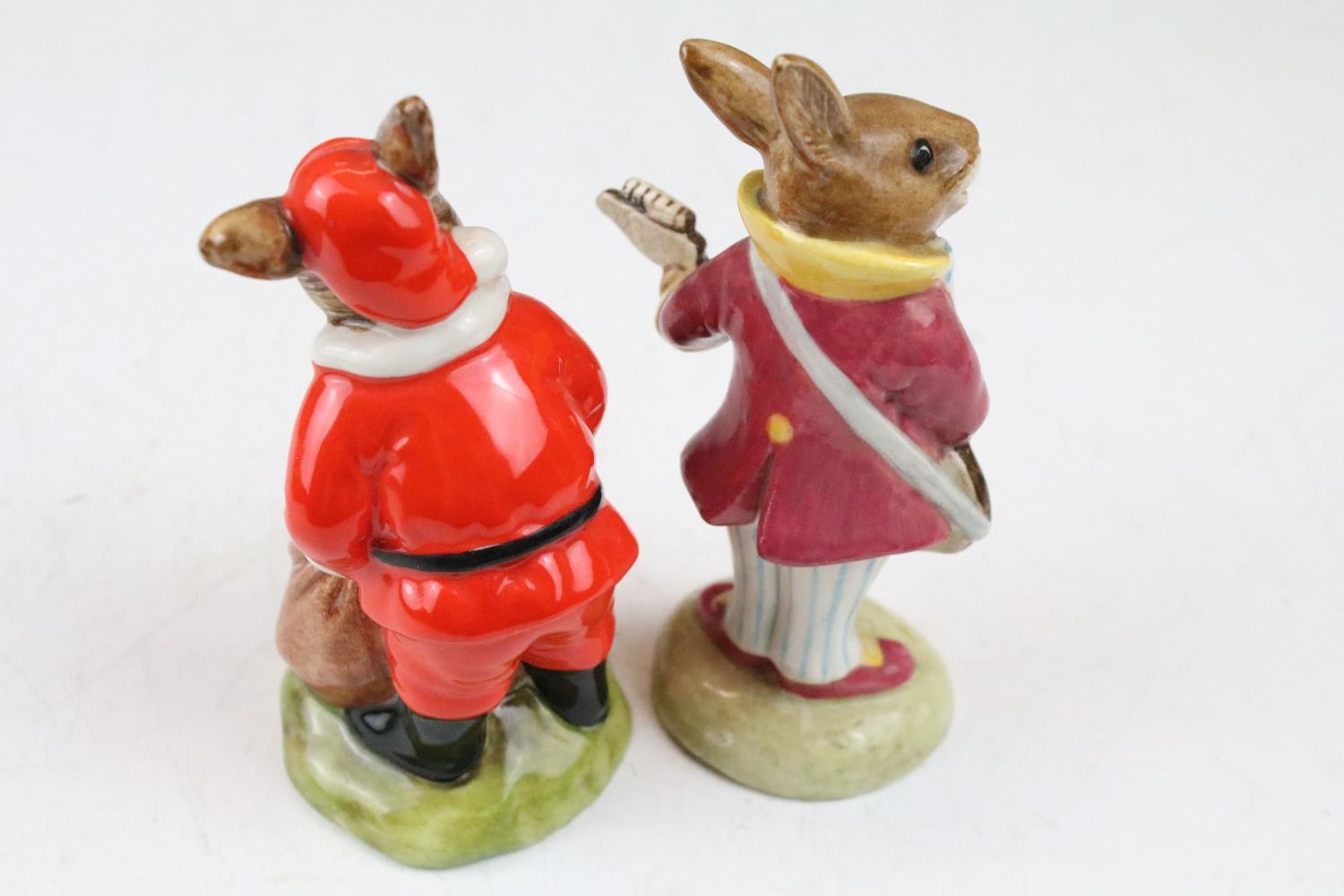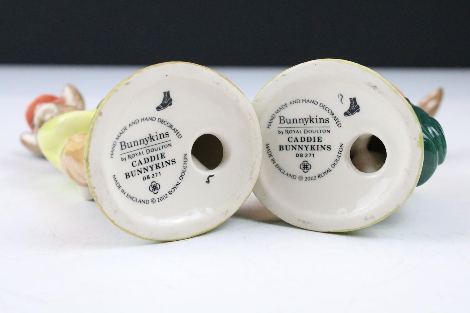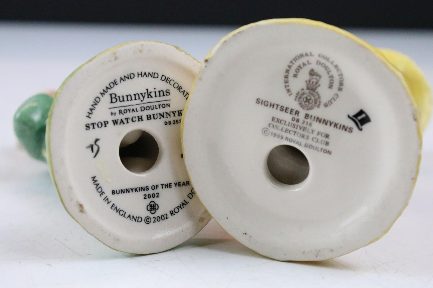 Collection of 16 Royal Doulton Bunnykins figures to include boxed examples, the lot featuring Boy Scout Bunnykins, Caddie Bunnykins, Stop Watch Bunnykins, Mr Bunybeat, Santa Bunnykins, Mrs Bunnykins, etc