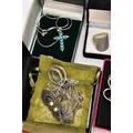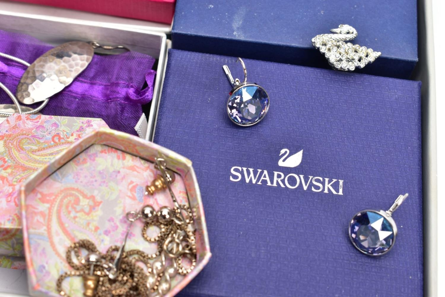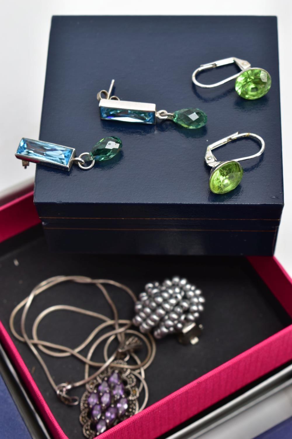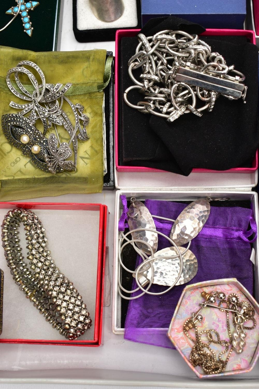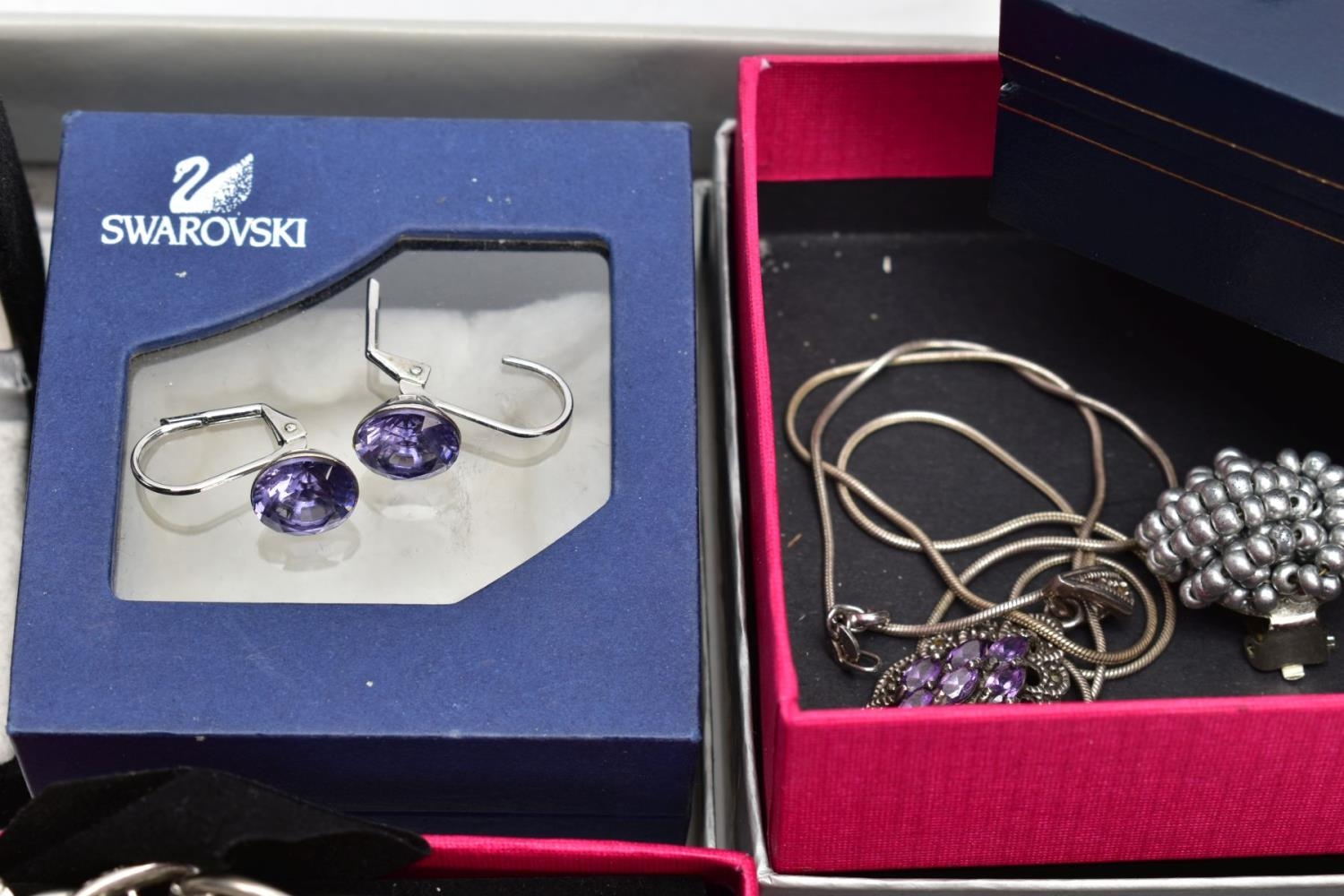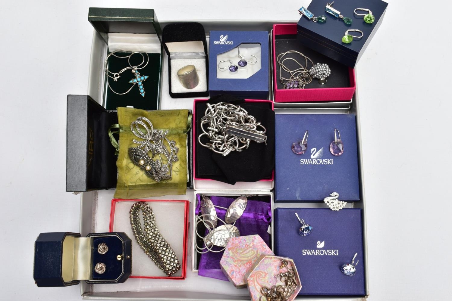 A TRAY OF ASSORTED JEWELLERY, to include a white metal marcasite and cultured pearl brooch/show buckle clips, stamped '925 sil' fitted with a brooch pin, two white metal marcasite brooches, each stamped 'Silver', boxed pairs of 'Swarovski' earrings, white metal pendant necklaces, earrings, ring, etc (some pieced with marks to indicate silver)