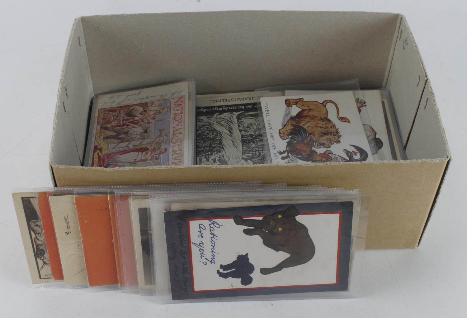 Military, WWI personalities, political cartoons, comic, etc interesting original collection in shoebox, needs viewing (approx 106 cards)