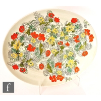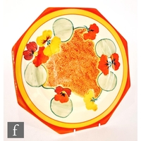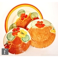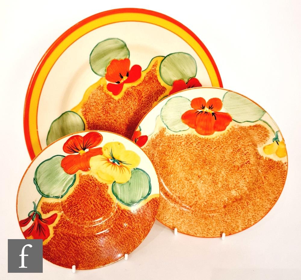 Clarice Cliff - Nasturtium - A large circular plate circa 1933, hand painted with stylised flowers and foliage over a stippled brown ground with orange and yellow banding, Bizarre mark, width 25cm, together with a smaller side plate and a large conical shape saucer. (3)