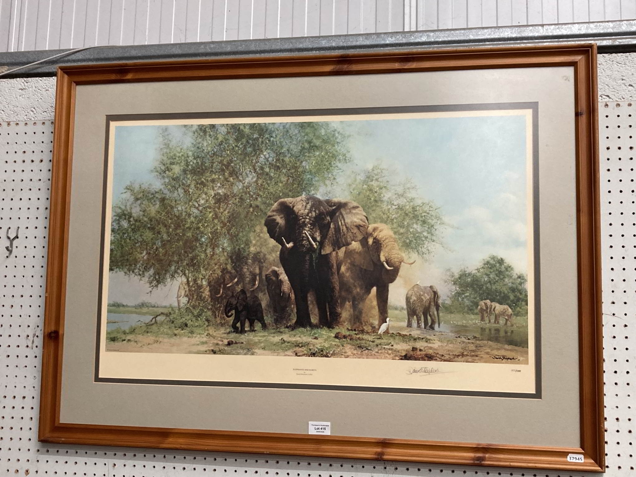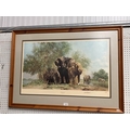 Pine framed pencil signed David Shepherd 'Elephants & Egrets' limited edition 303/1300 print 72x100cm