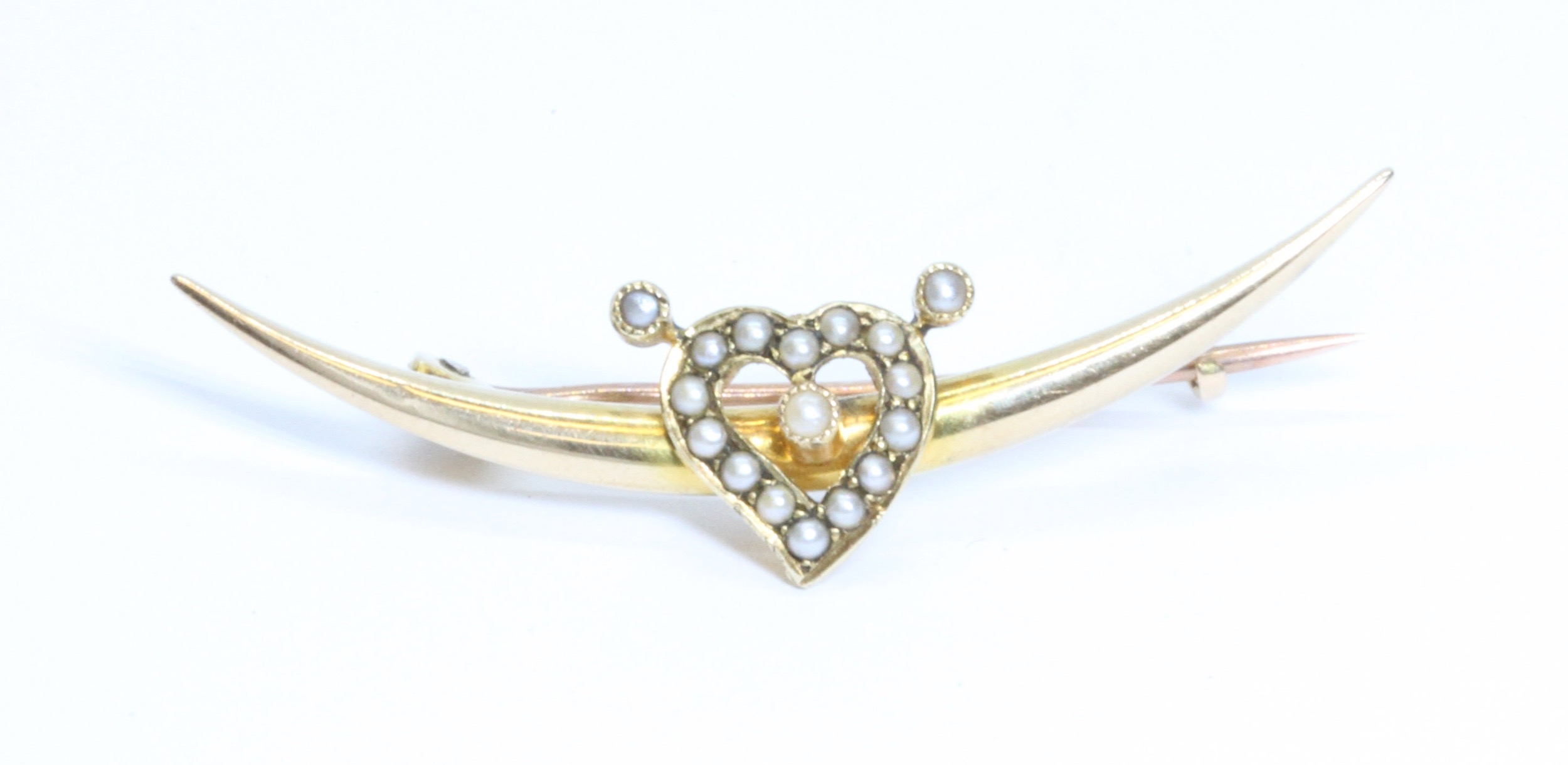 A Victorian seed pearl brooch of crescent and heart form, indistinctly marked, length 45mm, gross weight 2.7g, 10% buyer's premium (inclusive of VAT), normal online bidding fees apply.