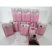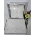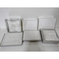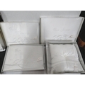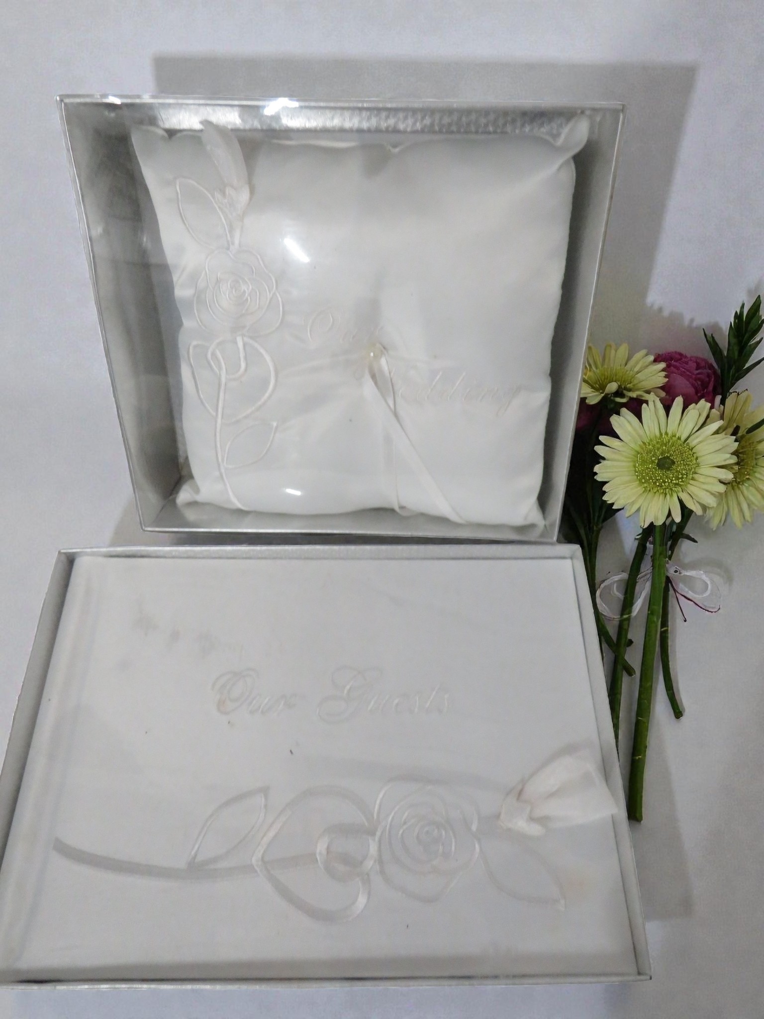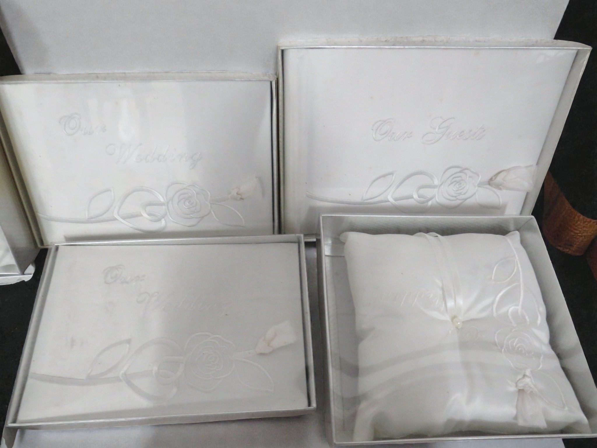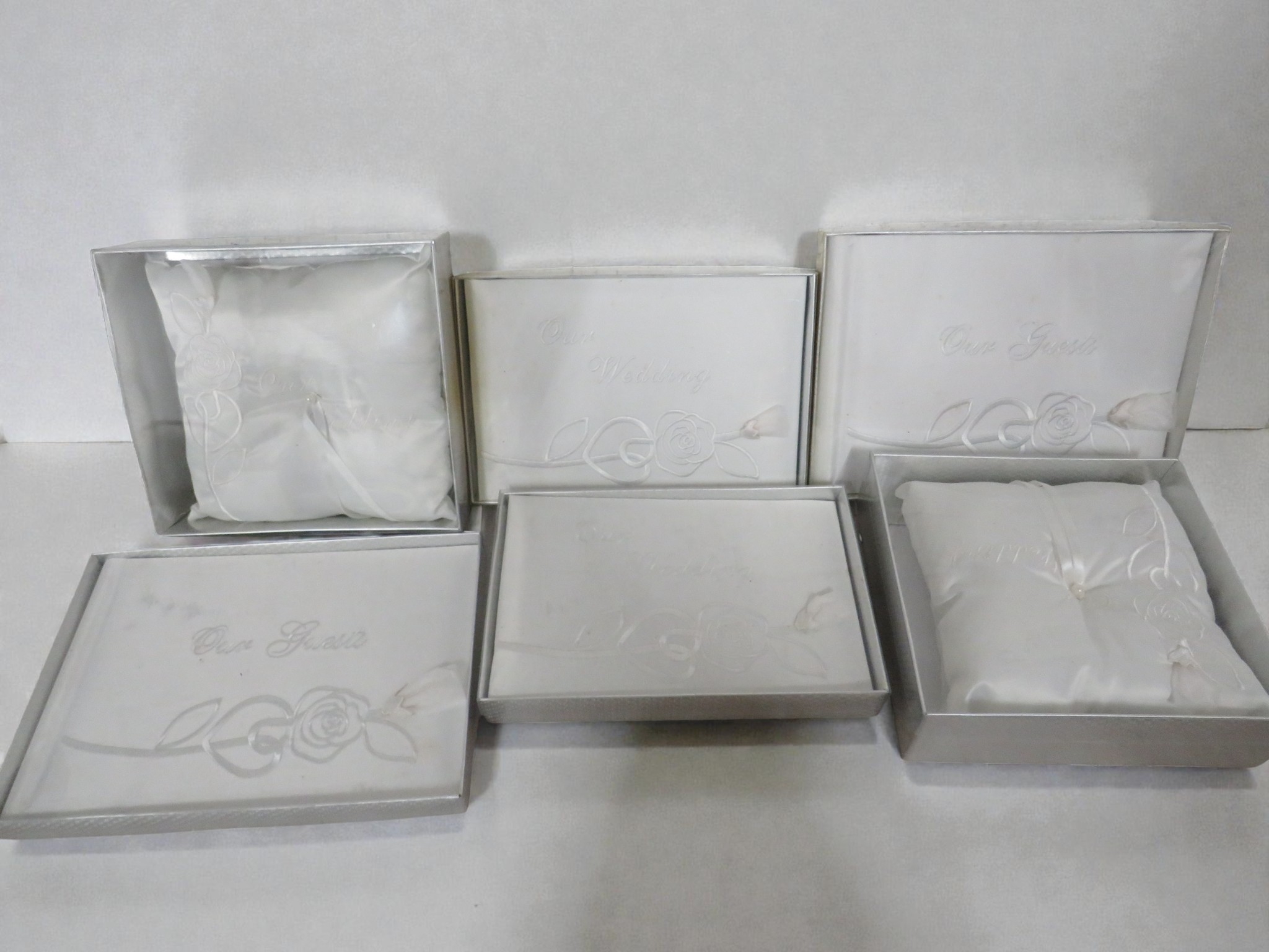 Collection of six boxed wedding guest books or albums presented in elegant silver-grey packaging. Each box is labeled "Our Wedding" or "Our Guest" in script lettering with embossed rose and ribbon designs creating an attractive raised decorative pattern. The presentation boxes feature white or silver-grey card with coordinating trim and elegant styling. Interior shows white satin or satin-effect fabric lining for luxury presentation creating a premium feel. The items appear to be hardcover guest books or photo albums suitable for wedding use with matching designs across the set. All six are boxed and appear new/unused condition. Dimensions approximately 10-12 inches. Contemporary manufacture with attention to detail in the presentation. The elegant packaging and wedding theming make these ideal for bridal retail, gift shops, or wedding party purchases. Excellent condition throughout with minimal shelf wear to outer packaging. Strong retail potential as a matched set.
