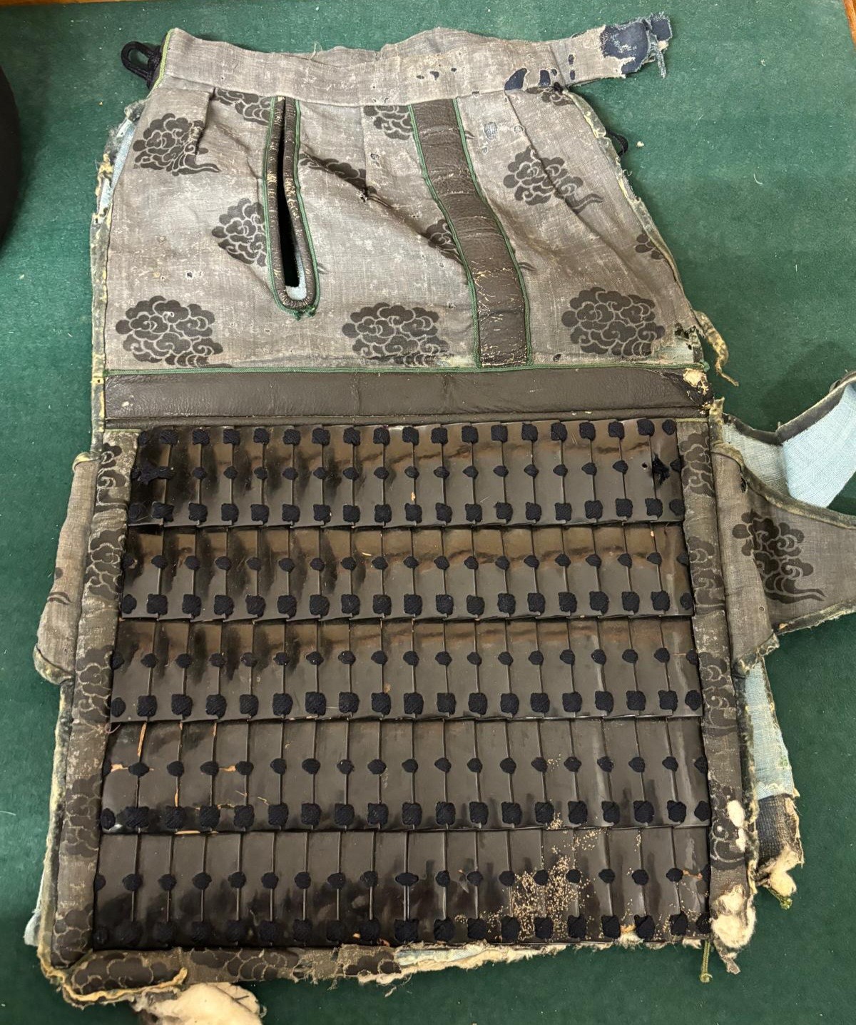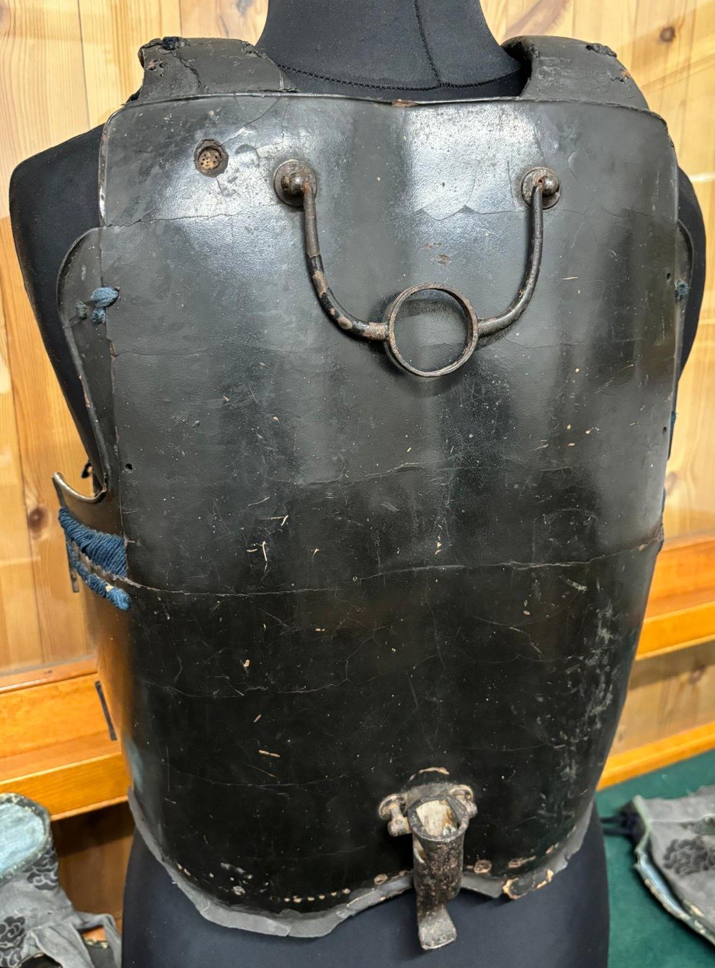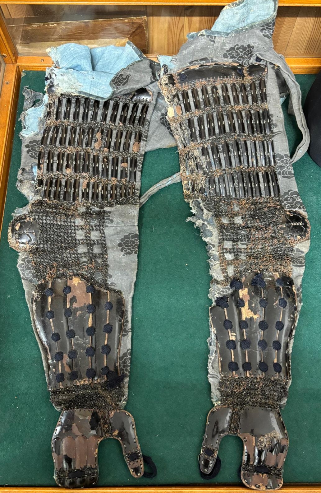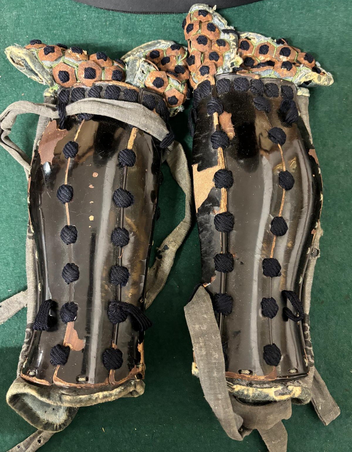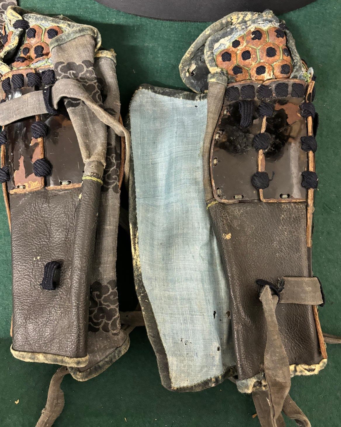 Antique Japanese Samurai part armour set; Chest and back plate [Do], arm and hand guards [Sode/ Kode], Shin guards [Suneate] and other piece [Haidate]. Age related wear- see images.