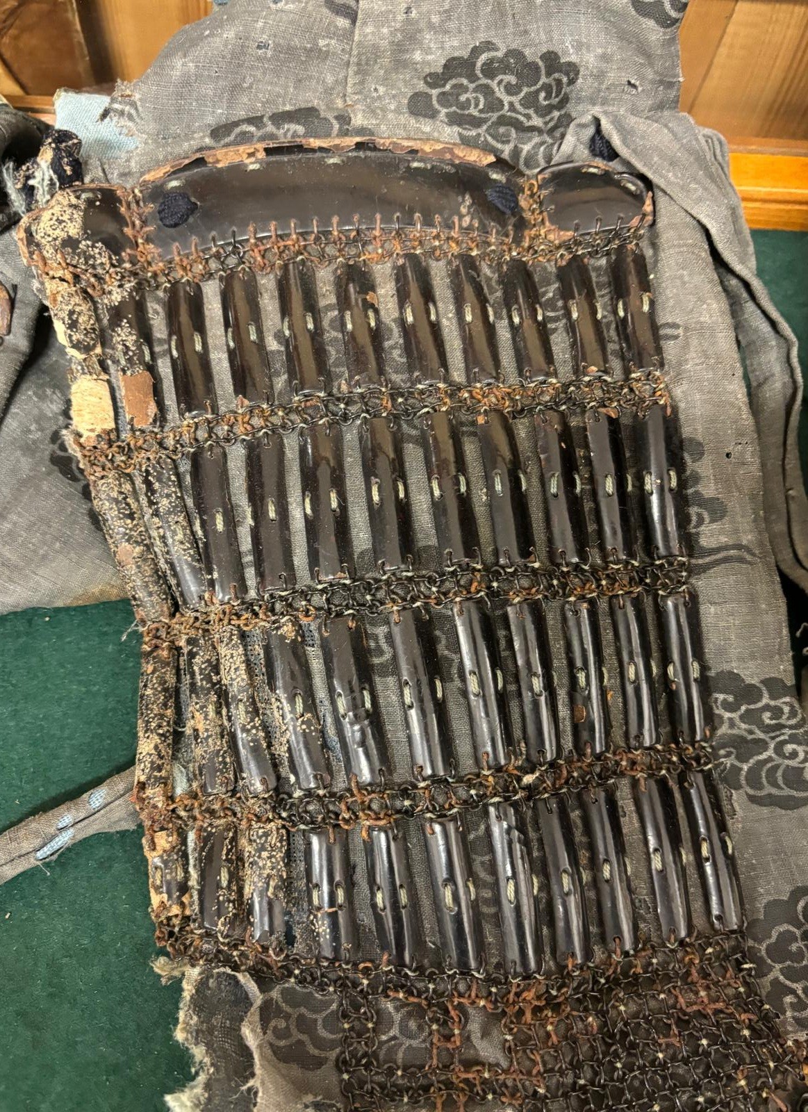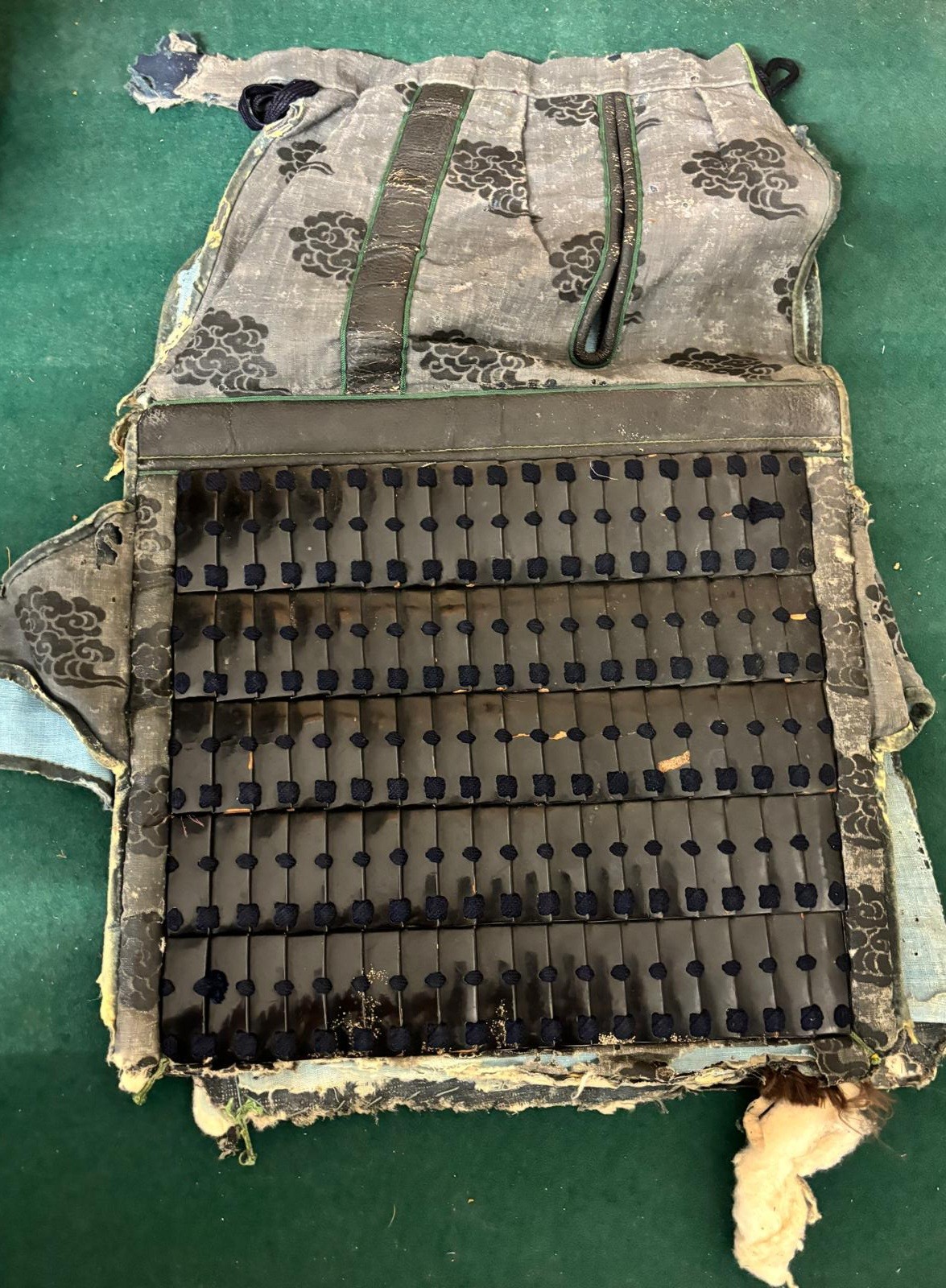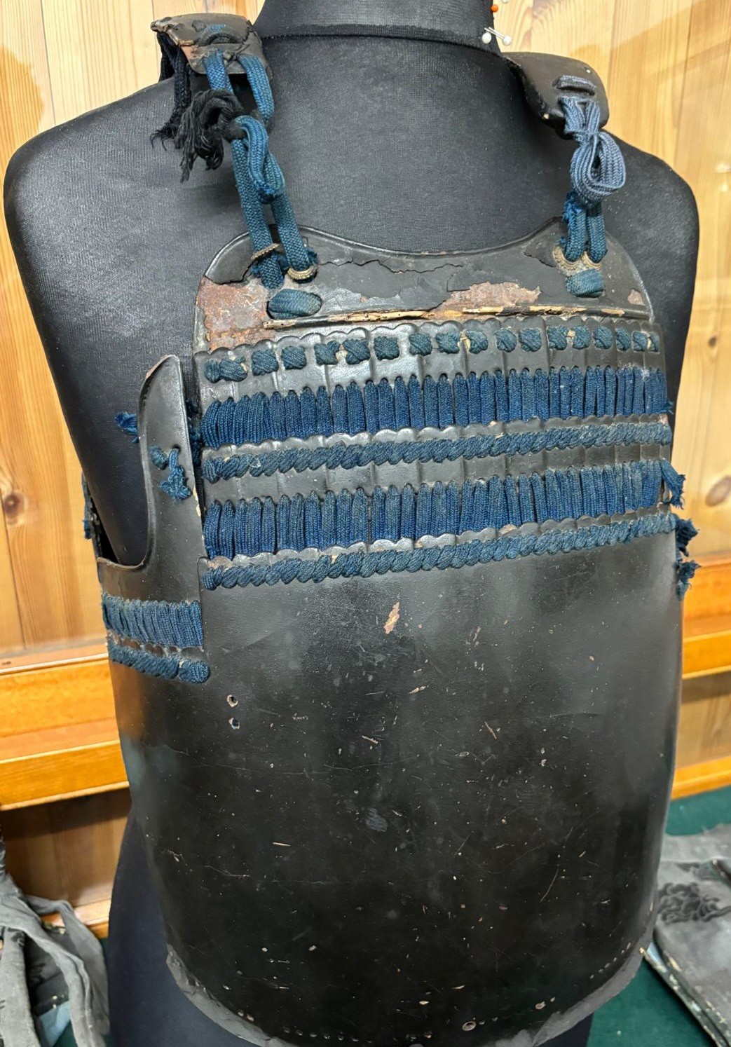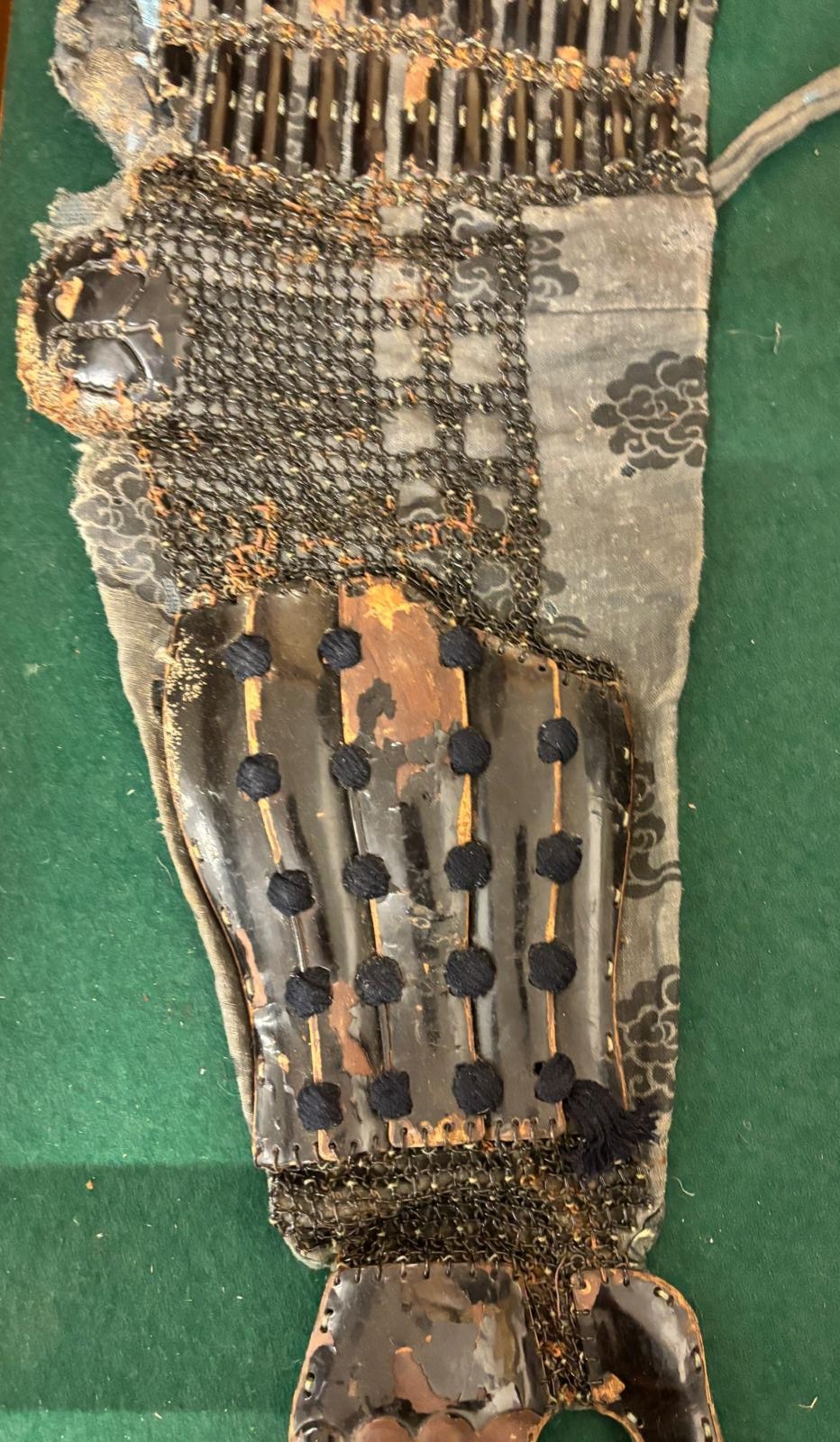 Antique Japanese Samurai part armour set; Chest and back plate [Do], arm and hand guards [Sode/ Kode], Shin guards [Suneate] and other piece [Haidate]. Age related wear- see images.