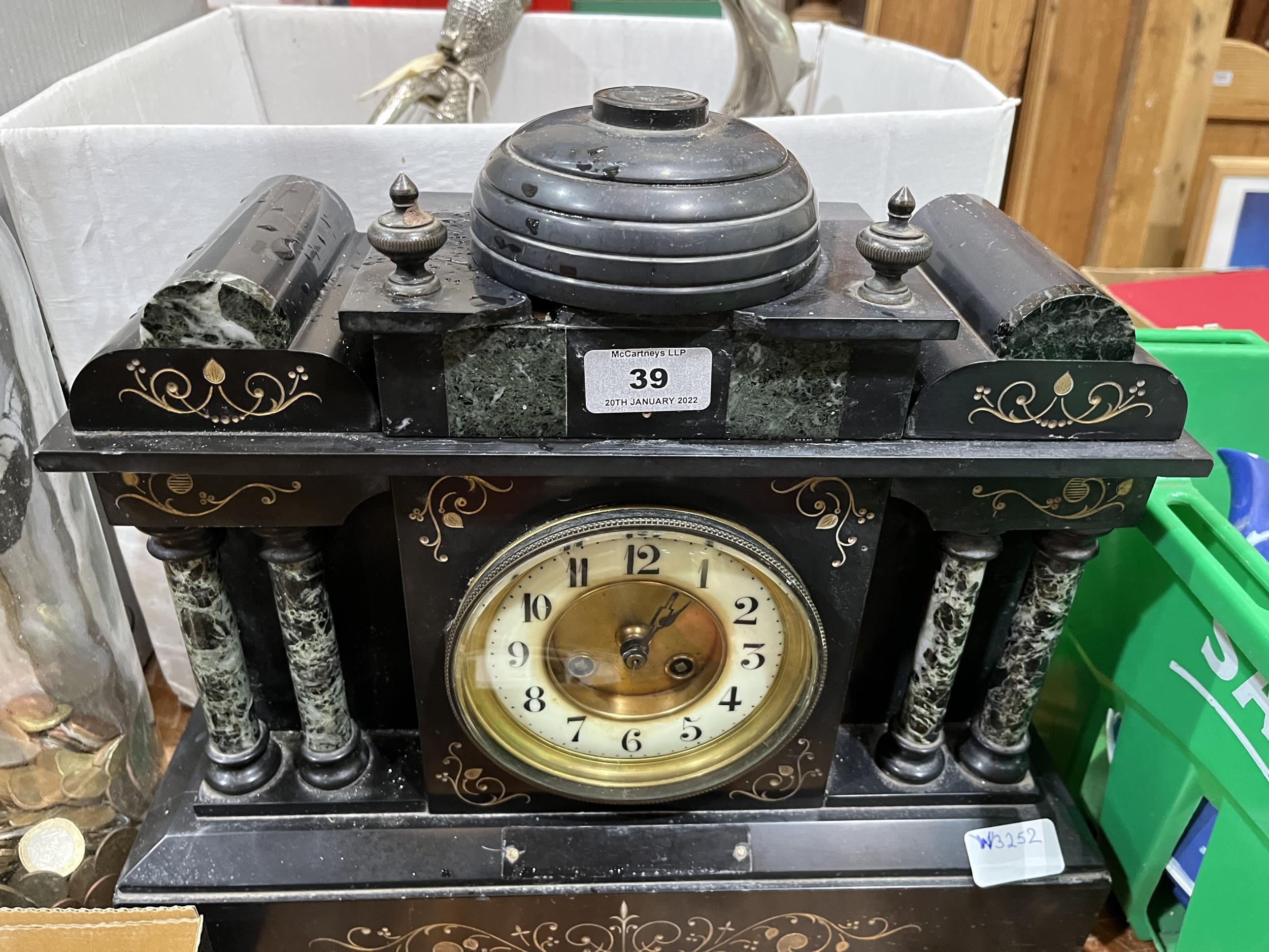 A late 19th century French slate and marble mantle clock. 14' high