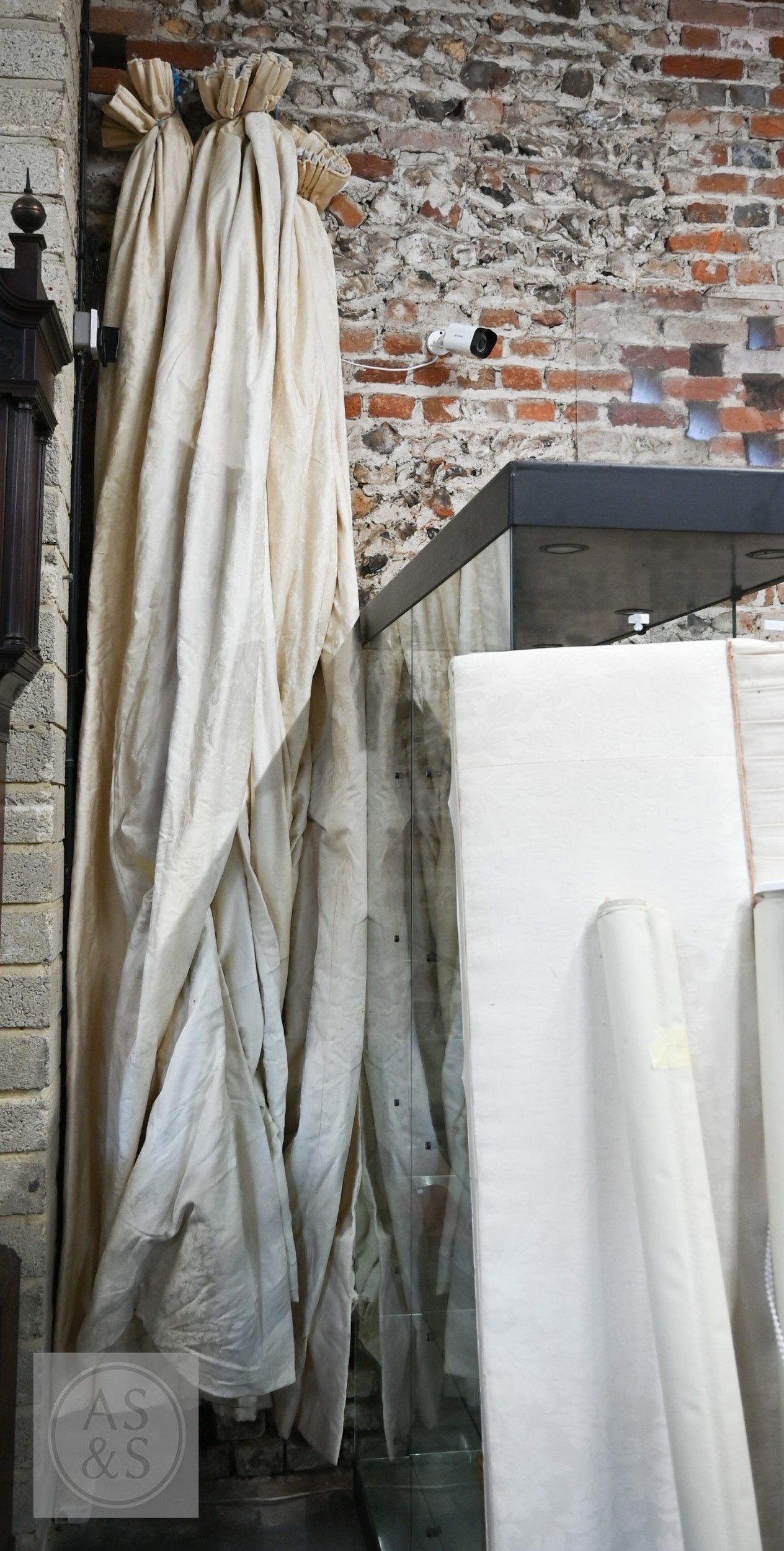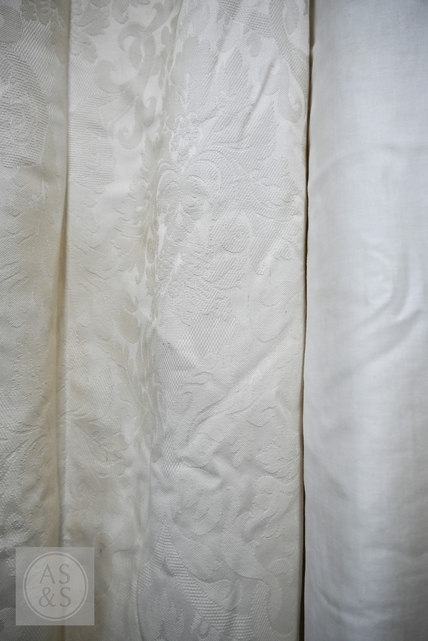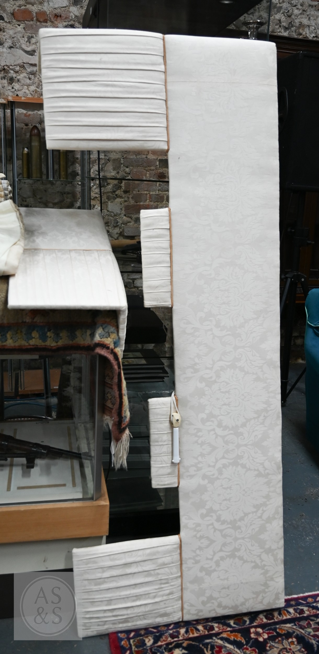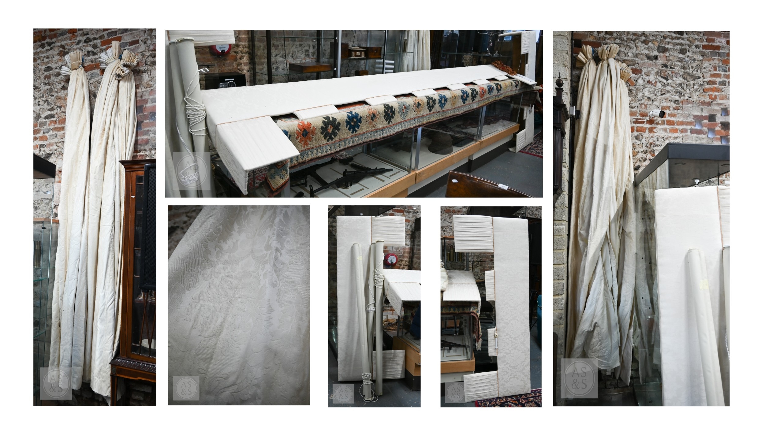 Country house interlined curtains with matching pelmets and blinds for repurposing, as removed, sizes as labelled, discoloured