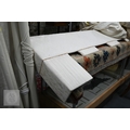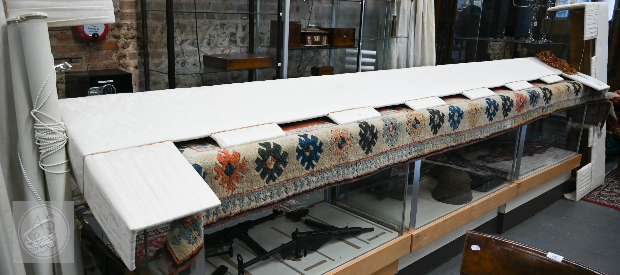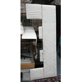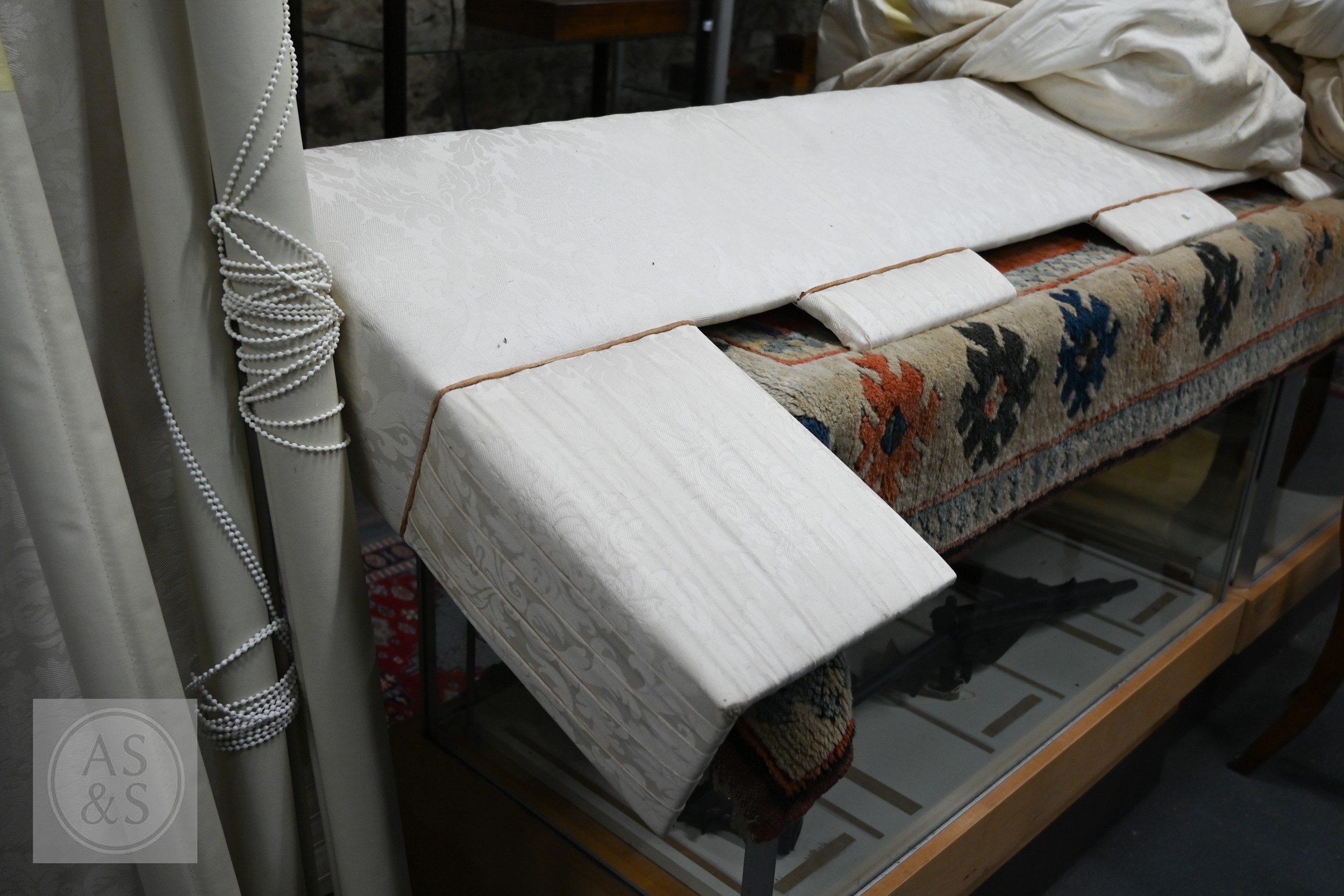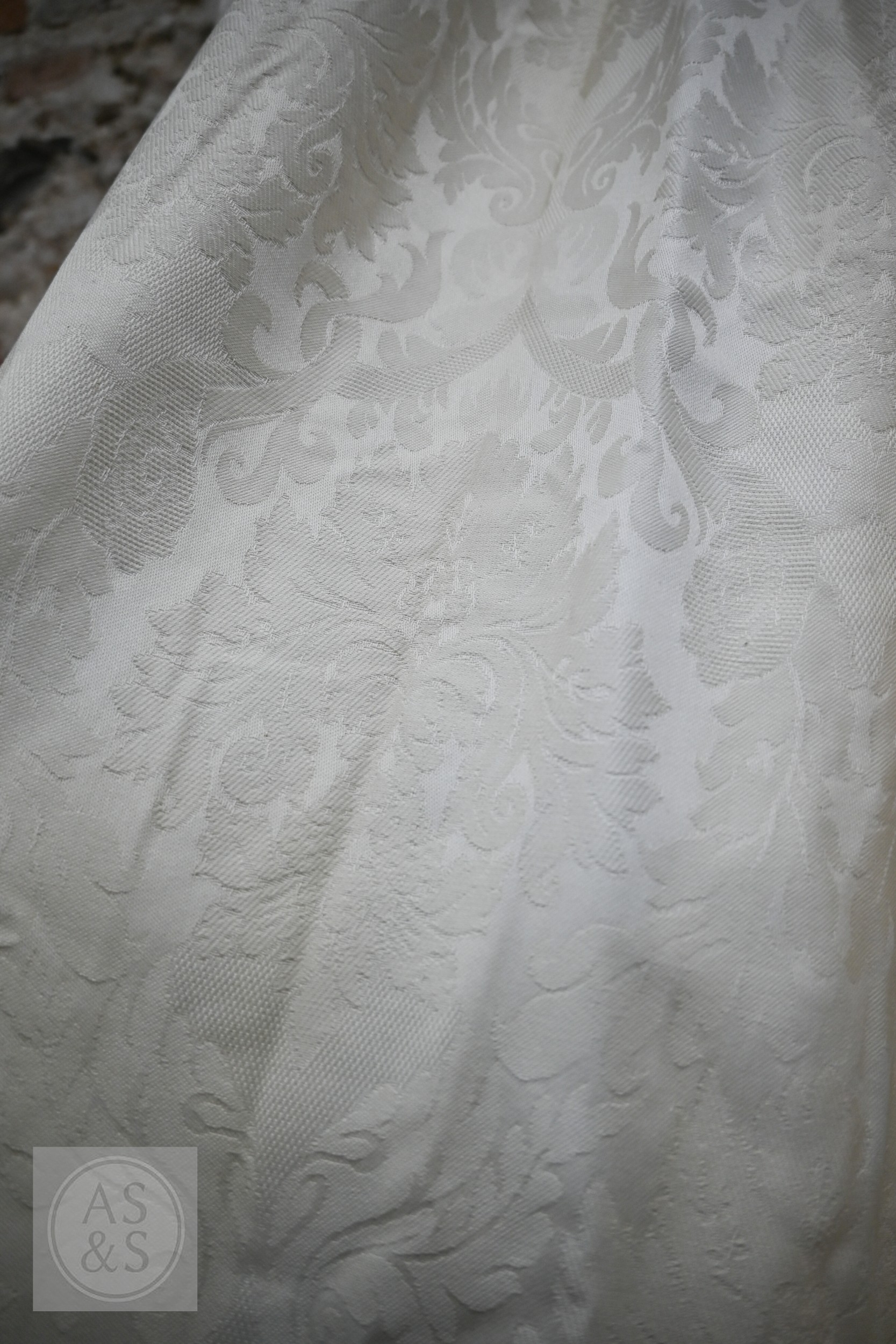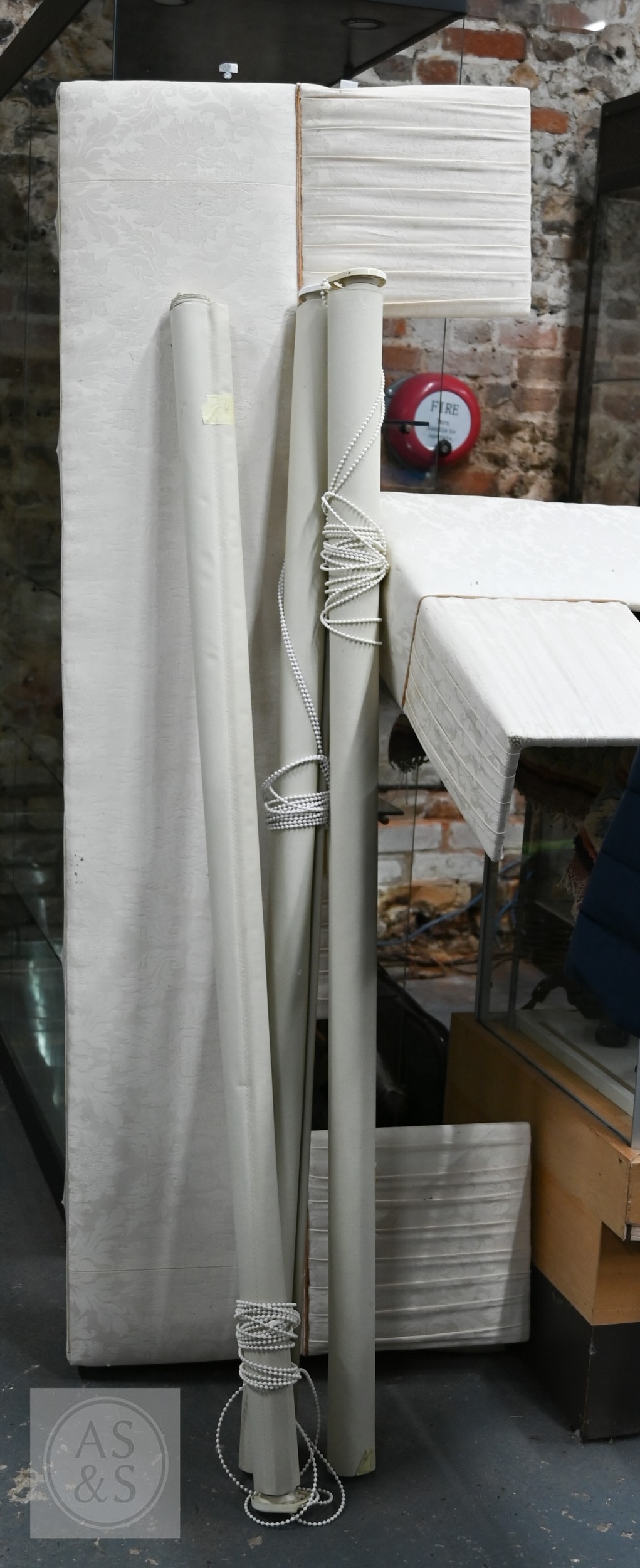 Country house interlined curtains with matching pelmets and blinds for repurposing, as removed, sizes as labelled, discoloured