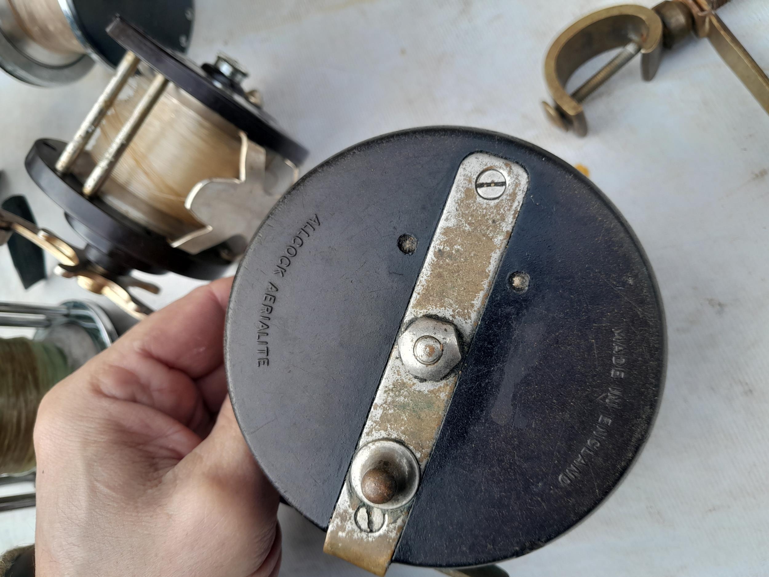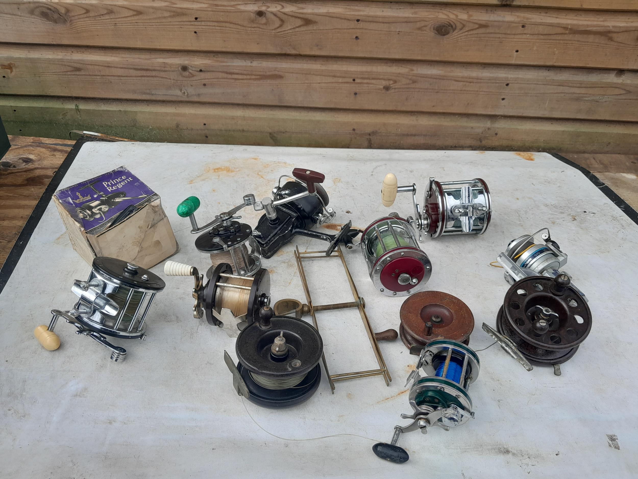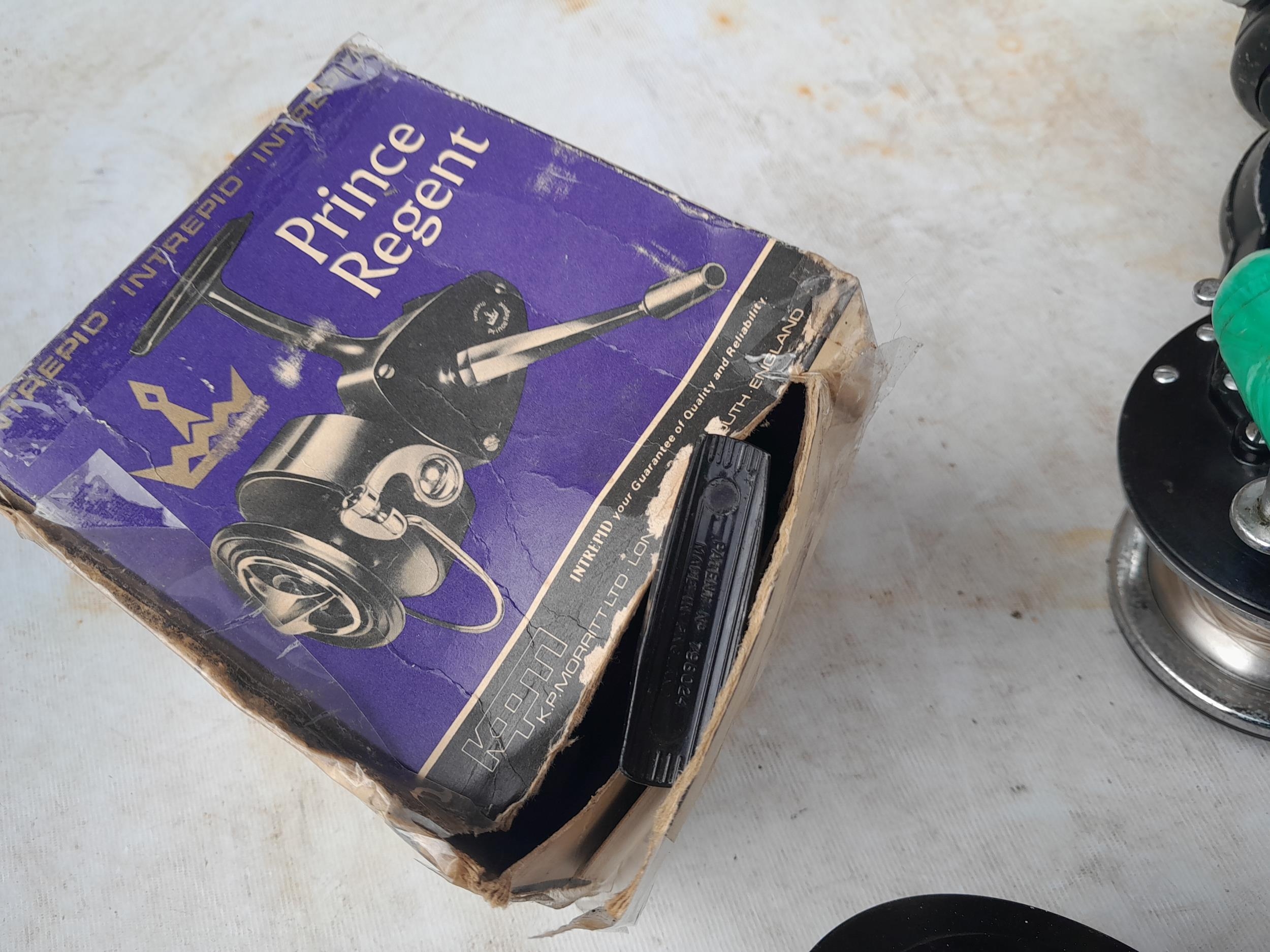 Interesting array of vintage fishing reels : multipliers by Penn, Shakespeare, Allcock Arielite, Intrepid Prince centre pin with box