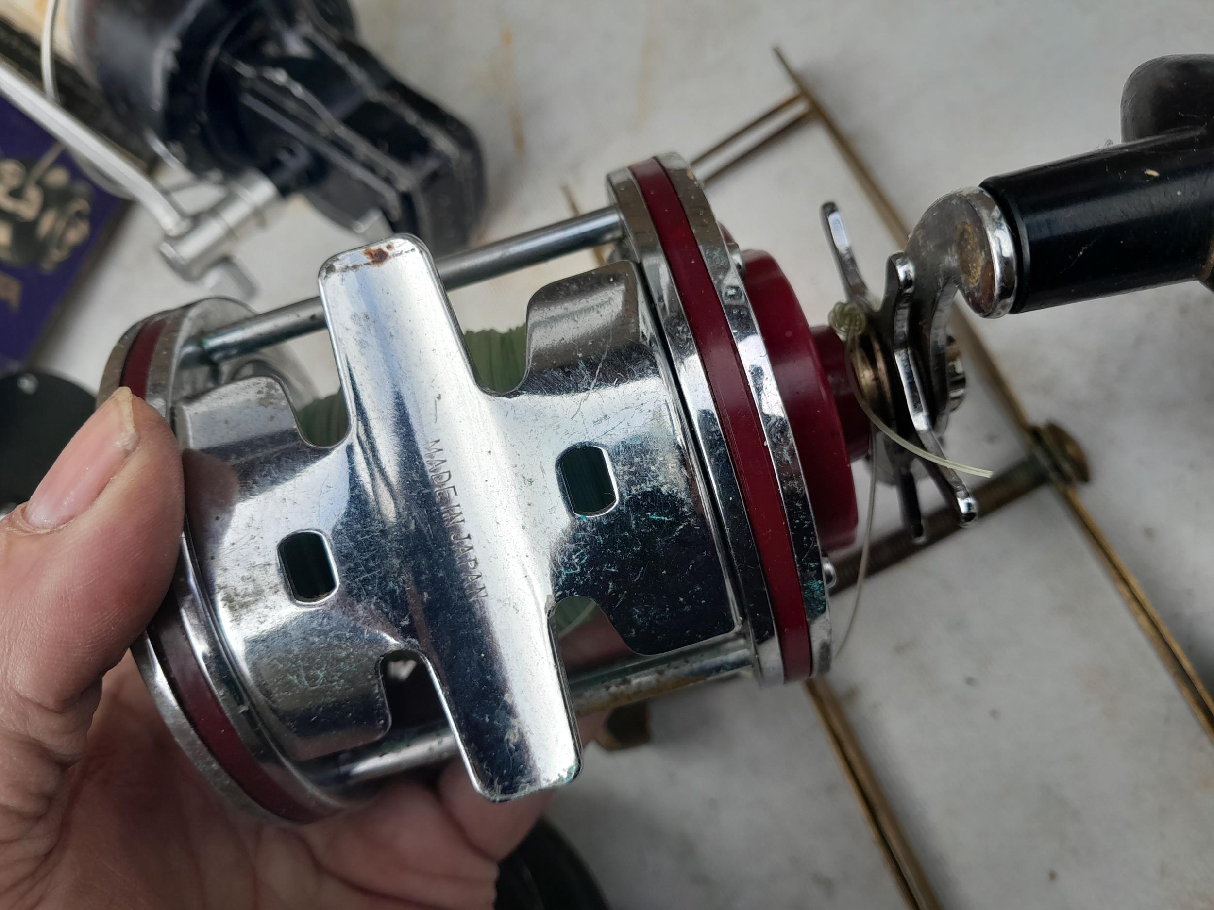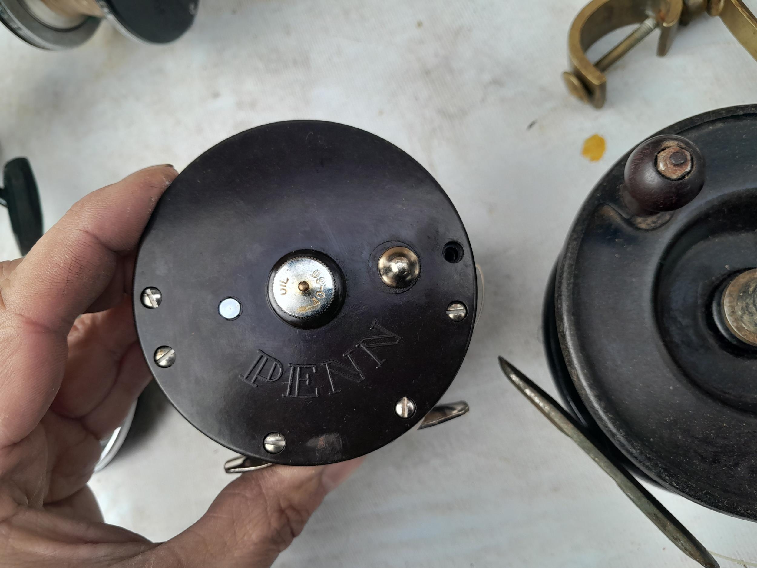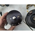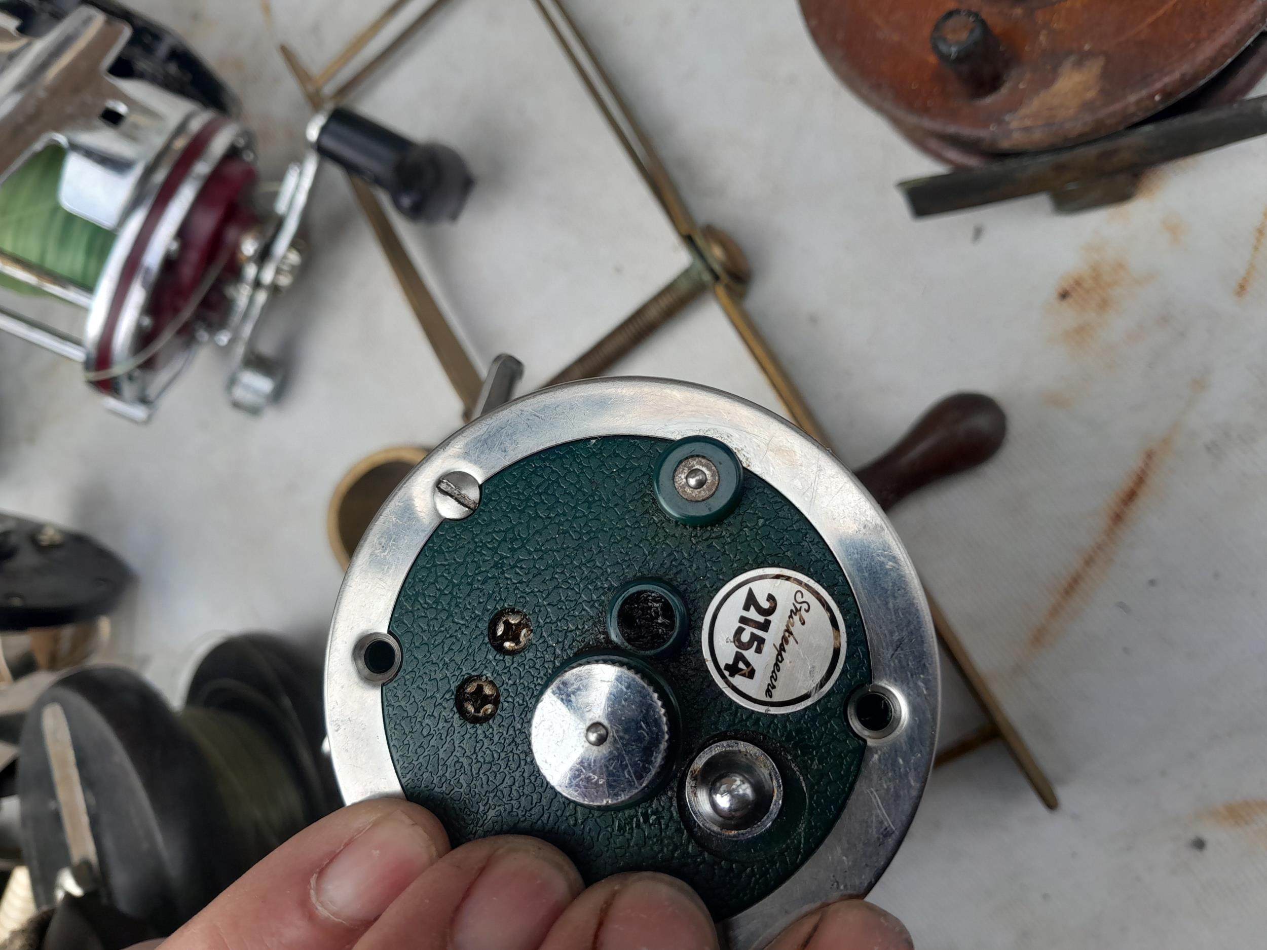 Interesting array of vintage fishing reels : multipliers by Penn, Shakespeare, Allcock Arielite, Intrepid Prince centre pin with box