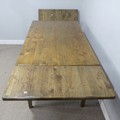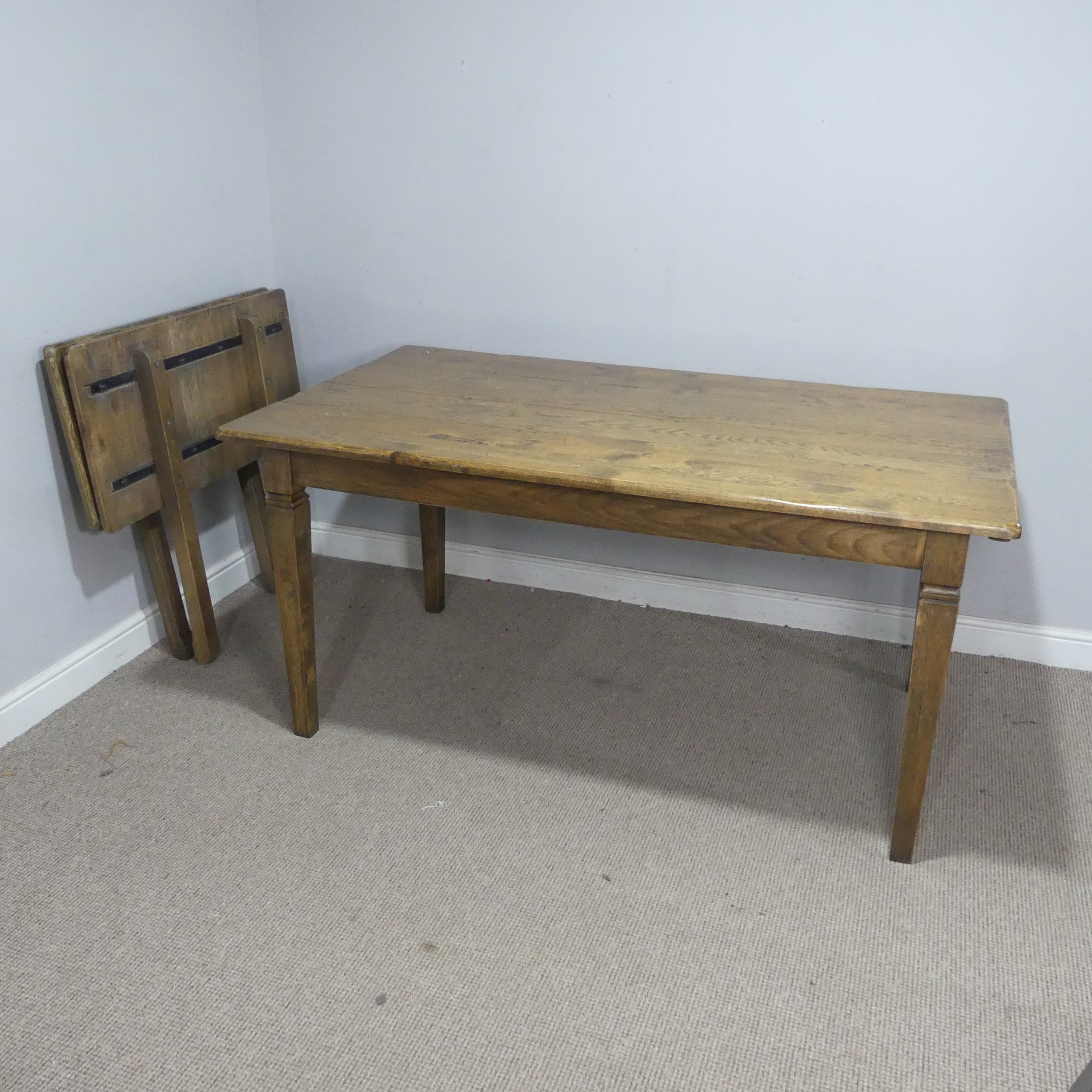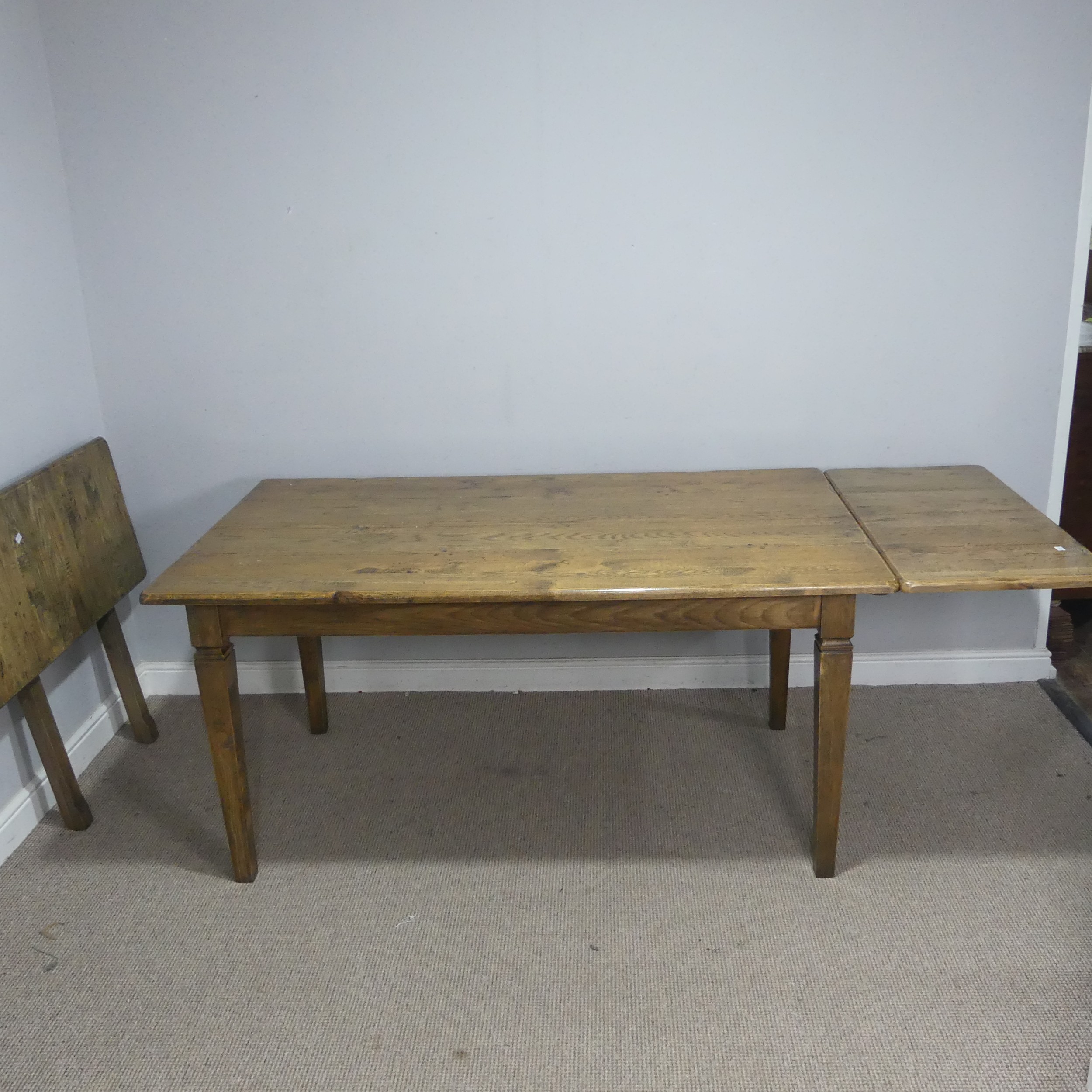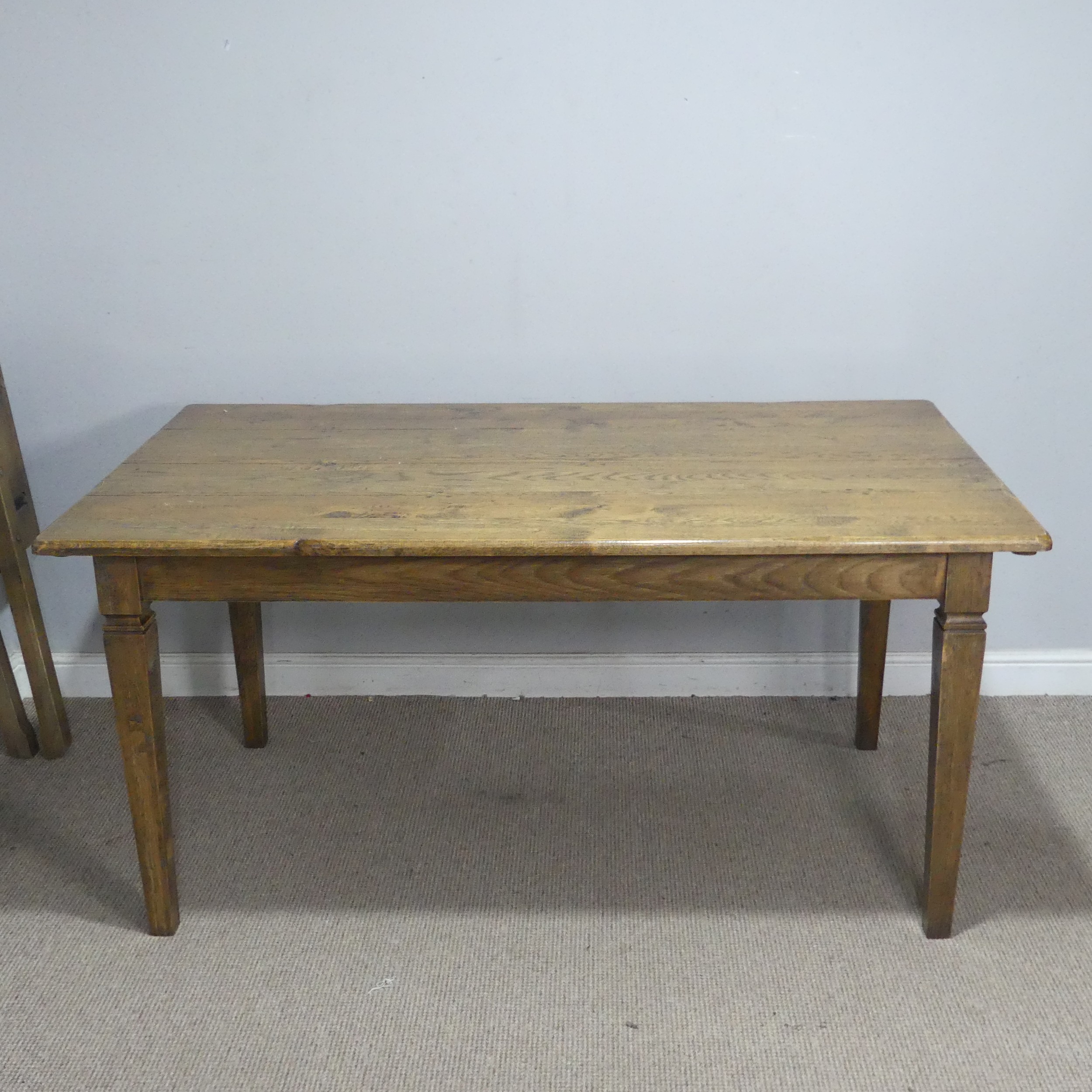 A bespoke antique-style oak dining Table, with two additional leaves, raised on tapering supports, W 90 cm x H 77 cm x D 250 cm.