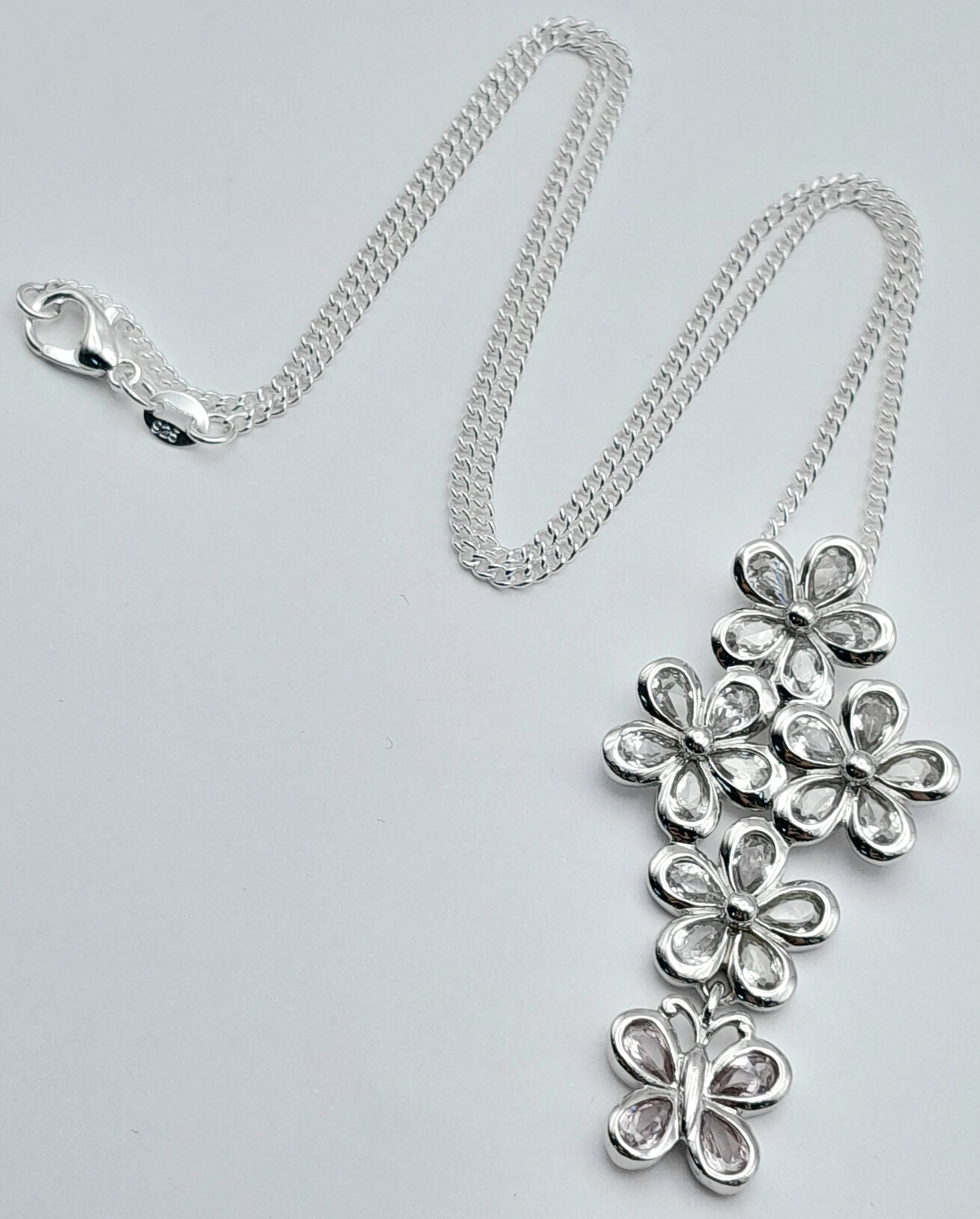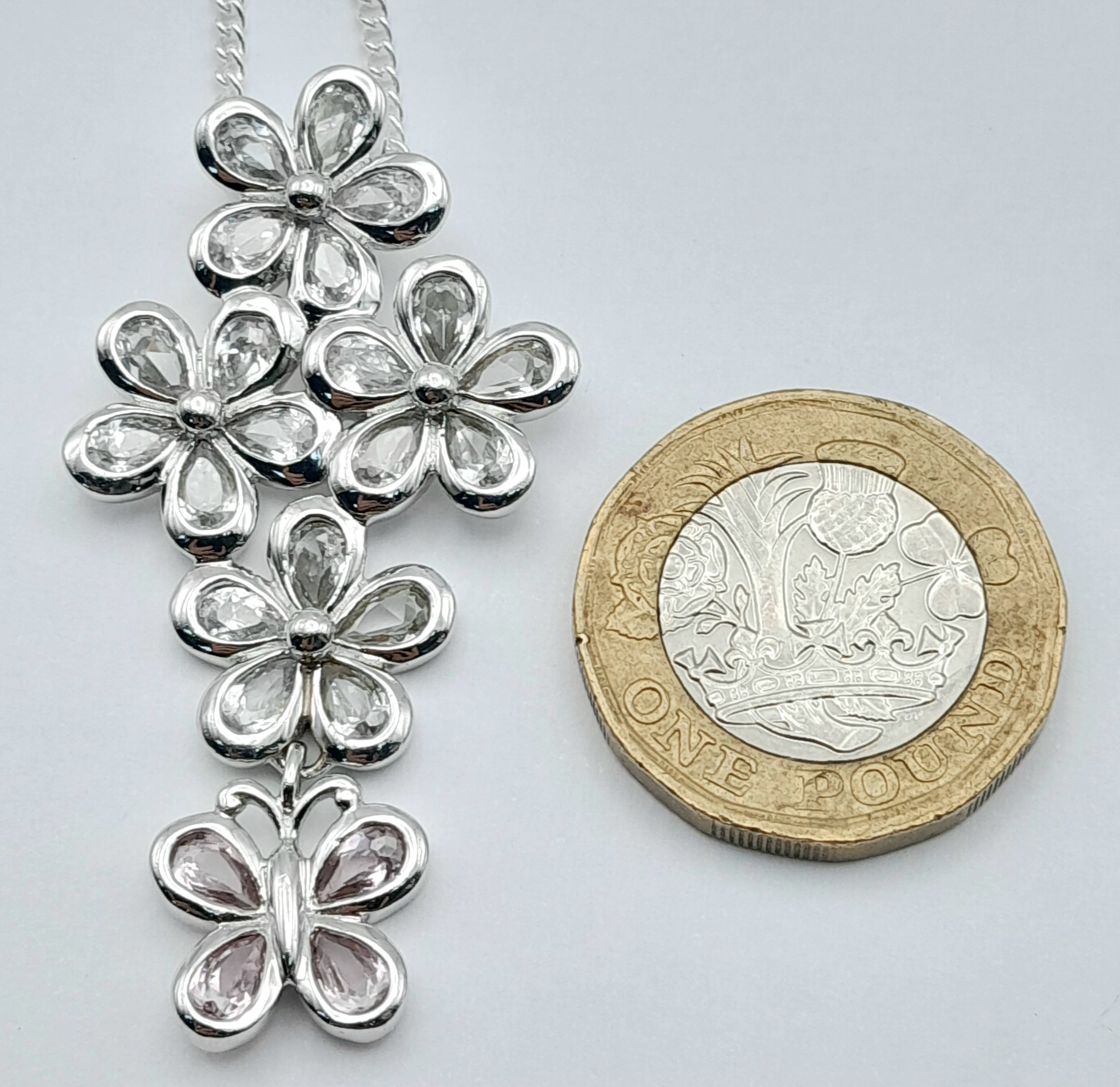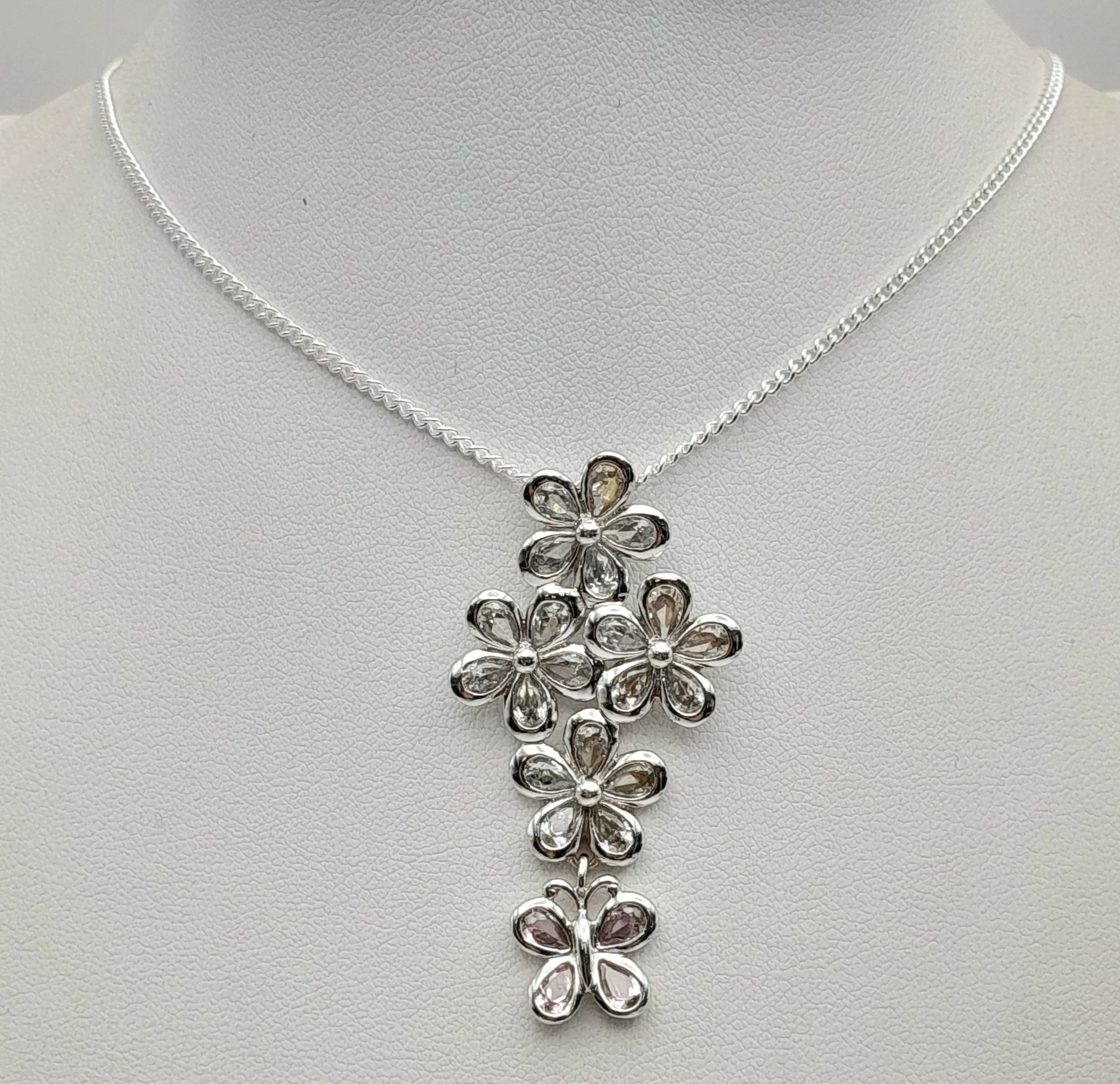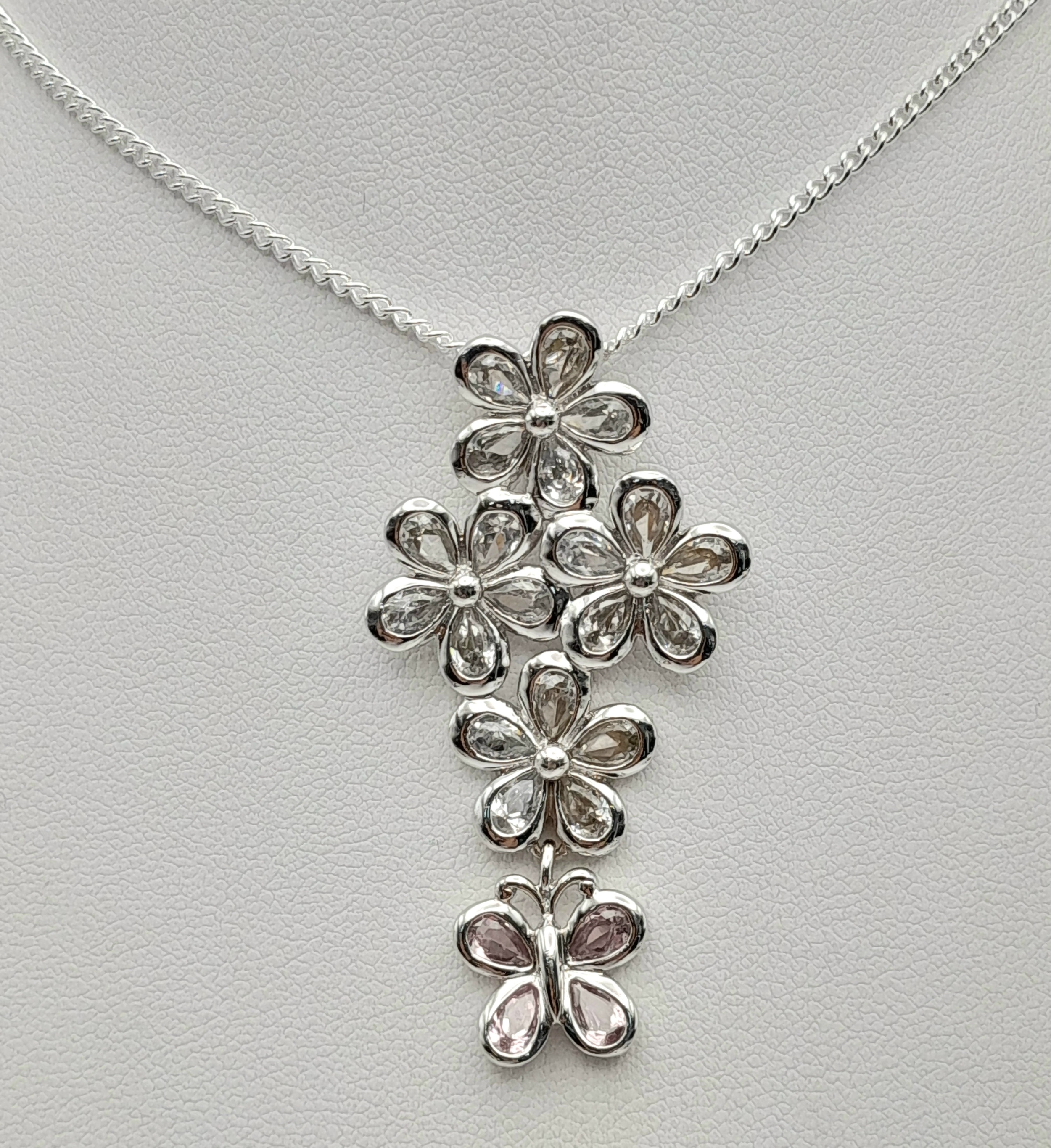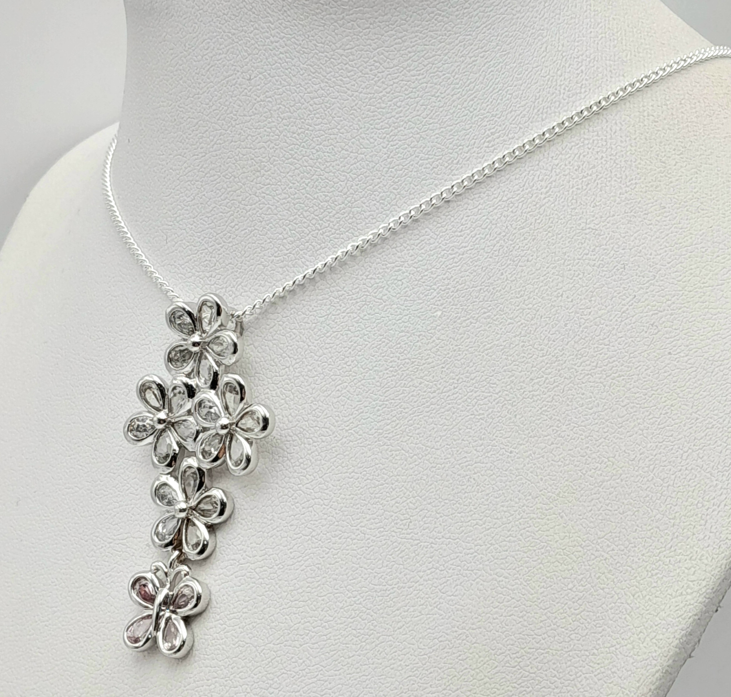 A Pretty Sterling Silver Pink and White Diamonique Cubic Zirconia Pendant Necklace. 46cm Length Chain. The Pendant measures 4.8cm Length and is 2.3cm wide at its widest point. The Necklace has a gross weight of 11.59 Grams