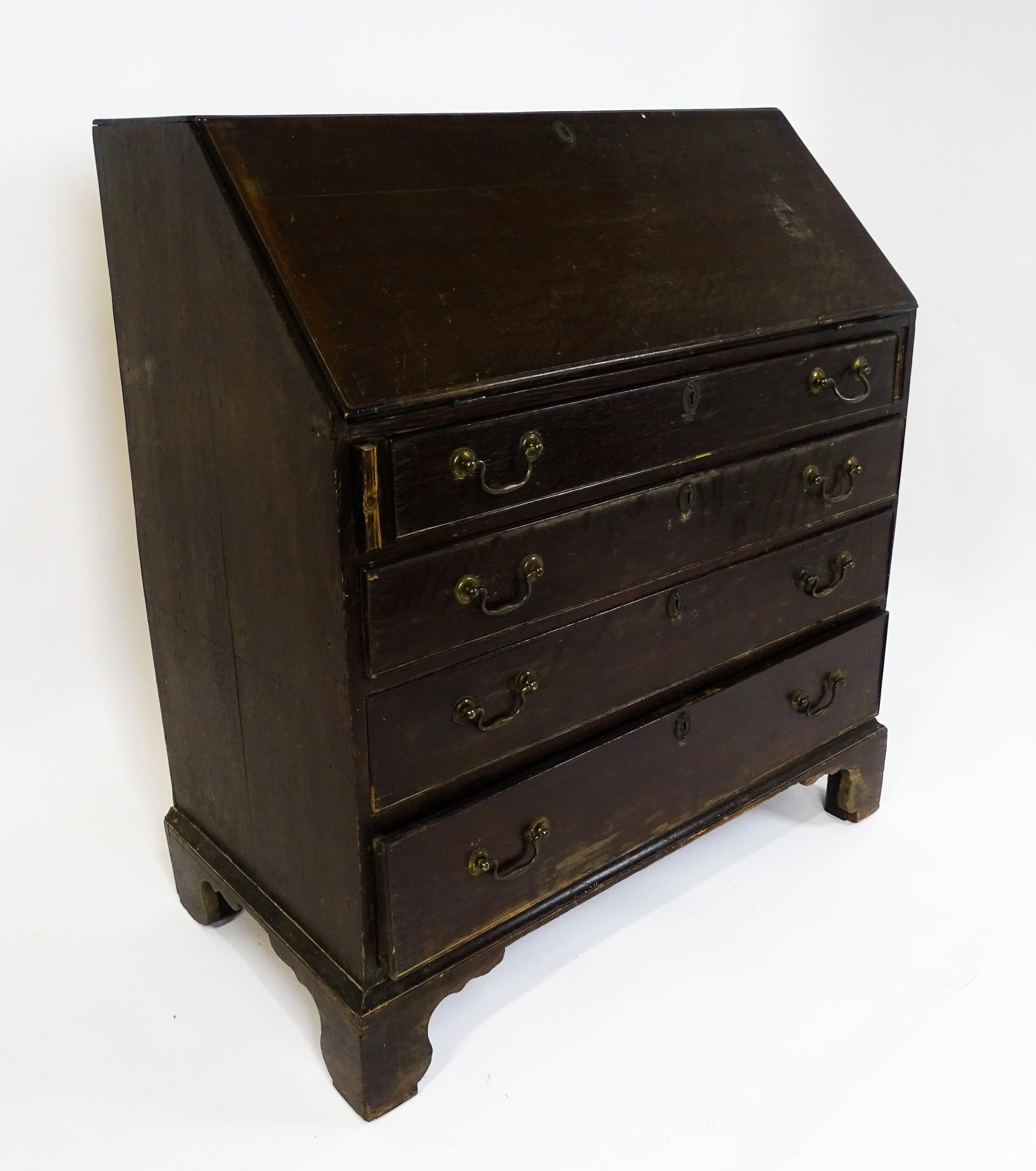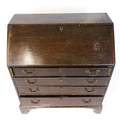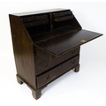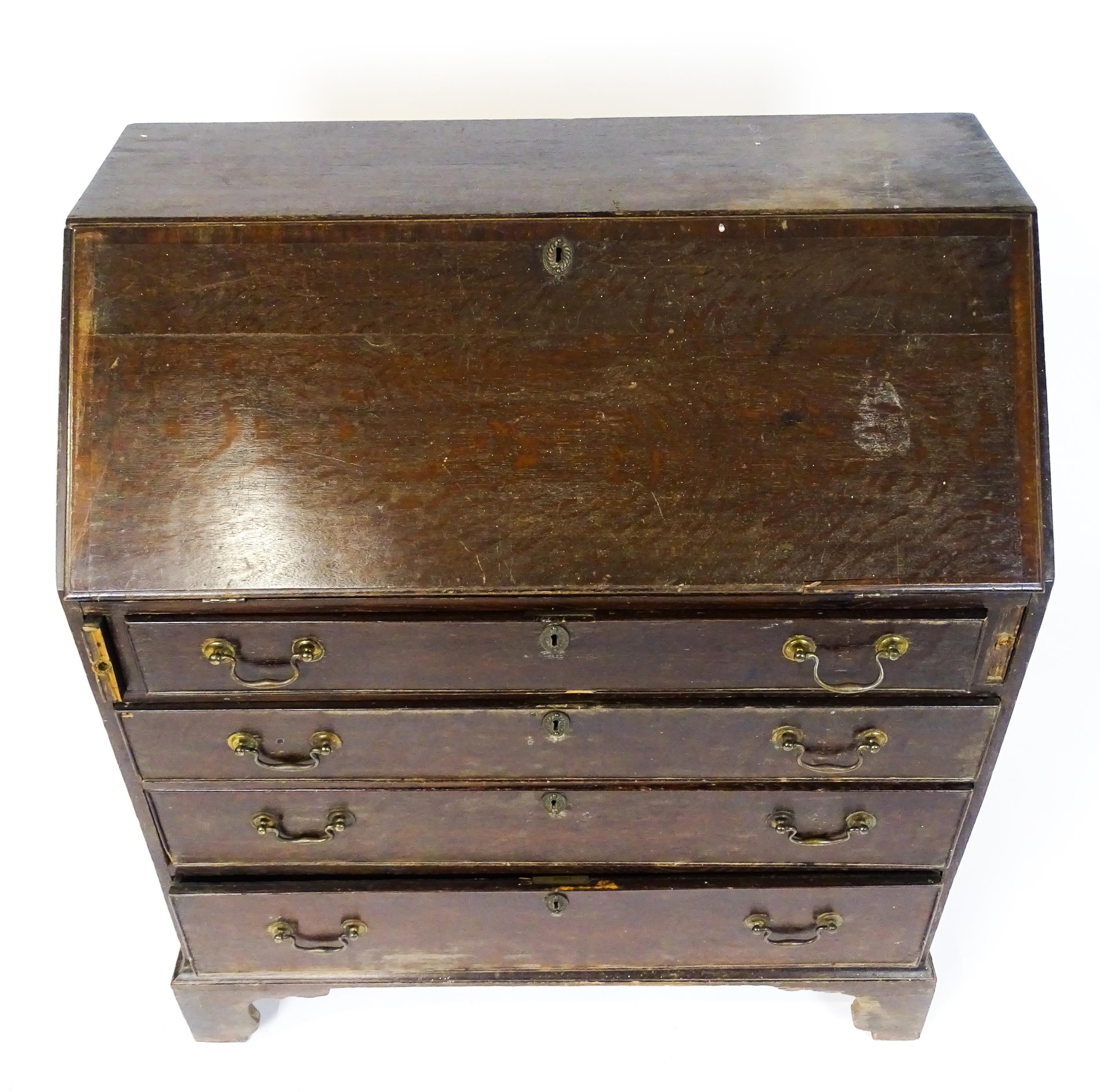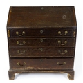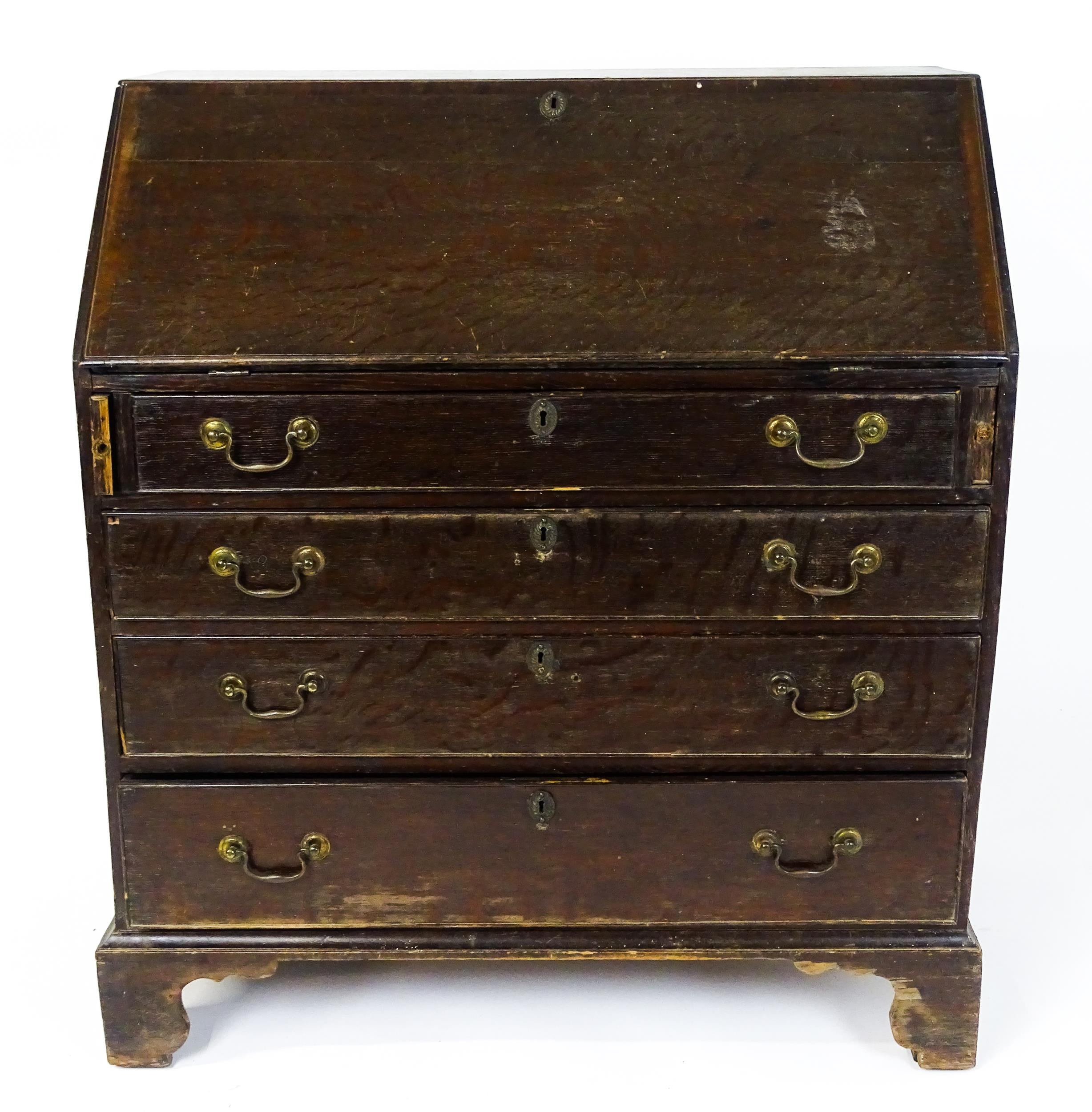A early 19thC oak bureau, the fall front enclosing compartments to the interior and with four full-length drawers. Approx 39 1/4" wide, 43" high, 20 1/2" deep