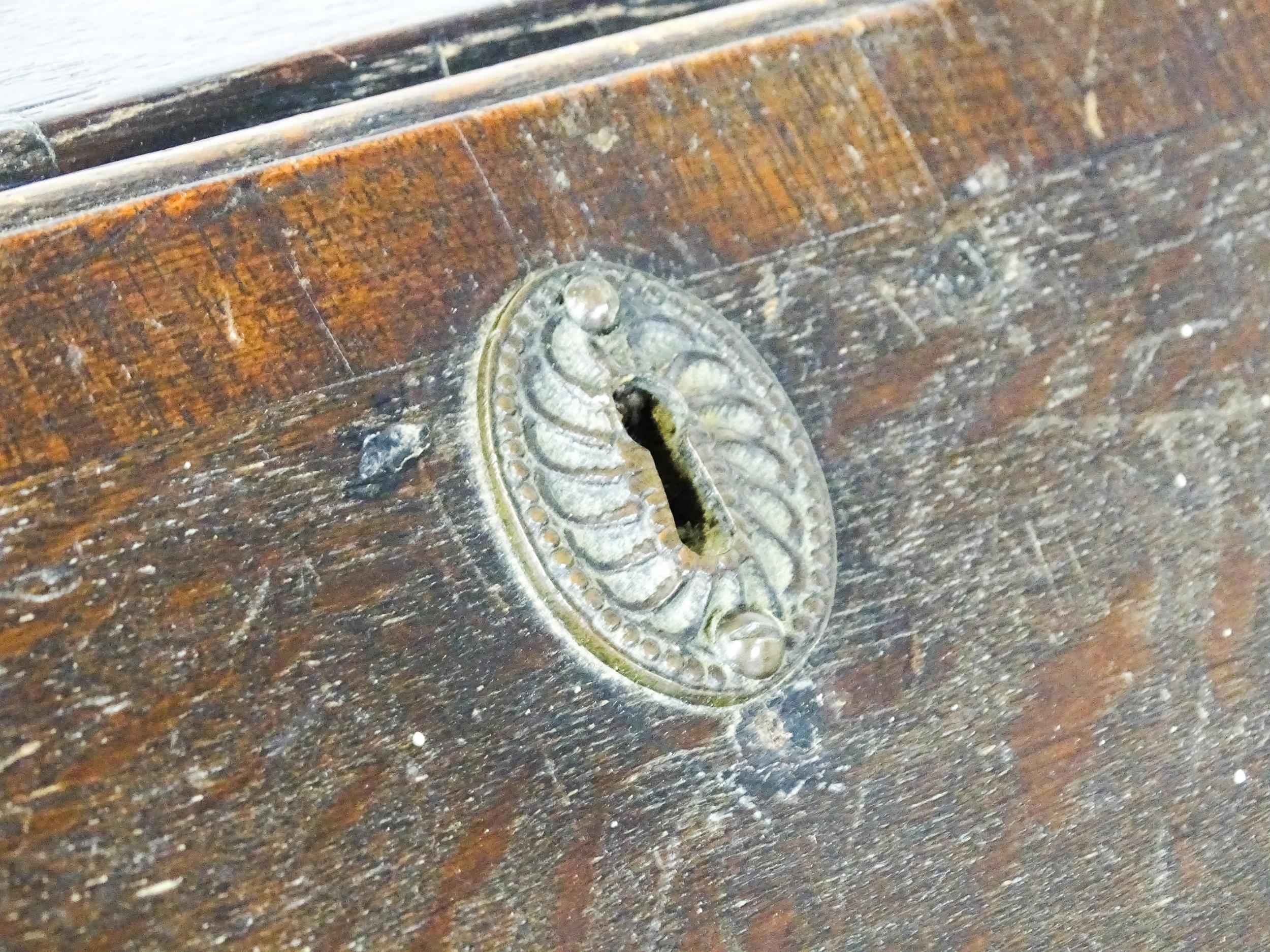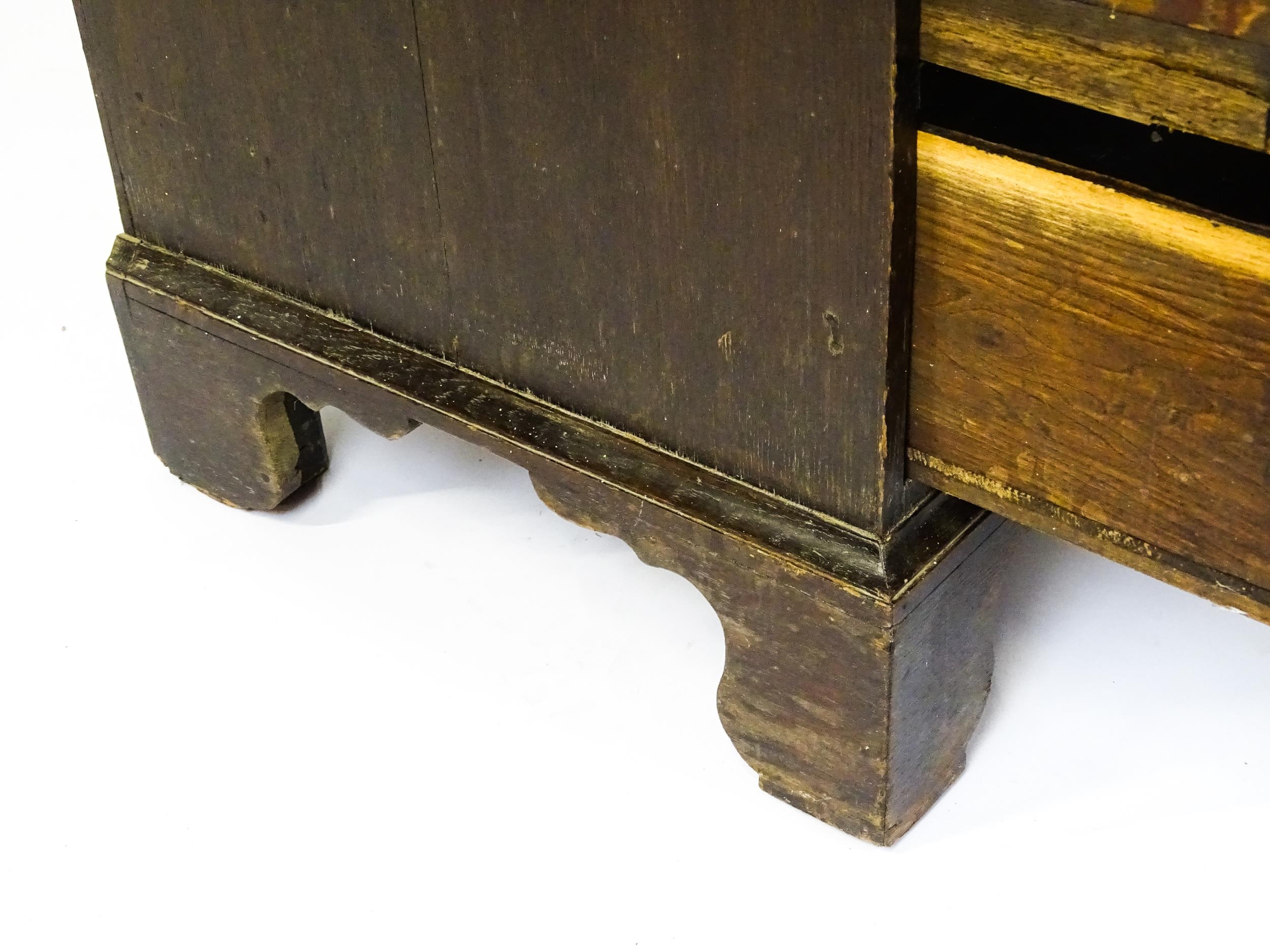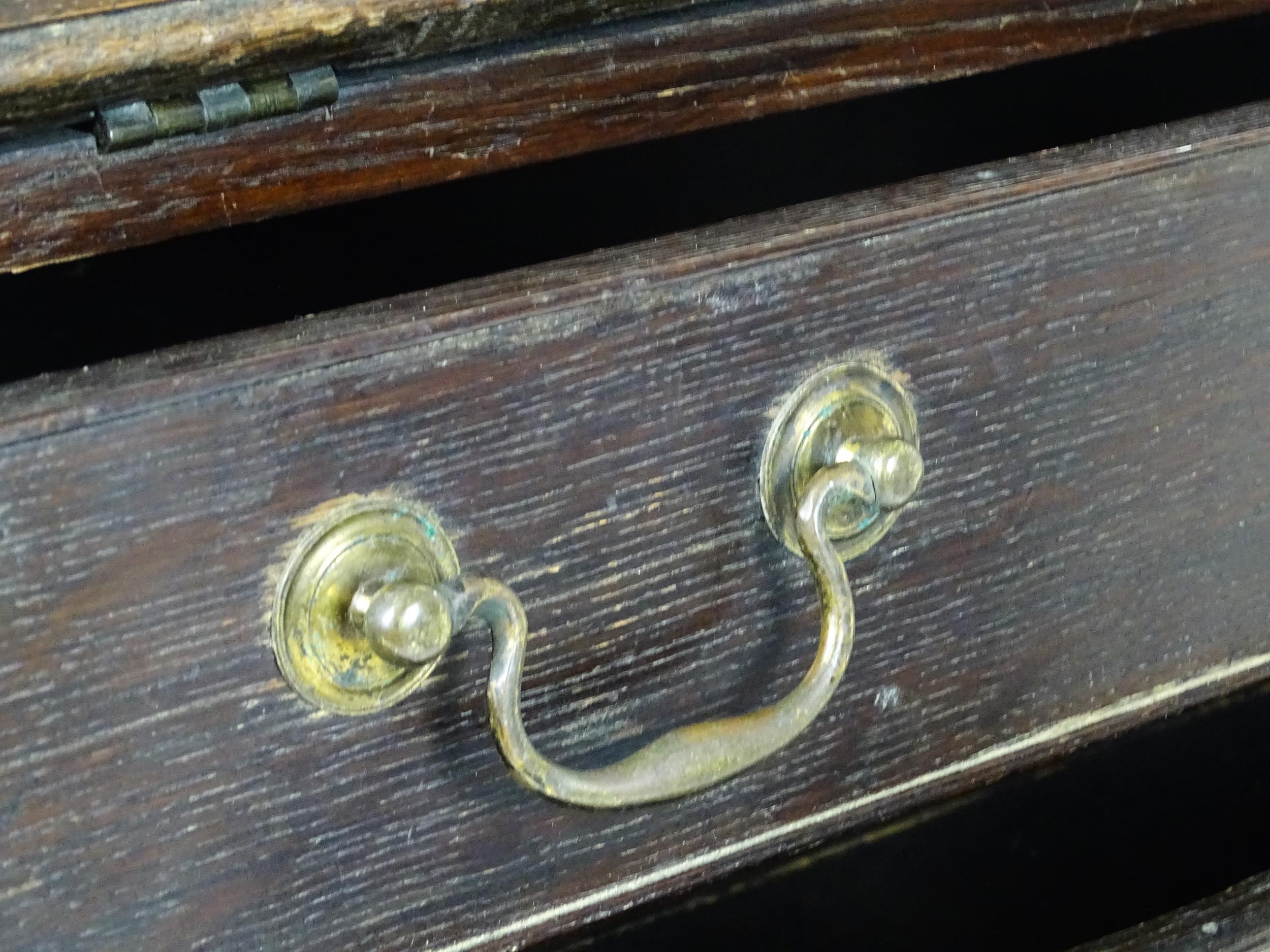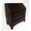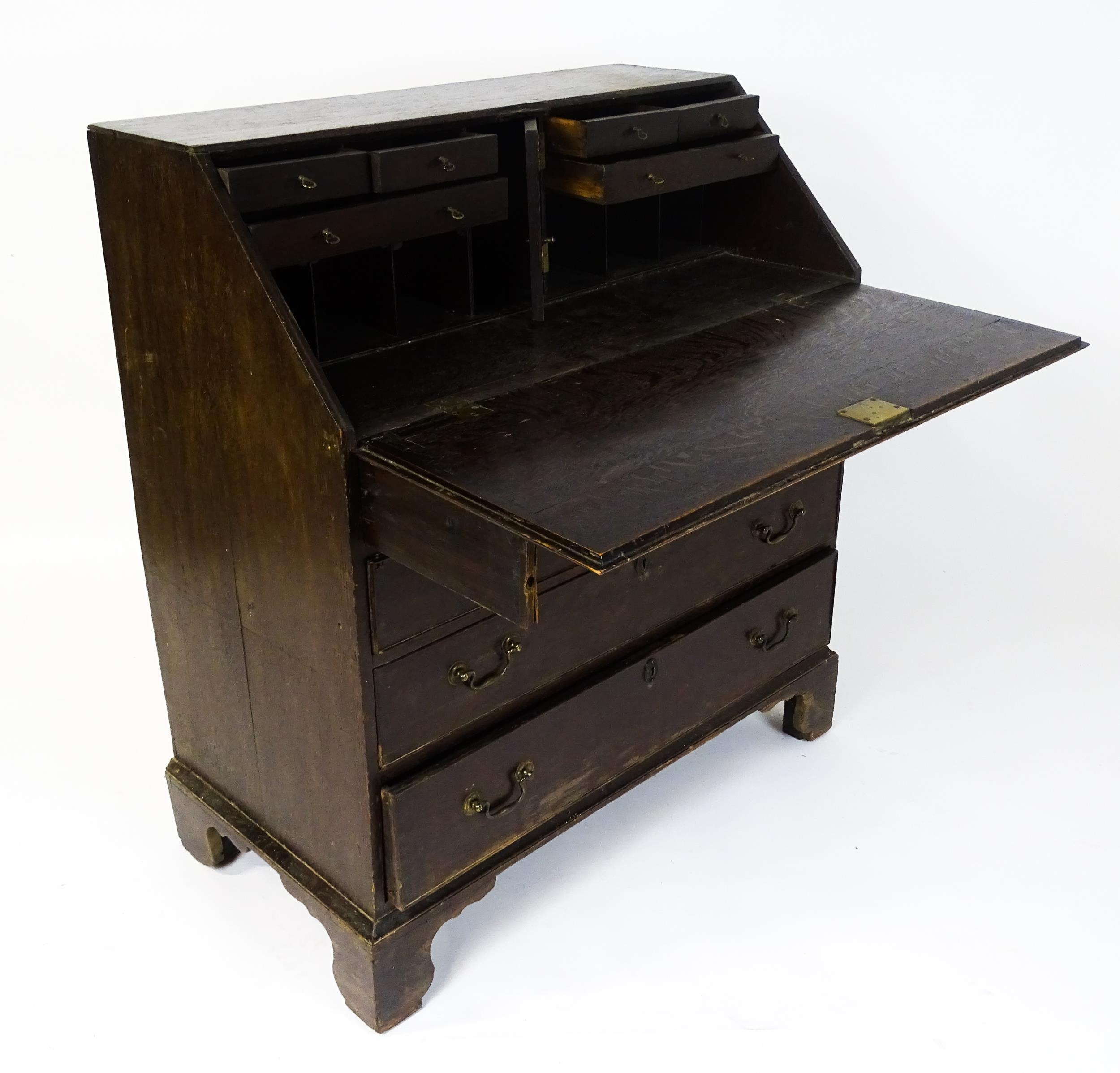 A early 19thC oak bureau, the fall front enclosing compartments to the interior and with four full-length drawers. Approx 39 1/4" wide, 43" high, 20 1/2" deep