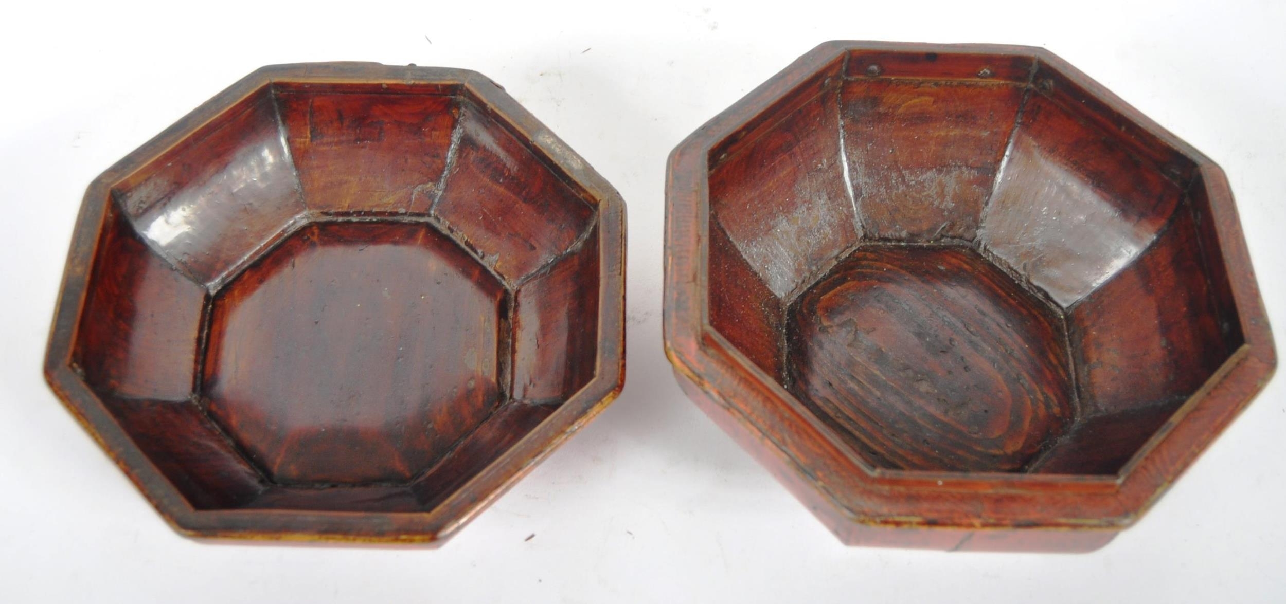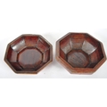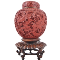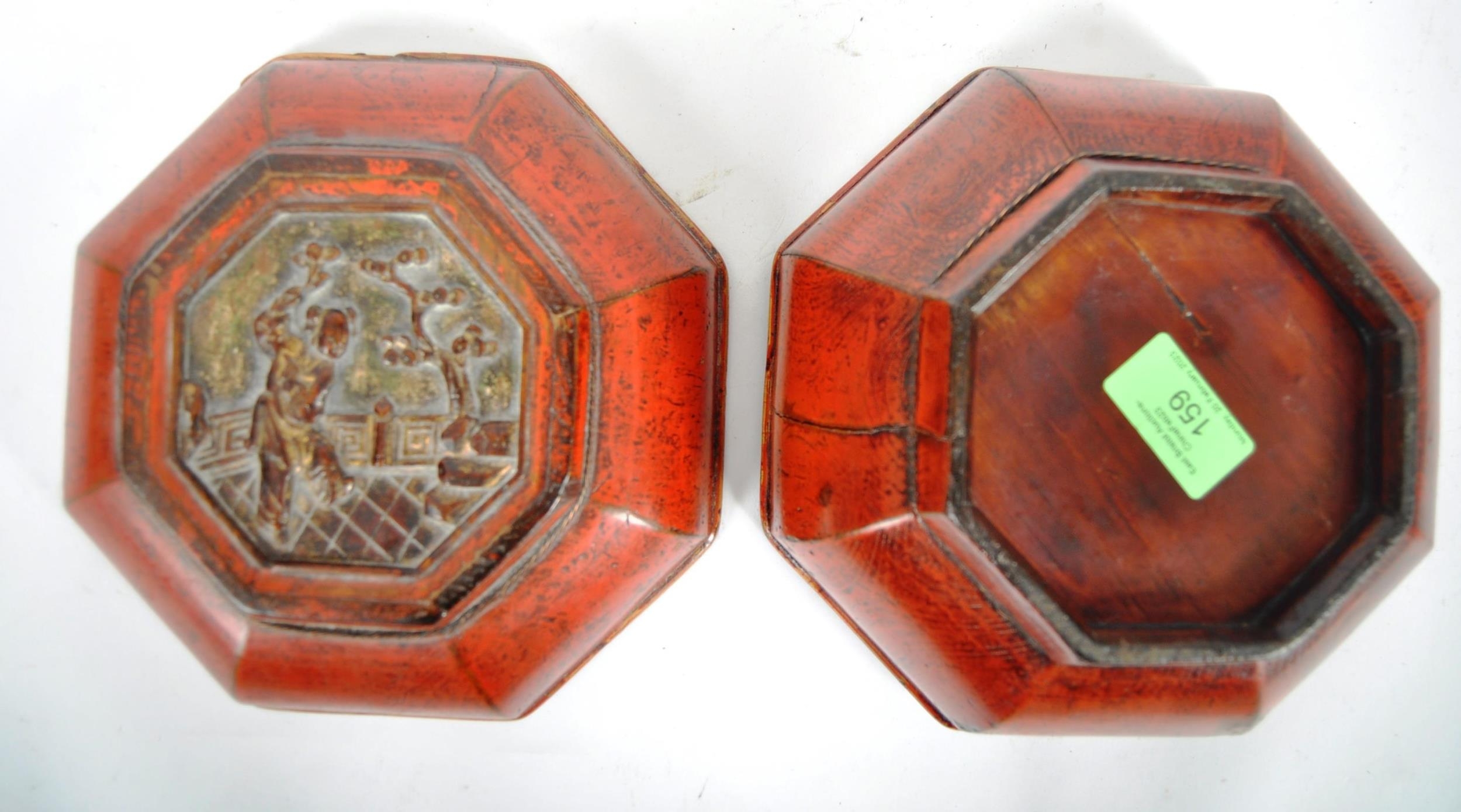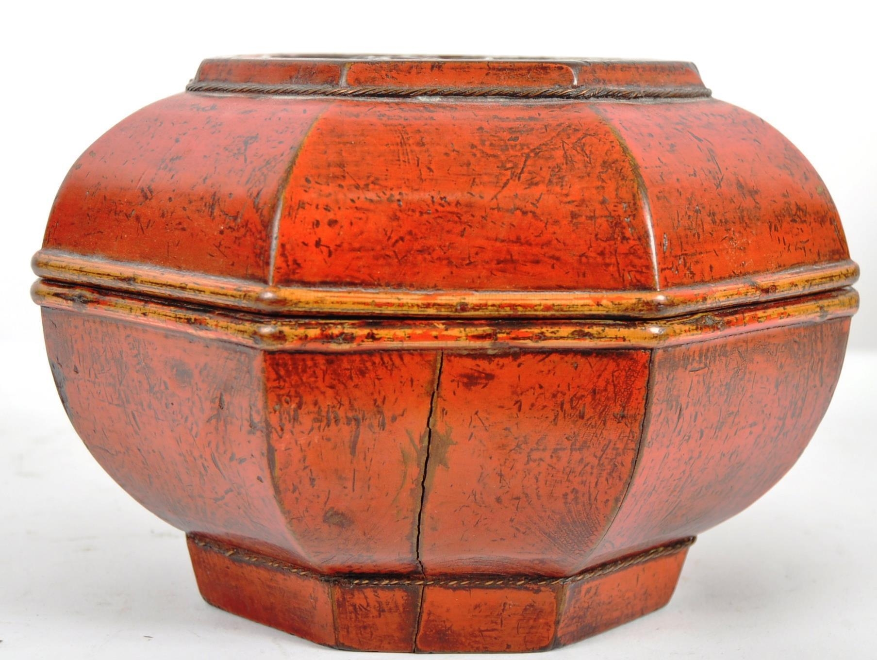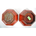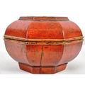 An early 20th Century Chinese red lacquer storage box / lidded prayer box of cushioned hexagonal form. Carved gilt panel to top depicting child playing in garden scene. Measures approx; 13cm tall.