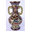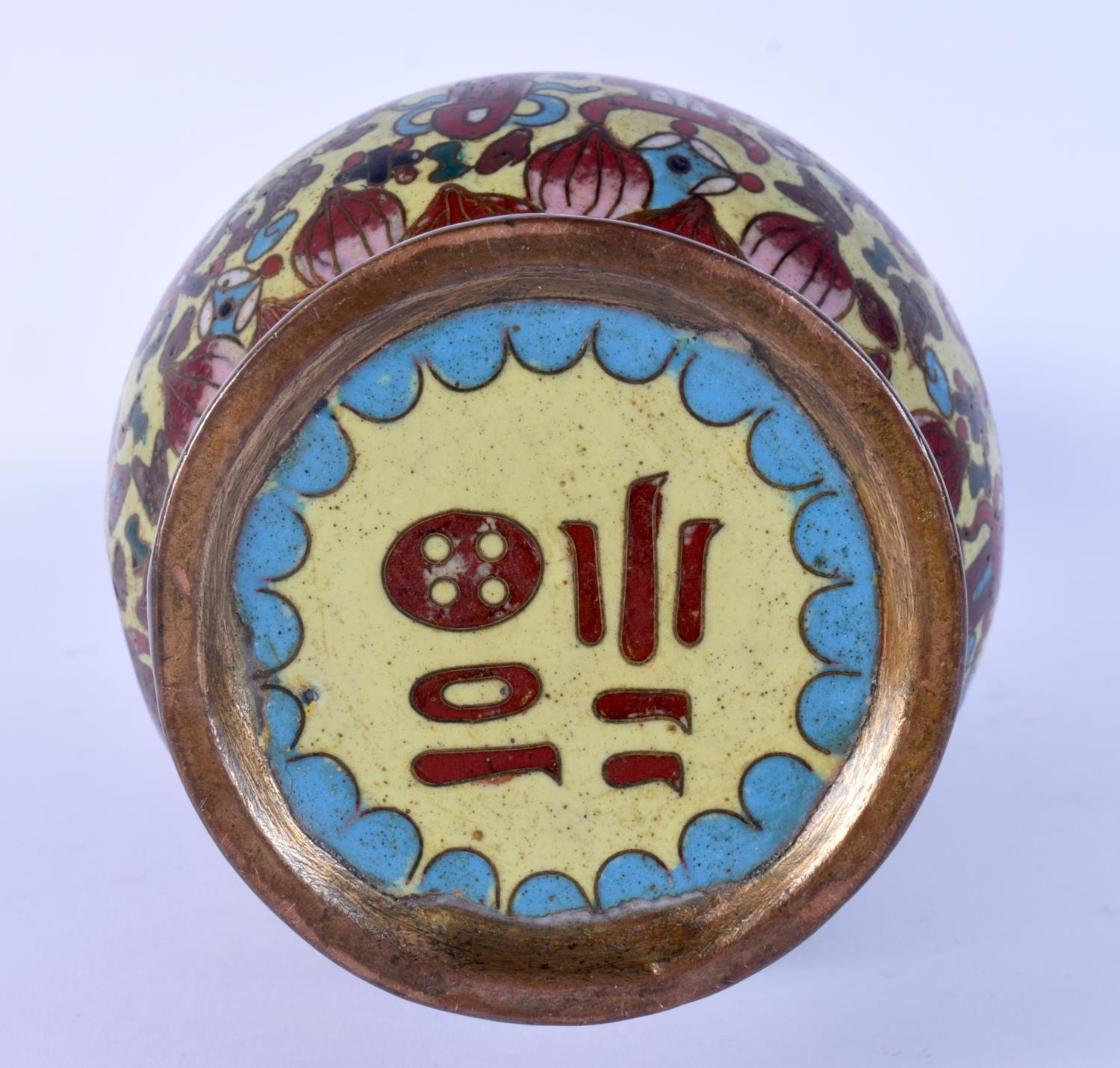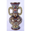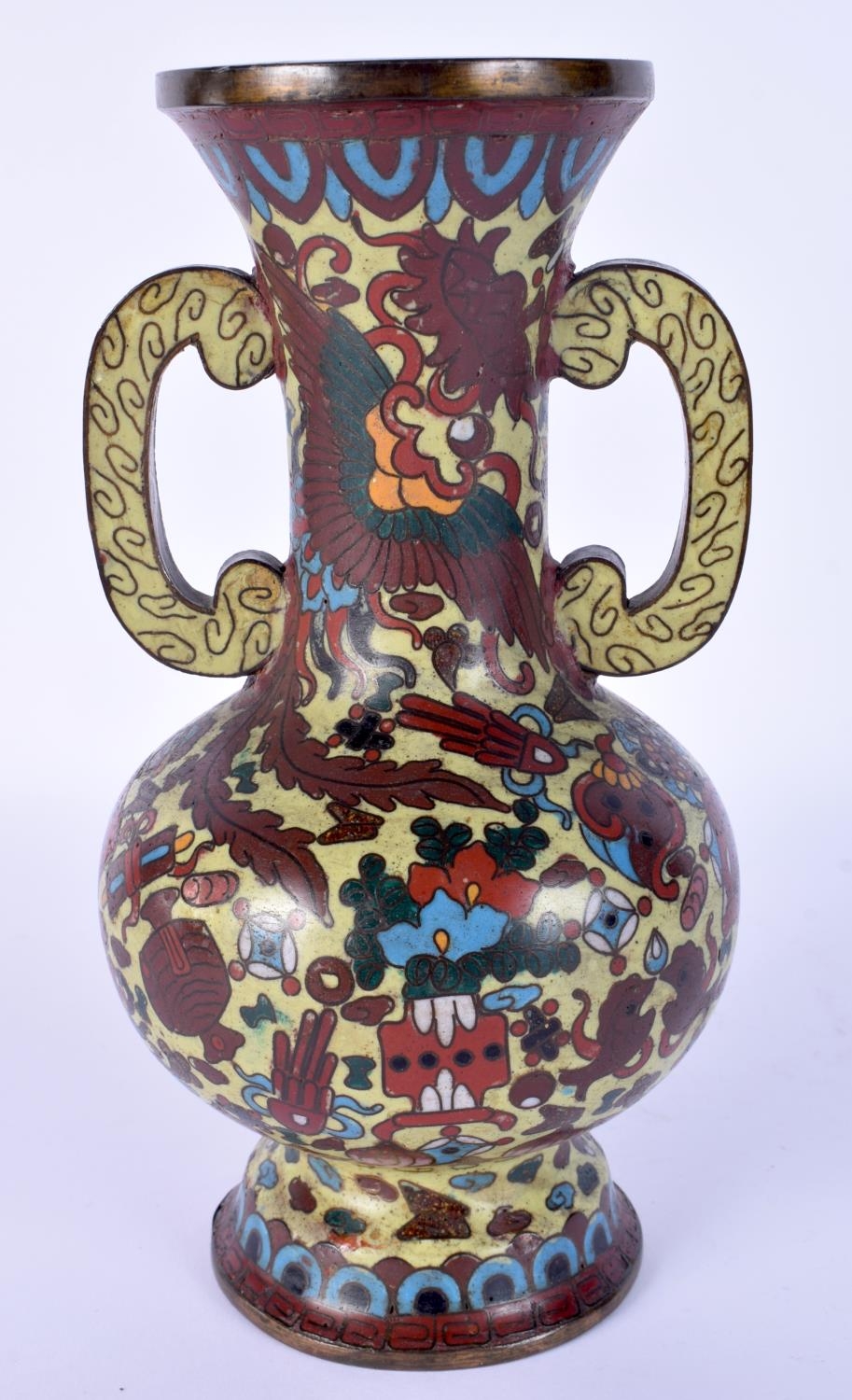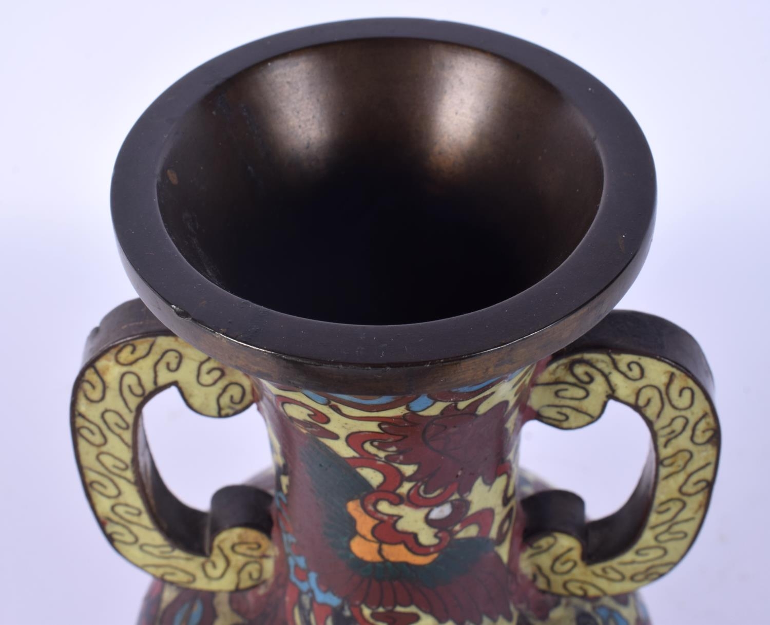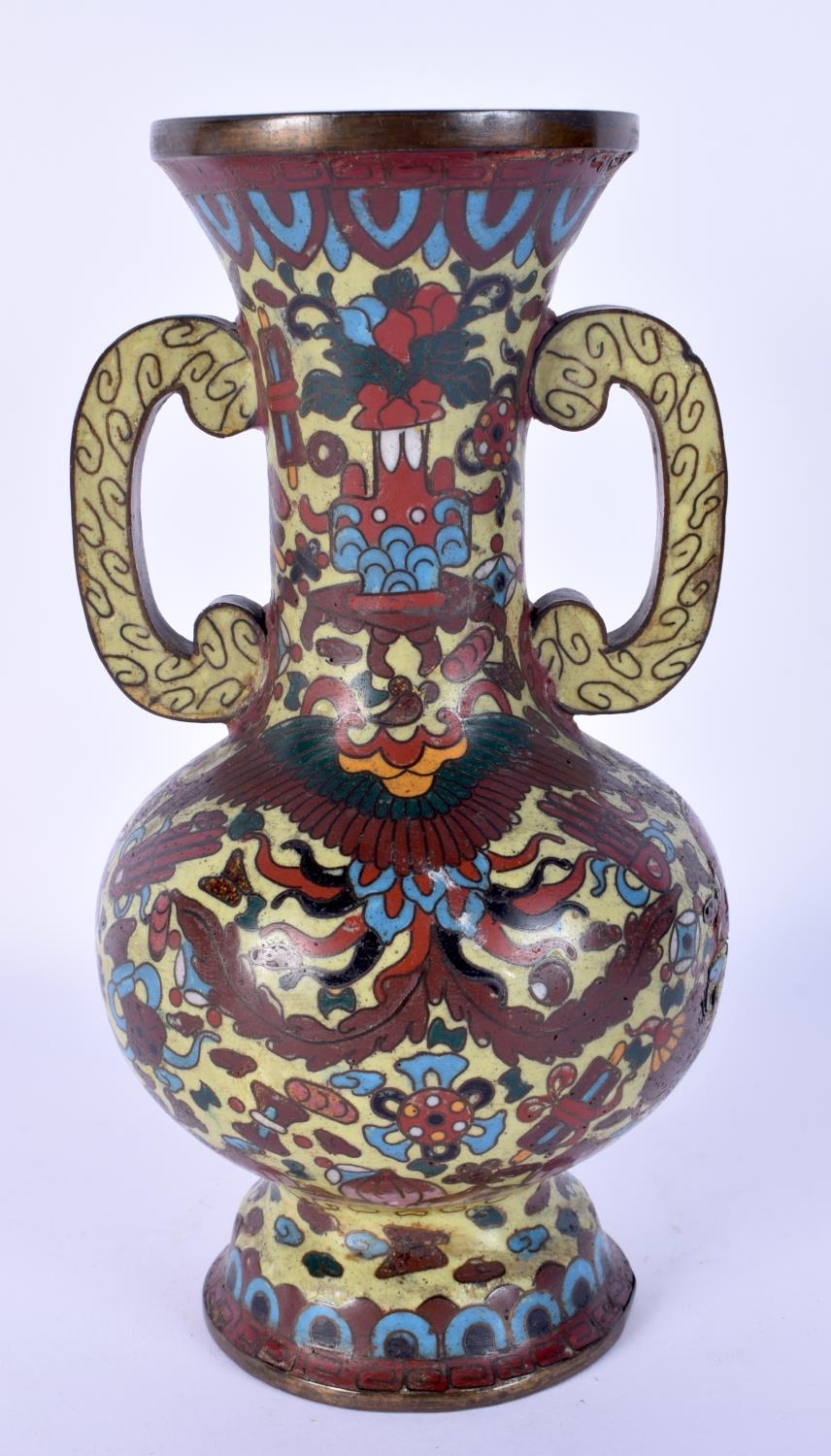 A 19TH CENTURY CHINESE TWIN HANDLED CLOISONNE ENAMEL VASE decorated with birds and foliage. 20 cm high.
