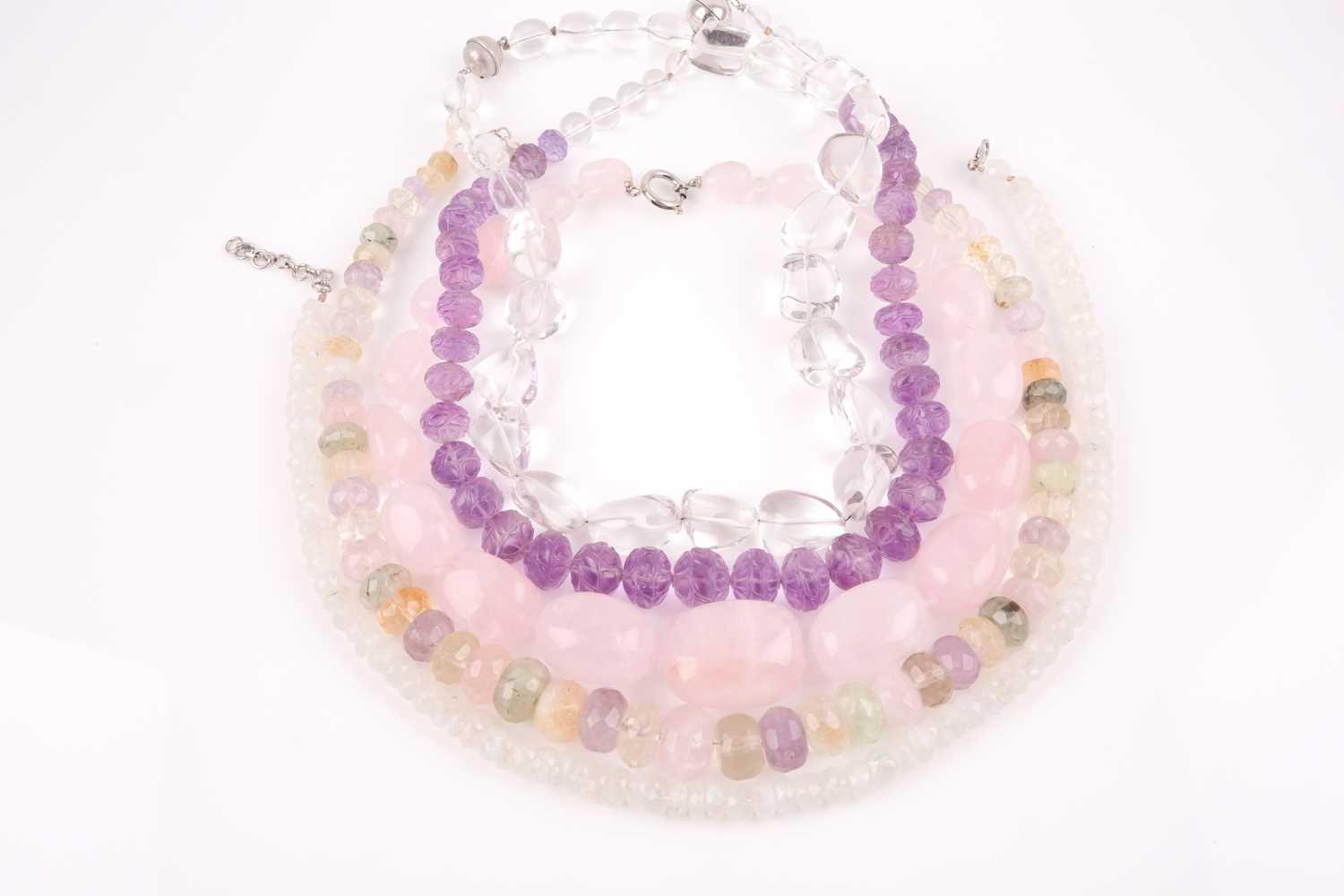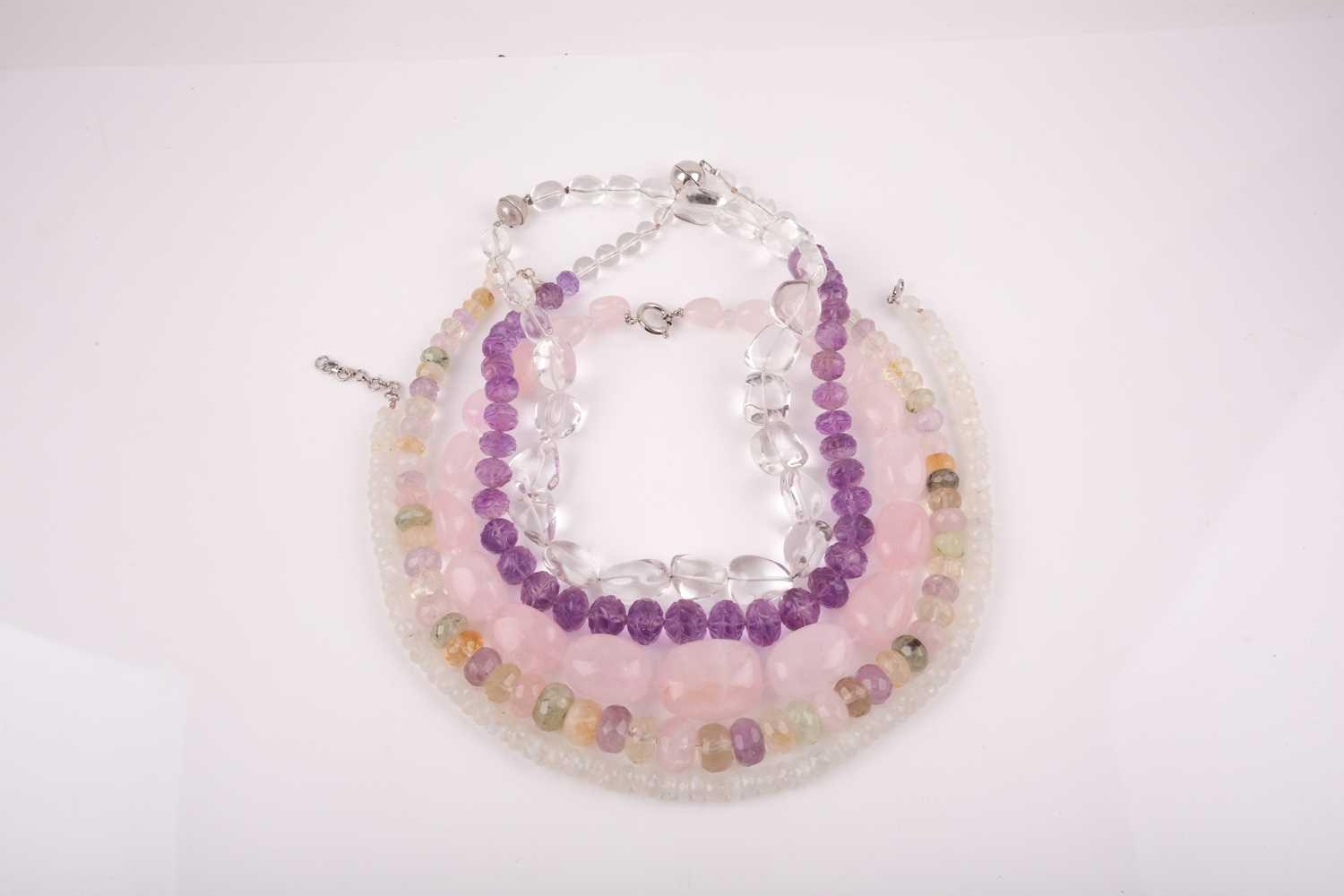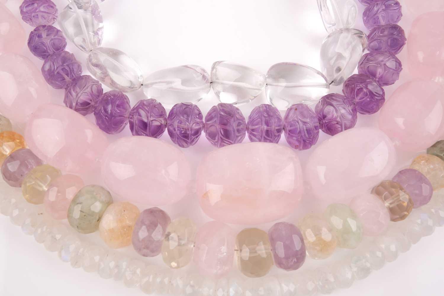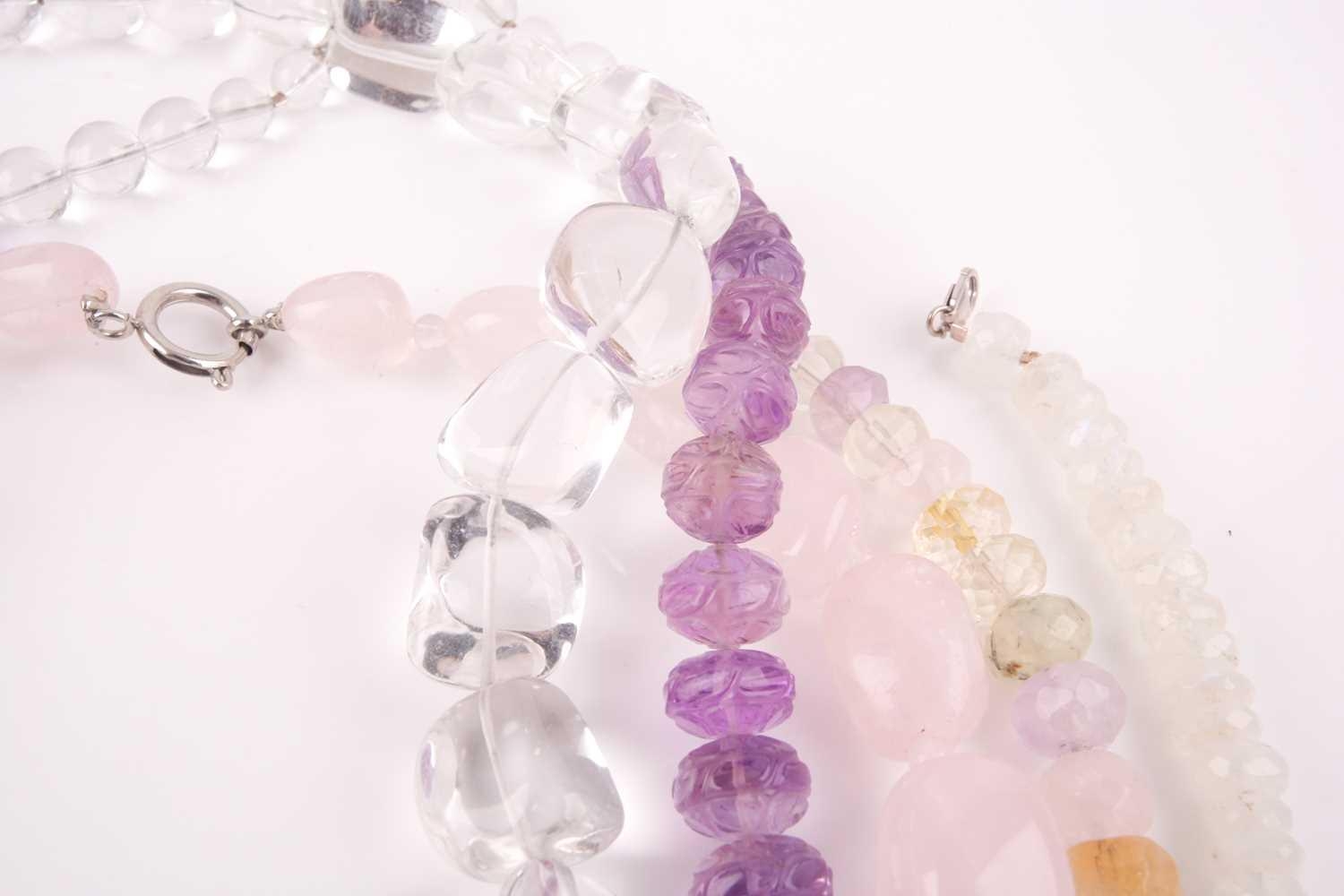 A chunky rose quartz beaded necklace, together with a faceted moonstone beaded necklace, a clear quartz necklace, a faceted amethyst bead and clear quarzt necklace, and a rose quartz, amethyst, citrine, and green quartz faceted beaded necklace. (5)