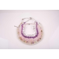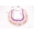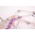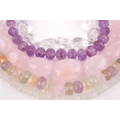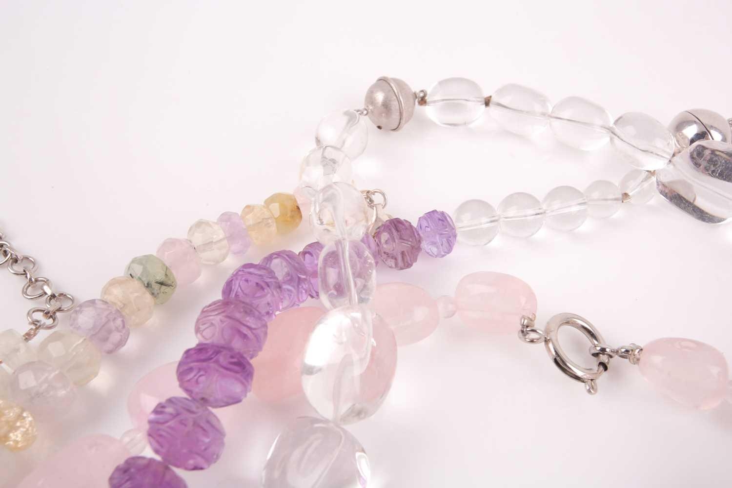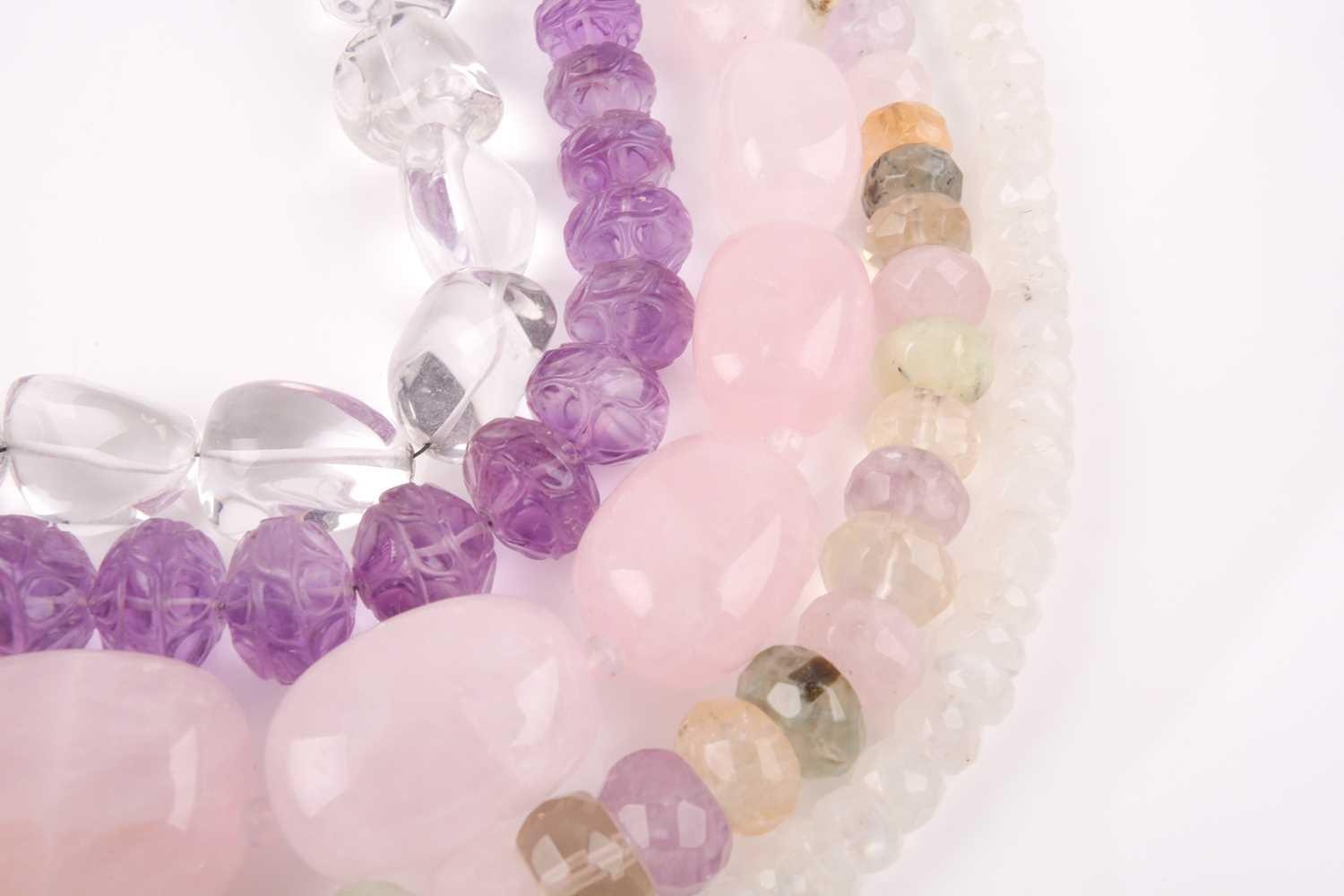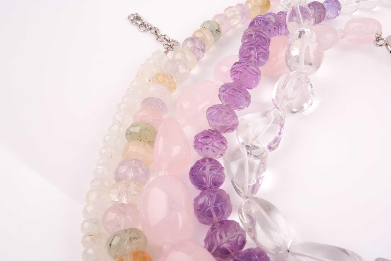 A chunky rose quartz beaded necklace, together with a faceted moonstone beaded necklace, a clear quartz necklace, a faceted amethyst bead and clear quarzt necklace, and a rose quartz, amethyst, citrine, and green quartz faceted beaded necklace. (5)