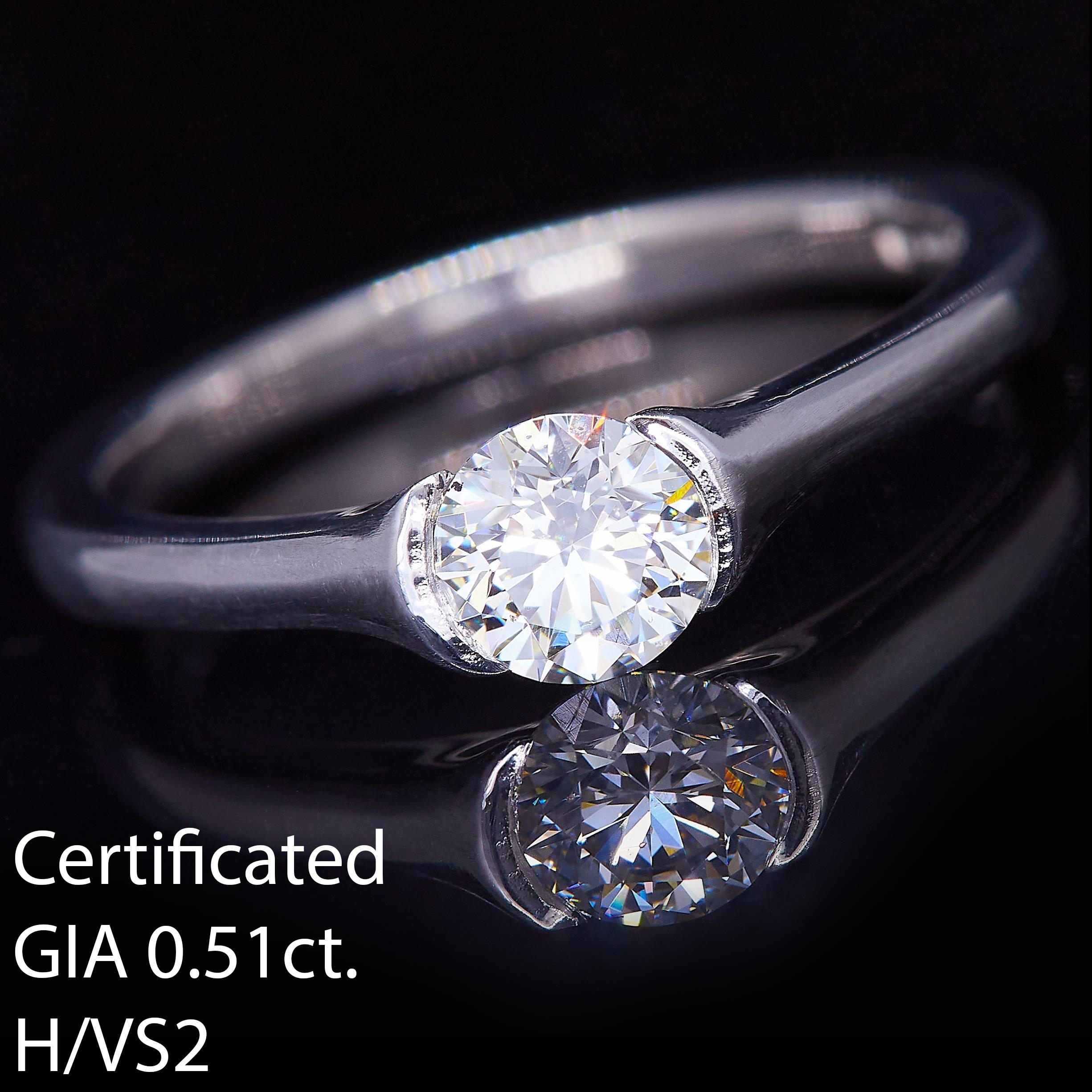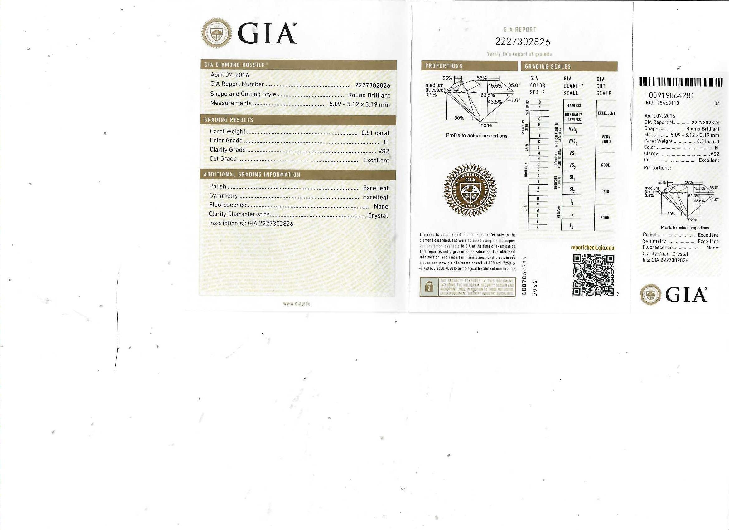 DIAMOND SOLITAIRE RING, in platinum. Set with a round brilliant cut diamond of 0.51 ct. Size M. 4.6 grams. Accompanied by GIA report No. 2227302826, stating that the 0.51 ct. diamond is H. Color, VS2 clarity. Excellent cut, None fluorescence.