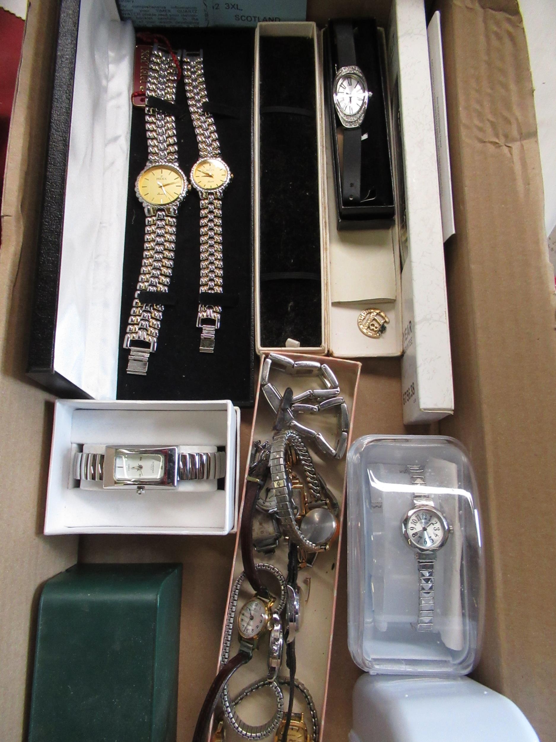 Pair of pelex ladies and gents quartz watches cased, other cased watches, gold plated and other ladies watches
