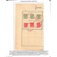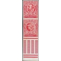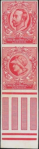 c.1911 De la Rue dummy stamps, imperforate se-tenant vertical pair in scarlet, upper stamp with KGV Downey Head and lower stamp with Minerva Head, lower margin with bars, unmounted mint (mounted in margin). A rare Downey Head trial from the sheet of 48, twelve of which had the KGV Head, which was made from a new die supplied by the Royal Mint to the Crown Agents and then sent on to De la Rue. The head on this dummy stamp is similar to the die 2 die proof with uncleared surround, reduced to fit into the dummy stamp frame. Photo on Page 22.