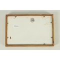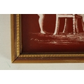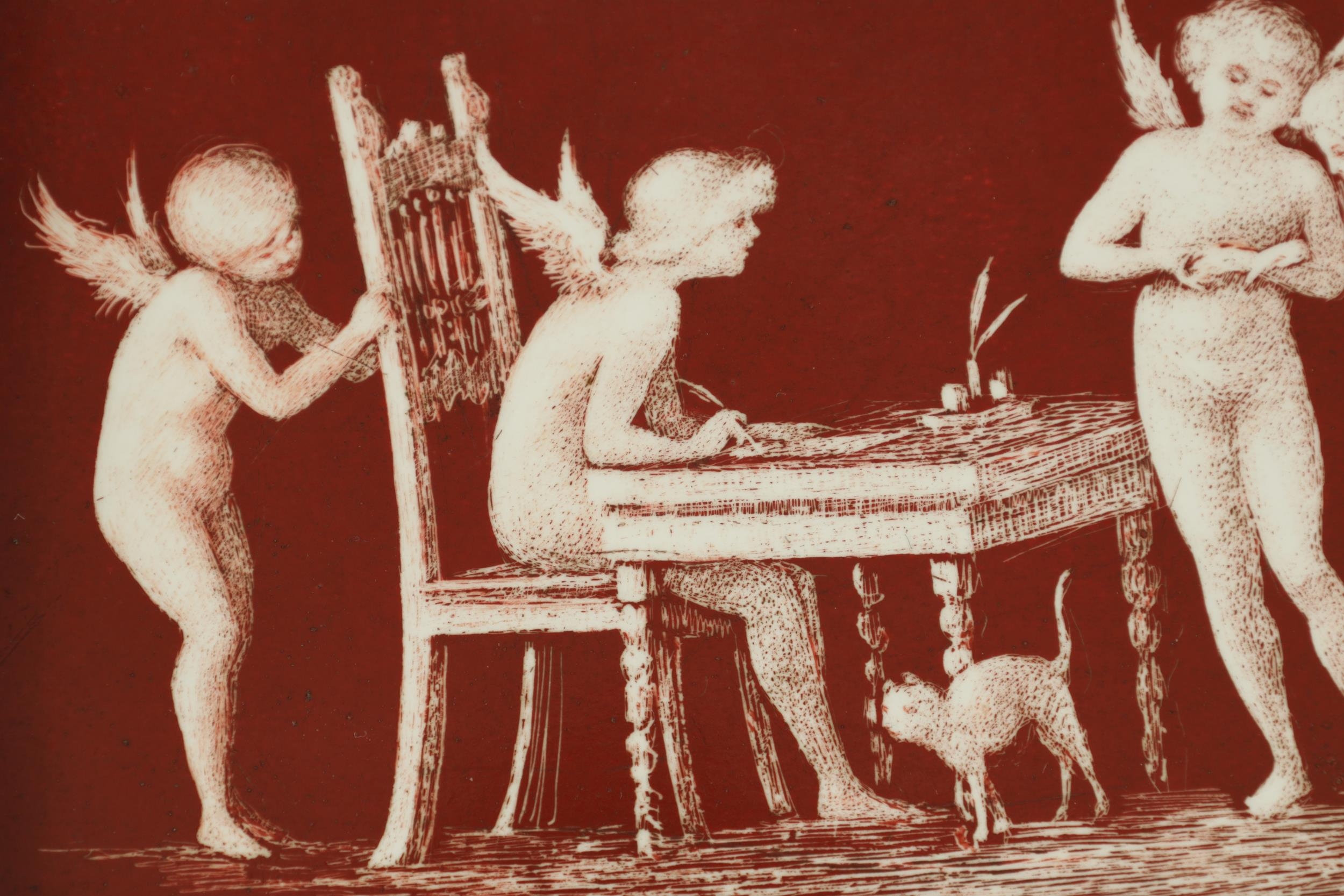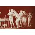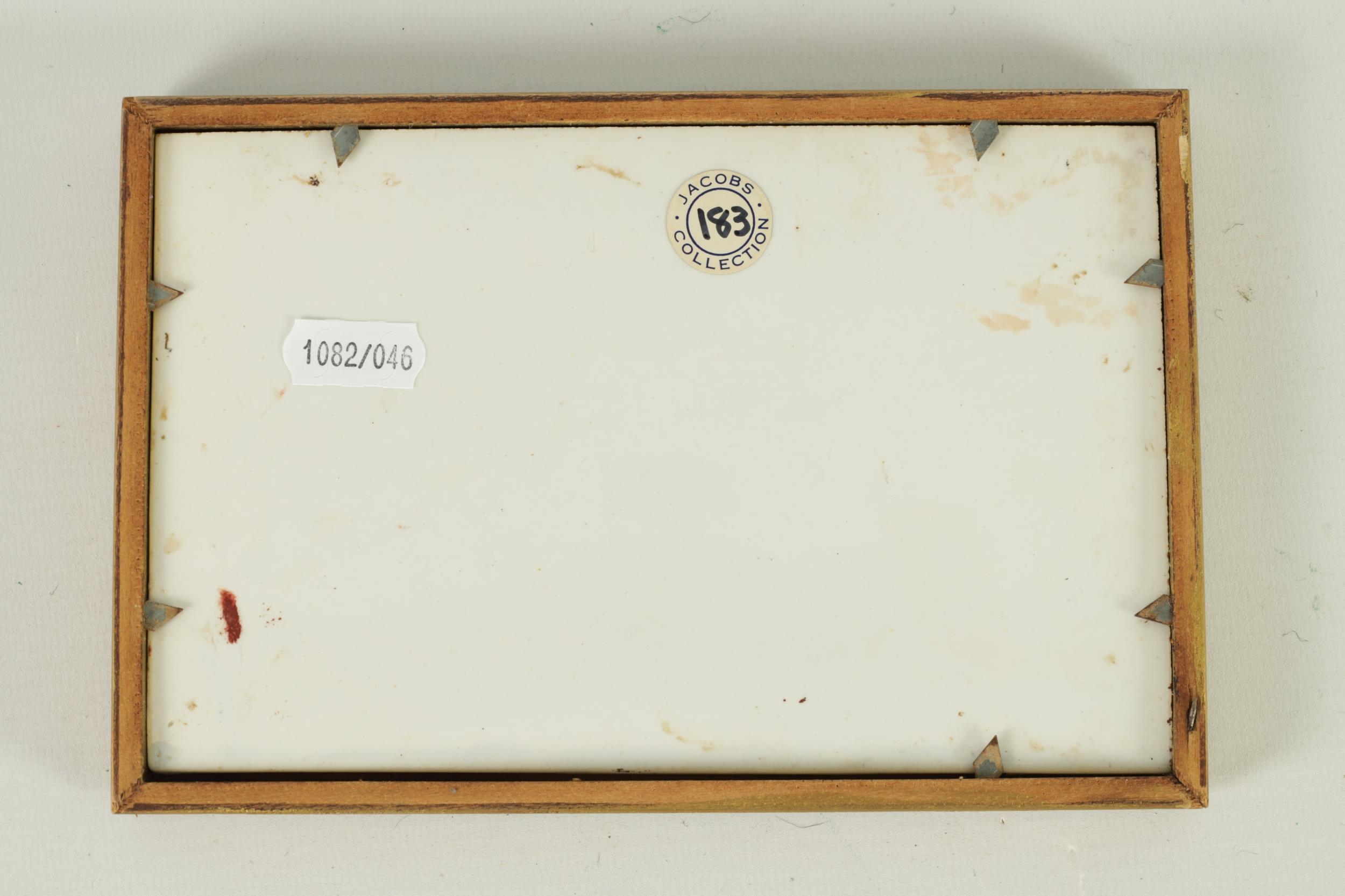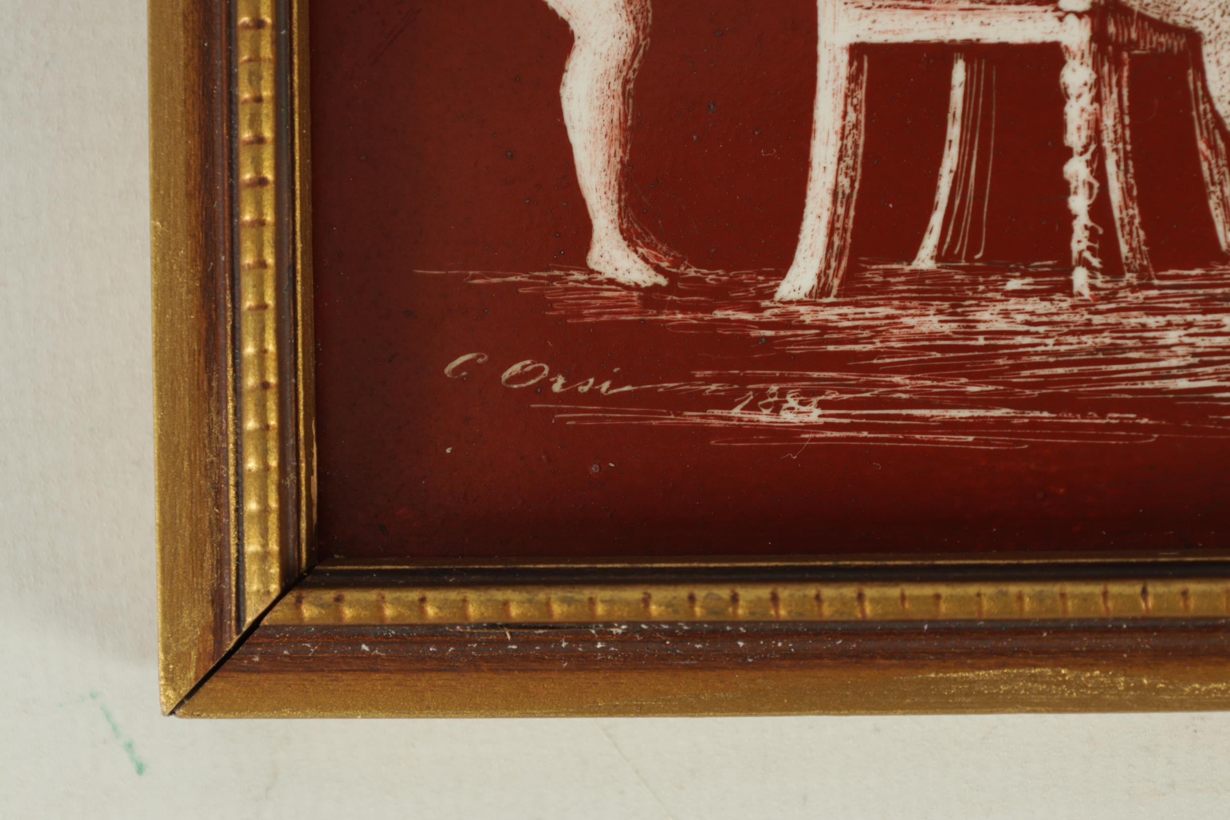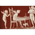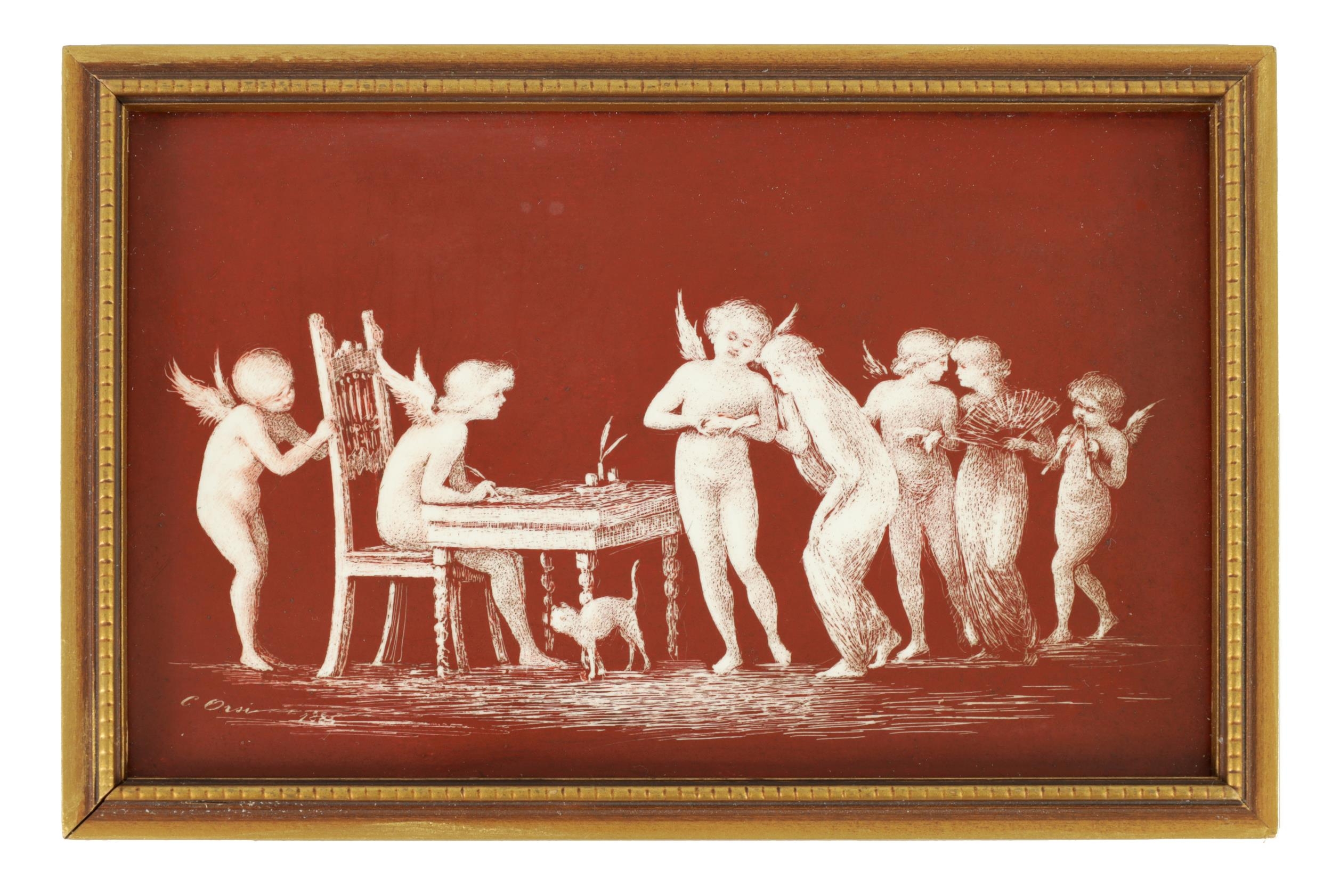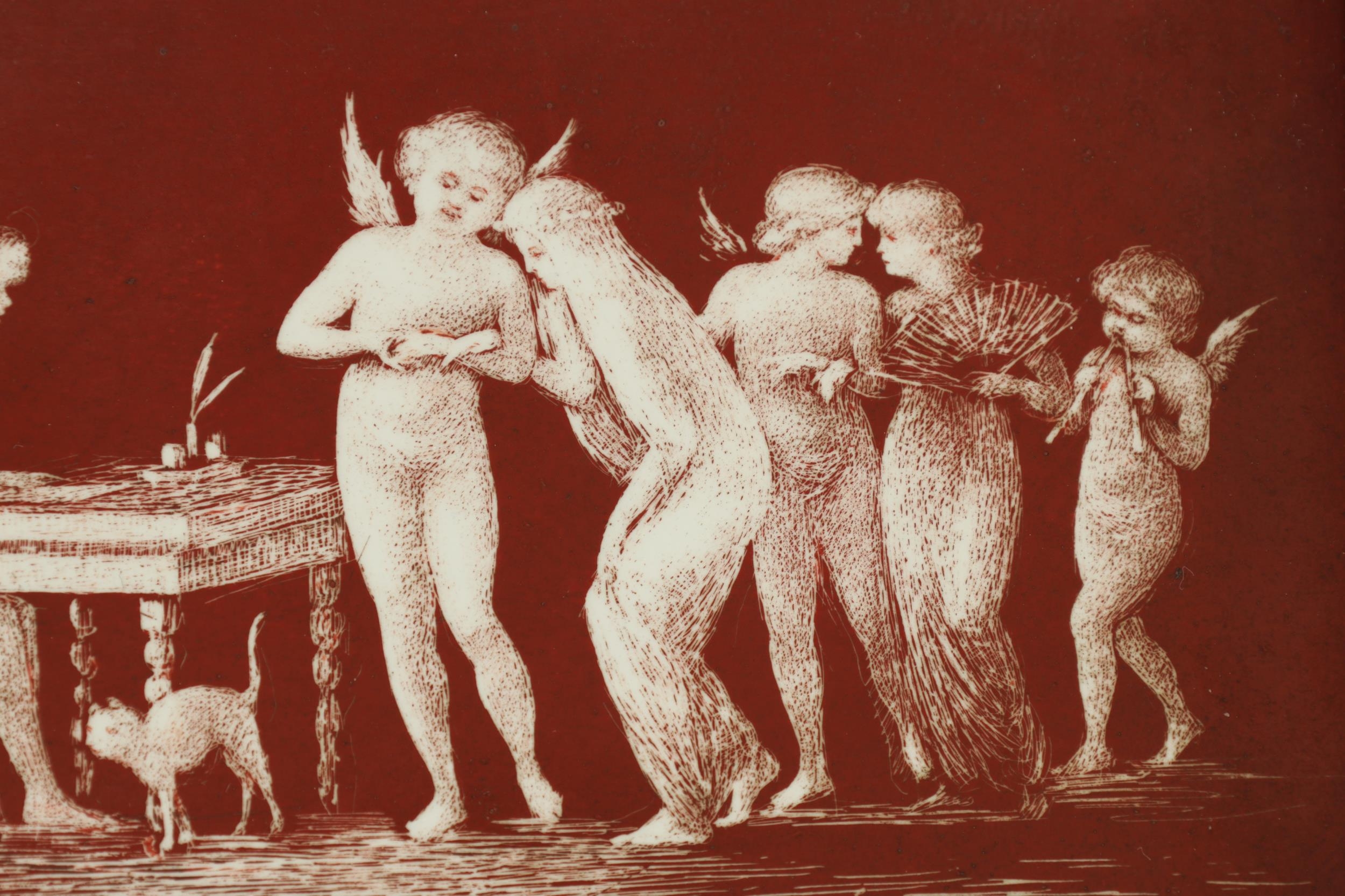 A 19TH CENTURY WEDGEWOOD TYPE TERRACOTTA GROUND PORCELAIN PLAQUE with blanc de chine figural decoration of Cupid and Psyche at a writing table - bears indistinct signature and date 1880 and labelled on reverse Jacobs collection - narrow gilt frame. (12cm high 18.5cm wide)
