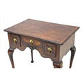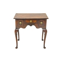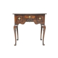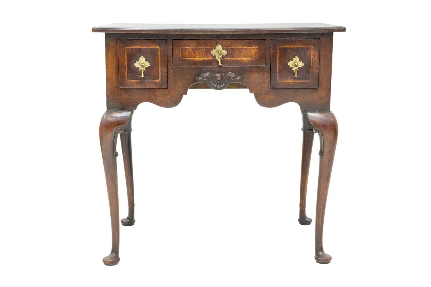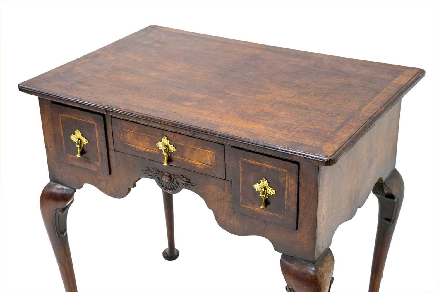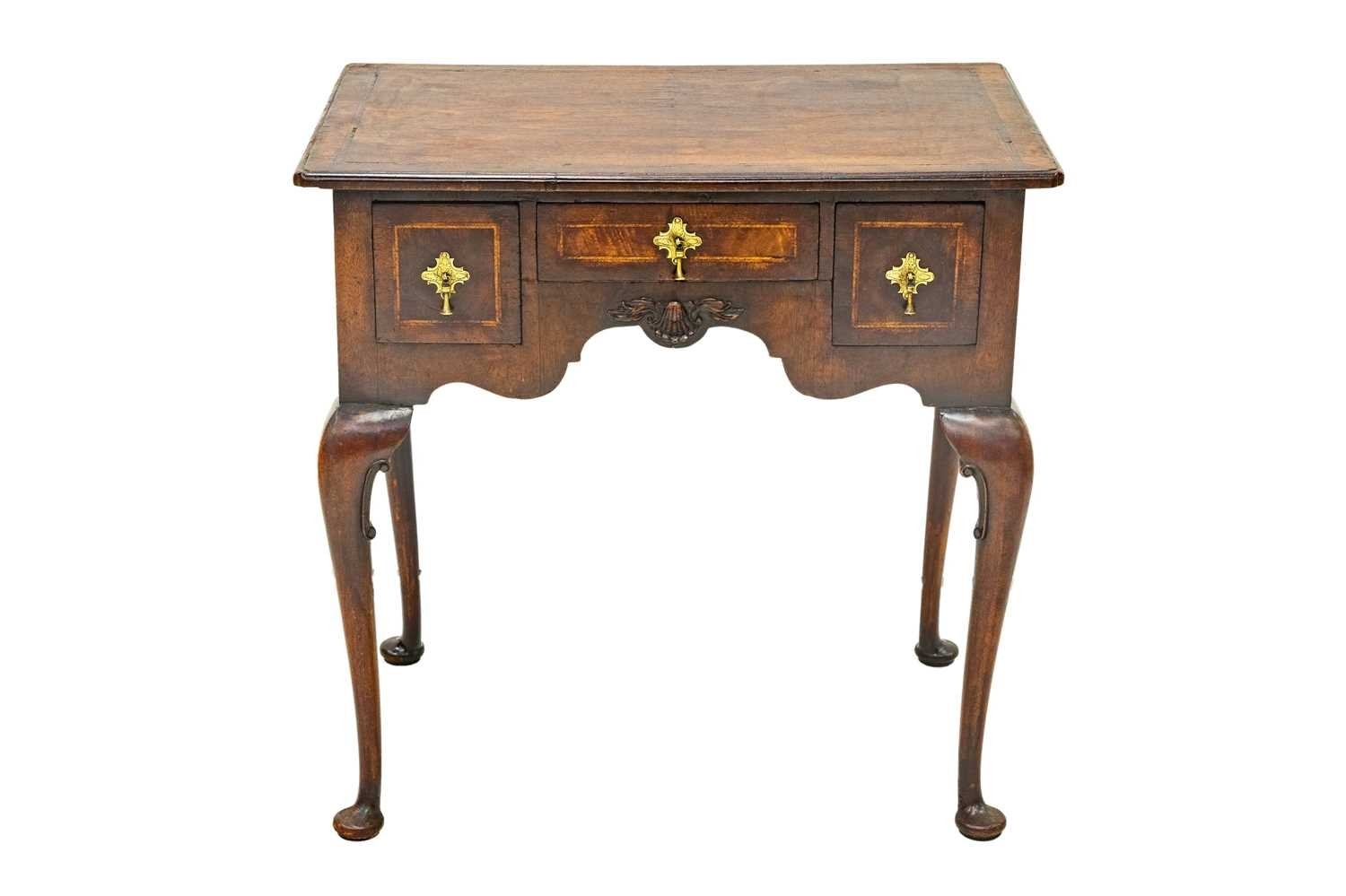 A George II style walnut lowboy. The herringbone banded top with re-entrant corners above a small central drawer and two deep drawers, the shaped kneehole with applied shell moulding and raised on cabriole legs with pad feet, height 75cm, width 76cm, depth 51.5cm.