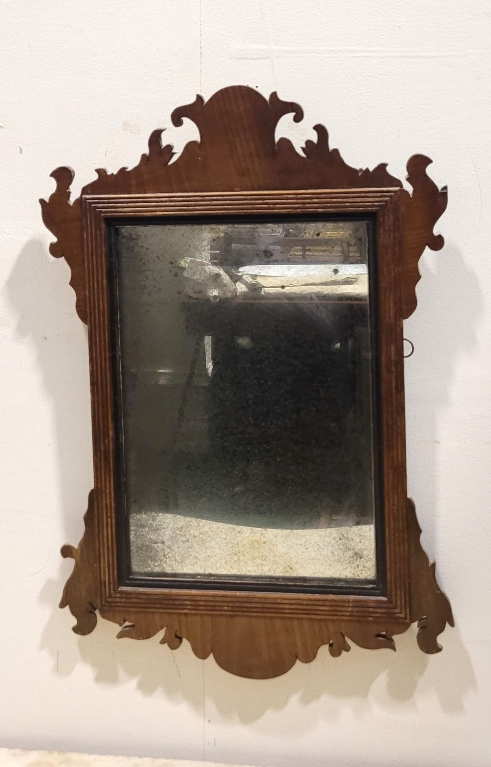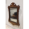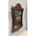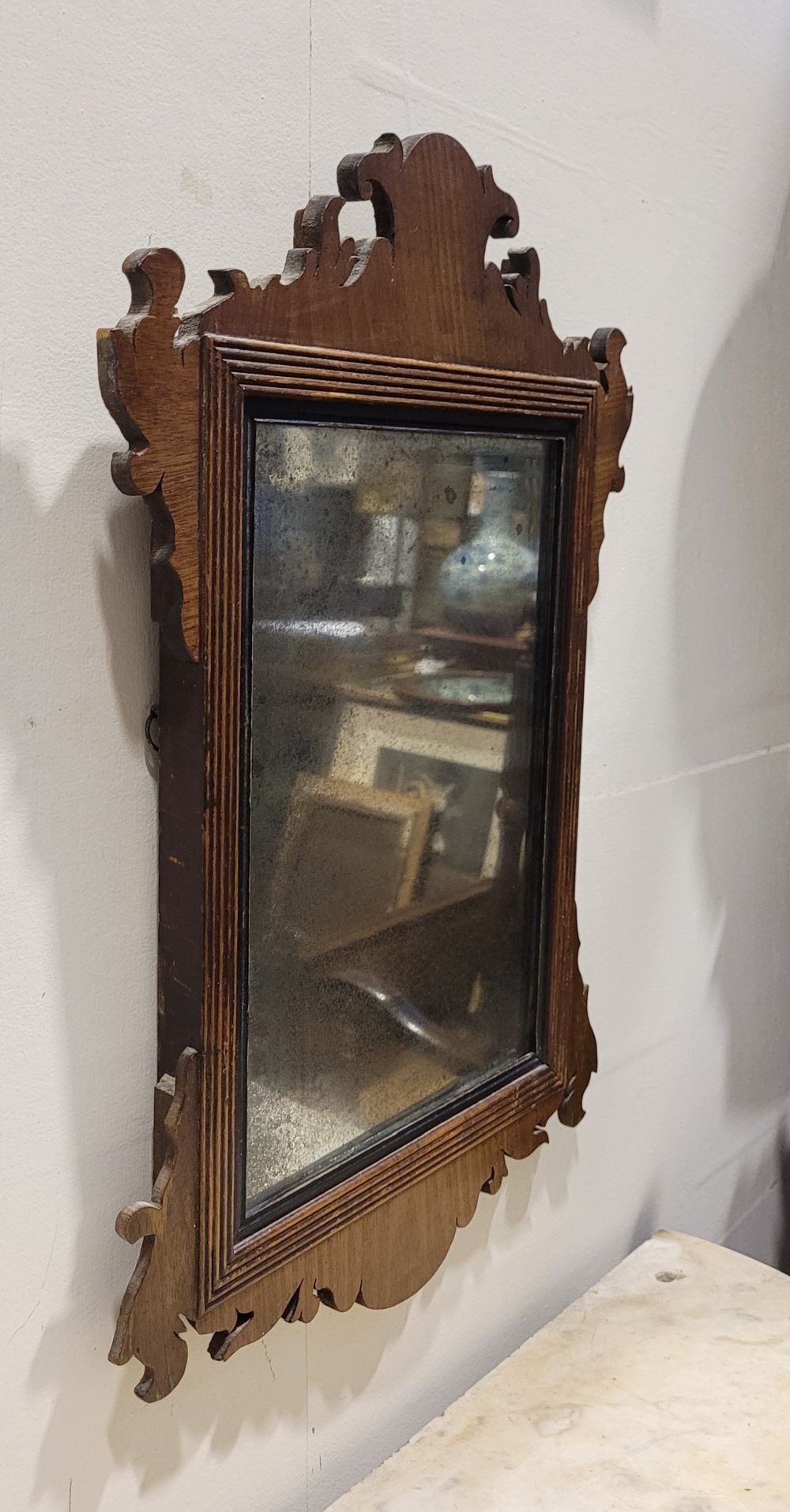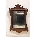 AN ANTIQUE NEATLY SIZED CHIPPENDALE STYLE WALL MIRROR, typical scrolling foliate design to the frame, with a reed slip surrounding the mirror pane. Dimensions: 53.5 x 36.5cm. (H x W).