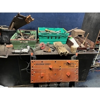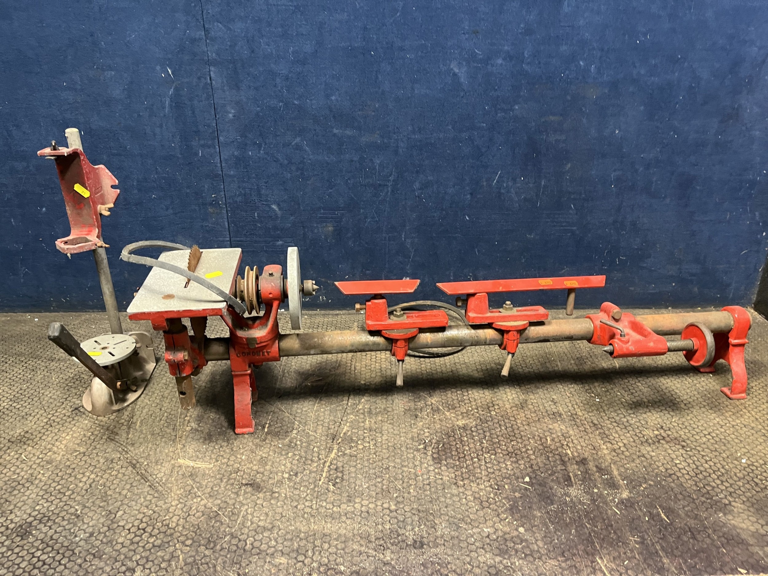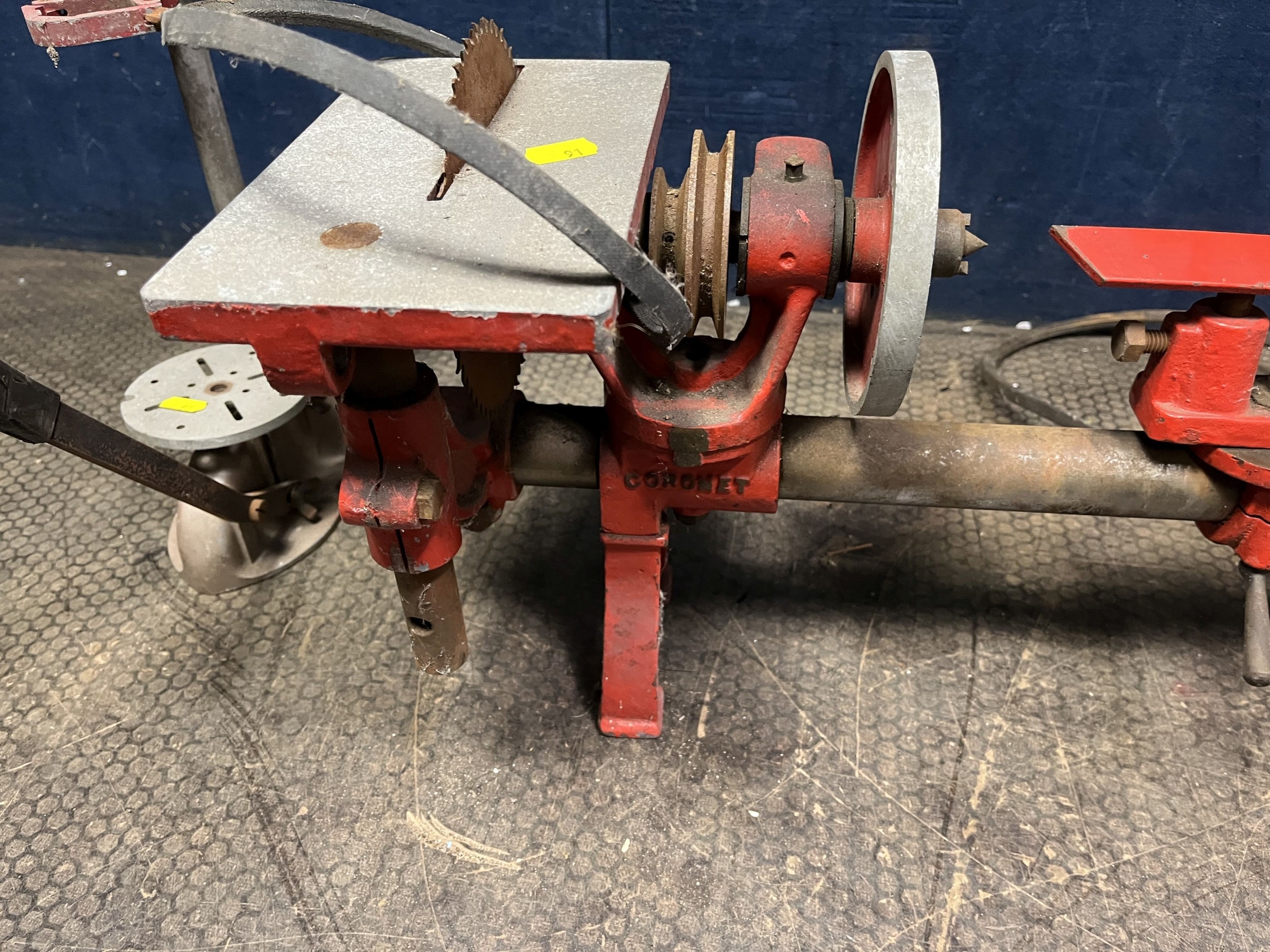 A VINTAGE CORONET LATHE with two tool rests and saw table, bed length 76cm and a drill stand (2)